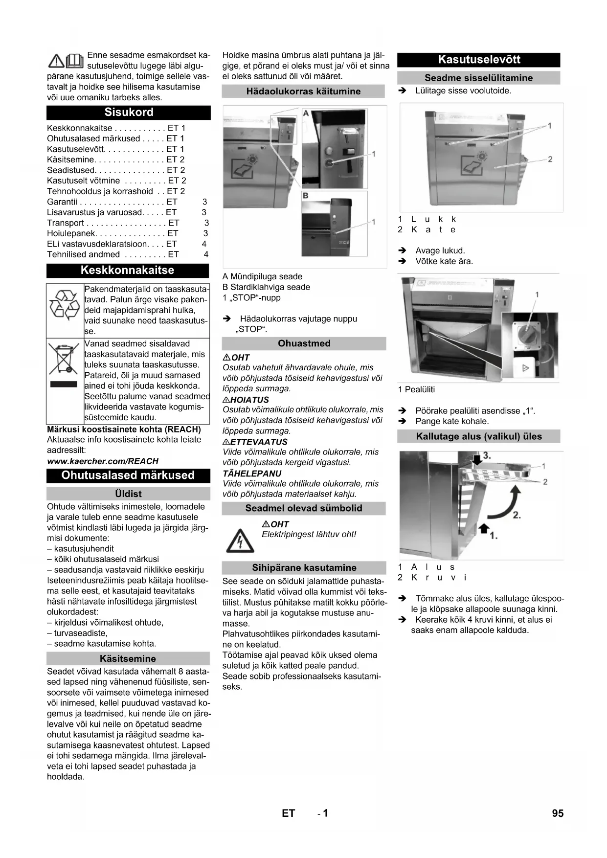 Дължина mm 1092 Широчина mm 531 Височина mm 1094 Тегло kg 70 94 BG- 1 Enne sesadme esmakordset ka- sutuselevõttu lugege läbi algu- pärane kasutusjuhend, toimige sellele vas- tavalt ja hoidke see hilisema kasutamise või uue omaniku tarbeks alles. Märkusi koostisainete kohta (REACH) Aktuaalse info koostisainete kohta leiate aadressilt: www.kaercher.com/REACH Ohtude vältimiseks inimestele, loomadele ja varale tuleb enne seadme kasutusele võtmist kindlasti läbi lugeda ja järgida järg- misi dokumente: – kasutusjuhendit – kõiki ohutusalaseid märkusi – seadusandja vastavaid riiklikke eeskirju Iseteenindusrežiimis peab käitaja hoolitse- ma selle eest, et kasutajaid teavitataks hästi nähtavate infosiltidega järgmistest olukordadest: – kirjeldusi võimalikest ohtude, – turvaseadiste, – seadme kasutamise kohta. Seadet võivad kasutada vähemalt 8 aasta- sed lapsed ning vähenenud füüsiliste, sen- soorsete või vaimsete võimetega inimesed või inimesed, kellel puuduvad vastavad ko- gemus ja teadmised, kui nende üle on järe- levalve või kui neile on õpetatud seadme ohutut kasutamist ja räägitud seadme ka- sutamisega kaasnevatest ohtutest. Lapsed ei tohi sedamega mängida. Ilma järeleval- veta ei tohi lapsed seadet puhastada ja hooldada. Hoidke masina ümbrus alati puhtana ja jäl- gige, et põrand ei oleks must ja/ või et sinna ei oleks sattunud õli või määret. A Mündipiluga seade B Stardiklahviga seade 1 „STOP“-nupp Hädaolukorras vajutage nuppu „STOP“. OHT Osutab vahetult ähvardavale ohule, mis võib põhjustada tõsiseid kehavigastusi või lõppeda surmaga. 몇 HOIATUS Osutab võimalikule ohtlikule olukorrale, mis võib põhjustada tõsiseid kehavigastusi või lõppeda surmaga. 몇 ETTEVAATUS Viide võimalikule ohtlikule olukorrale, mis võib põhjustada kergeid vigastusi. TÄHELEPANU Viide võimalikule ohtlikule olukorrale, mis võib põhjustada materiaalset kahju. See seade on sõiduki jalamattide puhasta- miseks. Matid võivad olla kummist või teks- tiilist. Mustus pühitakse matilt kokku pöörle- va harja abil ja kogutakse mustuse anu- masse. Plahvatusohtlikes piirkondades kasutami- ne on keelatud. Töötamise ajal peavad kõik uksed olema suletud ja kõik katted peale pandud. Seade sobib professionaalseks kasutami- seks. Lülitage sisse voolutoide. 1Lukk 2Kate Avage lukud. Võtke kate ära. 1 Pealüliti Pöörake pealüliti asendisse „1“. Pange kate kohale. 1Alus 2Kruvi Tõmmake alus üles, kallutage ülespoo- le ja klõpsake allapoole suunaga kinni. Keerake kõik 4 kruvi kinni, et alus ei saaks enam allapoole kalduda. Sisukord Keskkonnakaitse . . . . . . . . . . . ET 1 Ohutusalased märkused . . . . . ET 1 Kasutuselevõtt. . . . . . . . . . . . . ET 1 Käsitsemine. . . . . . . . . . . . . . . ET 2 Seadistused. . . . . . . . . . . . . . . ET 2 Kasutuselt võtmine . . . . . . . . . ET 2 Tehnohooldus ja korrashoid . . ET 2 Garantii . . . . . . . . . . . . . . . . . . ET 3 Lisavarustus ja varuosad. . . . . ET 3 Transport . . . . . . . . . . . . . . . . . ET 3 Hoiulepanek. . . . . . . . . . . . . . . ET 3 ELi vastavusdeklaratsioon. . . . ET 4 Tehnilised andmed . . . . . . . . . ET 4 Keskkonnakaitse Pakendmaterjalid on taaskasuta- tavad. Palun ärge visake paken- deid majapidamisprahi hulka, vaid suunake need taaskasutus- se. Vanad seadmed sisaldavad taaskasutatavaid materjale, mis tuleks suunata taaskasutusse. Patareid, õli ja muud sarnased ained ei tohi jõuda keskkonda. Seetõttu palume vanad seadmed likvideerida vastavate kogumis- süsteemide kaudu. Ohutusalased märkused Üldist Käsitsemine Hädaolukorras käitumine Ohuastmed Seadmel olevad sümbolid OHT Elektripingest lähtuv oht! Sihipärane kasutamine Kasutuselevõtt Seadme sisselülitamine Kallutage alus (valikul) üles 95ET- 2 A Mündipiluga seade B Stardiklahviga seade 1 Mündi sisestamine 2 Märgutuli 3 Münditagastus 4 Stardiklahv 5 Mati sisestamine 6 Mati väljastamine Märkus: Kui te mati lahti lasete, liigub see seadmes- se ja väljastatakse mati väljastamise kau- du. Märkus: Seadistatav töötamise aeg kehtib järgmiste müntide sisestamisel: – 50 eurosenti – 50 Briti penni – 1 Šveitsi frank – 1 Poola zlott – 5 Norra krooni Võtke kaas maha (vt „Hooldus ja hool- dustööd/ Kaane mahavõtmine“). 1„PRG“ nupp 2LED 3 3LED 1 4 „P1“ nupp 5 Juhtimine Vajutage nupp „PRG“ ja hoidke seda all, kuni süttib LED 3. Töörežiimi seadistamine on aktiveeri- tud. Märkus: Töörežiimi seadistus lõppeb, kui 10 sekun- di jooksul ei ole ühtegi nuppu vajutatud. Seadistus hakkab tööle tööajaga 0 sekun- dit. Maksimaalne tööaeg on 10 minutit. Kui see seadistus on saavutatud, hakkab LED 1 kii- resti vilkuma. Vajutage korraks nuppu „P1“. LED 1 hakkab kiiresti vilkuma ja tööaeg pikeneb 5 sekundi võrra. Vajutage pikalt nuppu „P1“. LED 1 vilgub aeglaselt ja tööaeg pike- neb 30 sekundi võrra. Soovitud tööaega saab seadistada va- jutades korduvalt nupule „P1“. Seadistatud tööaja kinnitamiseks vaju- tage nuppu „PRG“, kuni LED 3 hakkab kiiresti vilkuma: Tööaeg on salvestatud. Pange pealüliti asendisse „0“. OHT Vigastuste oht tahtmatult tööle hakanud seadme ja elektrilöögi tõttu. Enne mistahes hooldustöödega alusta- mist peab pealüliti pöörama asendisse „0“ ja kindlustama seadme selle taas- käivitumise vastu. Mündipiluga seadme korral: Tühjenda- ge mündikassett (vt „Hooldustööd“). Tühjendage mustusekogumise anum (vt „Hooldustööd“). Kontrollige seadme üldist seisukorda. Vahetage kahjustatud osad välja. Eemaldage mustus mati väljastusest. Puhastage masin. Määrige lukkusid roomava õliga (Ca- ramba, WD 40). Vahetage hari (vt „Hooldustööd“). 1Uks 2Lukk 3 Mündisahtel Avage uks. Tõmmake mündisahtel välja ja tühjen- dage. 1Lukk 2Kate Avage lukud. Võtke kate ära. Eemaldage eesmine kate (vt ülal). 1 Mustusemahuti (ei sisaldu tarnekomplektis) Võtke mustuse anum vä