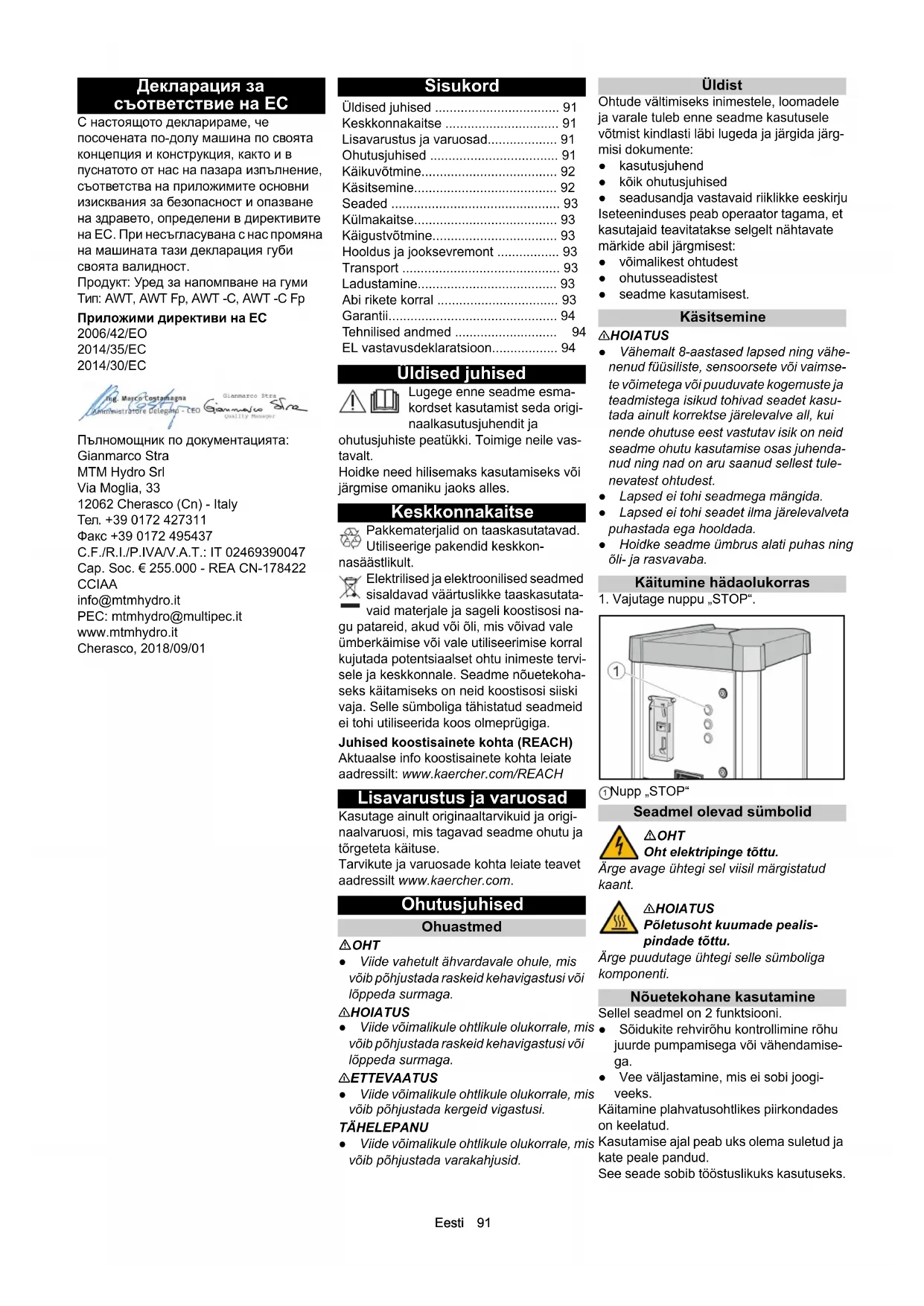 : Уред за напомпване на гуми Тип: AWT, AWT Fp, AWT -C, AWT -C Fp Приложими директиви на ЕС 2006/42/EО 2014/35/ЕС 2014/30/ЕС Пълномощник по документацията: Gianmarco Stra MTM Hydro Srl Via Moglia, 33 12062 Cherasco (Cn) - Italy Тел. +39 0172 427311 Факс +39 0172 495437 C.F./R.I./P.IVA/V.A.T.: IT 02469390047 Cap. Soc. € 255.000 - REA CN-178422 CCIAA info@mtmhydro.it PEC: mtmhydro@multipec.it www.mtmhydro.it Cherasco, 2018/09/01 Sisukord Üldised juhised Lugege enne seadme esma- kordset kasutamist seda origi- naalkasutusjuhendit ja ohutusjuhiste peatükki. Toimige neile vas- tavalt. Hoidke need hilisemaks kasutamiseks või järgmise omaniku jaoks alles. Keskkonnakaitse Pakkematerjalid on taaskasutatavad. Utiliseerige pakendid keskkon- nasäästlikult. Elektrilised ja elektroonilised seadmed sisaldavad väärtuslikke taaskasutata- vaid materjale ja sageli koostisosi na- gu patareid, akud või õli, mis võivad vale ümberkäimise või vale utiliseerimise korral kujutada potentsiaalset ohtu inimeste tervi- sele ja keskkonnale. Seadme nõuetekoha- seks käitamiseks on neid koostisosi siiski vaja. Selle sümboliga tähistatud seadmeid ei tohi utiliseerida koos olmeprügiga. Juhised koostisainete kohta (REACH) Aktuaalse info koostisainete kohta leiate aadressilt: www.kaercher.com/REACH Lisavarustus ja varuosad Kasutage ainult originaaltarvikuid ja origi- naalvaruosi, mis tagavad seadme ohutu ja tõrgeteta käituse. Tarvikute ja varuosade kohta leiate teavet aadressilt www.kaercher.com. Ohutusjuhised Ohuastmed OHT ● Viide vahetult ähvardavale ohule, mis võib põhjustada raskeid kehavigastusi või lõppeda surmaga. 몇 HOIATUS ● Viide võimalikule ohtlikule olukorrale, mis võib põhjustada raskeid kehavigastusi või lõppeda surmaga. 몇 ETTEVAATUS ● Viide võimalikule ohtlikule olukorrale, mis võib põhjustada kergeid vigastusi. TÄHELEPANU ● Viide võimalikule ohtlikule olukorrale, mis võib põhjustada varakahjusid. Üldist Ohtude vältimiseks inimestele, loomadele ja varale tuleb enne seadme kasutusele võtmist kindlasti läbi lugeda ja järgida järg- misi dokumente: ● kasutusjuhend ● kõik ohutusjuhised ● seadusandja vastavaid riiklikke eeskirju Iseteeninduses peab operaator tagama, et kasutajaid teavitatakse selgelt nähtavate märkide abil järgmisest: ● võimalikest ohtudest ● ohutusseadistest ● seadme kasutamisest. Käsitsemine 몇 HOIATUS ● Vähemalt 8-aastased lapsed ning vähe- nenud füüsiliste, sensoorsete või vaimse- te võimetega või puuduvate kogemuste ja teadmistega isikud tohivad seadet kasu- tada ainult korrektse järelevalve all, kui nende ohutuse eest vastutav isik on neid seadme ohutu kasutamise osas juhenda- nud ning nad on aru saanud sellest tule- nevatest ohtudest. ● Lapsed ei tohi seadmega mängida. ● Lapsed ei tohi seadet ilma järelevalveta puhastada ega hooldada. ● Hoidke seadme ümbrus alati puhas ning õli- ja rasvavaba. Käitumine hädaolukorras