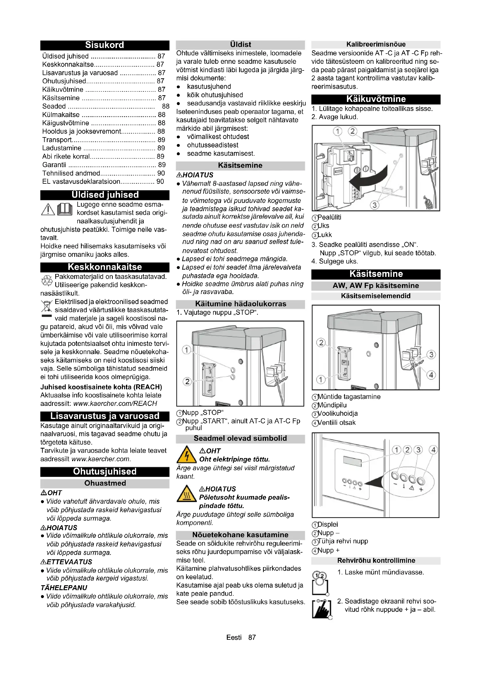 1 Nupp „STOP“ 2 Nupp „START“, ainult AT-C ja AT-C Fp puhul Seadmel olevad sümbolid OHT Oht elektripinge tõttu. Ärge avage ühtegi sel viisil märgistatud kaant. 몇HOIATUS Põletusoht kuumade pealis- pindade tõttu. Ärge puudutage ühtegi selle sümboliga komponenti. Nõuetekohane kasutamine Seade on sõidukite rehvirõhu reguleerimi- seks rõhu juurdepumpamise või väljalask- mise teel. Käitamine plahvatusohtlikes piirkondades on keelatud. Kasutamise ajal peab uks olema suletud ja kate peale pandud. See seade sobib tööstuslikuks kasutuseks. Kalibreerimisnõue Seadme versioonide AT -C ja AT -C Fp reh- vide täitesüsteem on kalibreeritud ning se- da peab pärast paigaldamist ja seejärel iga 2 aasta tagant kontrollima vastutav kalib- reerimisasutus. Käikuvõtmine