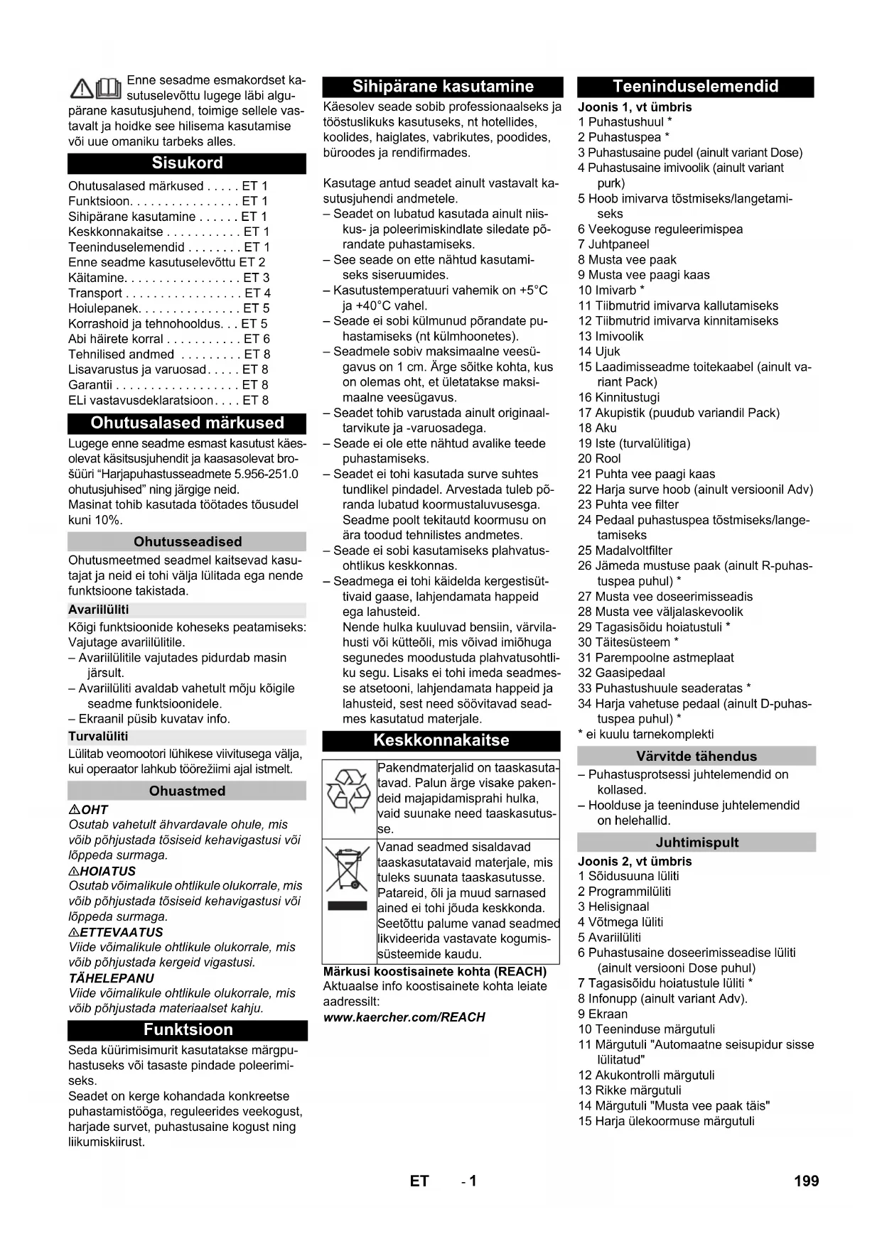 Chairman of the Board of Management Director Regulatory Affairs & Certification 198 BG- 1 Enne sesadme esmakordset ka- sutuselevõttu lugege läbi algu- pärane kasutusjuhend, toimige sellele vas- tavalt ja hoidke see hilisema kasutamise või uue omaniku tarbeks alles. Lugege enne seadme esmast kasutust käes- olevat käsitsusjuhendit ja kaasasolevat bro- šüüri “Harjapuhastusseadmete 5.956-251.0 ohutusjuhised” ning järgige neid. Masinat tohib kasutada töötades tõusudel kuni 10%. Ohutusmeetmed seadmel kaitsevad kasu- tajat ja neid ei tohi välja lülitada ega nende funktsioone takistada. Kõigi funktsioonide koheseks peatamiseks: Vajutage avariilülitile. – Avariilülitile vajutades pidurdab masin järsult. – Avariilüliti avaldab vahetult mõju kõigile seadme funktsioonidele. – Ekraanil püsib kuvatav info. Lülitab veomootori lühikese viivitusega välja, kui operaator lahkub töörežiimi ajal istmelt. OHT Osutab vahetult ähvardavale ohule, mis võib põhjustada tõsiseid kehavigastusi või lõppeda surmaga. 몇 HOIATUS Osutab võimalikule ohtlikule olukorrale, mis võib põhjustada tõsiseid kehavigastusi või lõppeda surmaga. 몇 ETTEVAATUS Viide võimalikule ohtlikule olukorrale, mis võib põhjustada kergeid vigastusi. TÄHELEPANU Viide võimalikule ohtlikule olukorrale, mis võib põhjustada materiaalset kahju. Seda küürimisimurit kasutatakse märgpu- hastuseks või tasaste pindade poleerimi- seks. Seadet on kerge kohandada konkreetse puhastamistööga, reguleerides veekogust, harjade survet, puhastusaine kogust ning liikumiskiirust. Käesolev seade sobib professionaalseks ja tööstuslikuks kasutuseks, nt hotellides, koolides, haiglates, vabrikutes, poodides, büroodes ja rendifirmades. Kasutage antud seadet ainult vastavalt ka- sutusjuhendi andmetele. – Seadet on lubatud kasutada ainult niis- kus- ja poleerimiskindlate siledate põ- randate puhastamiseks. – See seade on ette nähtud kasutami- seks siseruumides. – Kasutustemperatuuri vahemik on +5°C ja +40°C vahel. – Seade ei sobi külmunud põrandate pu- hastamiseks (nt külmhoonetes). – Seadmele sobiv maksimaalne veesü- gavus on 1 cm. Ärge sõitke kohta, kus on olemas oht, et ületatakse maksi- maalne veesügavus. – Seadet tohib varustada ainult originaal- tarvikute ja -varuosadega. – Seade ei ole ette nähtud avalike teede puhastamiseks. – Seadet ei tohi kasutada surve suhtes tundlikel pindadel. Arvestada tuleb põ- randa lubatud koormustaluvusesga. Seadme poolt tekitautd koormusu on ära toodud tehnilistes andmetes. – Seade ei sobi kasutamiseks plahvatus- ohtlikus keskkonnas. – Seadmega ei tohi käidelda kergestisüt- tivaid gaase, lahjendamata happeid ega lahusteid. Nende hulka kuuluvad bensiin, värvila- husti või kütteõli, mis võivad imiõhuga segunedes moodustuda plahvatusohtli- ku segu. Lisaks ei tohi imeda seadmes- se atsetooni, lahjendamata happeid ja lahusteid, sest need söövitavad sead- mes kasutatud materjale. Märkusi koostisainete kohta (REACH) Aktuaalse info koostisainete kohta leiate aadressilt: www.kaercher.com/REACH Joonis 1, vt ümbris 1 Puhastushuul * 2 Puhastuspea * 3 Puhastusaine pudel (ainult variant Dose) 4 Puhastusaine imivoolik (ainult variant purk) 5 Hoob imivarva tõstmiseks/langetami- seks 6 Veekoguse reguleerimispea 7 Juhtpaneel 8 Musta vee paak 9 Musta vee paagi kaas 10 Imivarb * 11 Tiibmutrid imivarva kallutamiseks 12 Tiibmutrid imivarva kinnitamiseks 13 Imivoolik 14 Ujuk 15 Laadimisseadme toitekaabel (ainult va- riant Pack) 16 Kinnitustugi 17 Akupistik (puudub variandil Pack) 18 Aku 19 Iste (turvalülitiga) 20 Rool 21 Puhta vee paagi kaas 22 Harja surve hoob (ainult versioonil Adv) 23 Puhta vee filter 24 Pedaal puhastuspea tõstmiseks/lange- tamiseks 25 Madalvoltfilter 26 Jämeda mustuse paak (ainult R-puhas- tuspea puhul) * 27 Musta vee doseerimisseadis 28 Musta vee väljalaskevoolik 29 Tagasisõidu hoiatustuli * 30 Täitesüsteem * 31 Parempoolne astmeplaat 32 Gaasipedaal 33 Puhastushuule seaderatas * 34 Harja vahetuse pedaal (ainult D-puhas- tuspea puhul) *