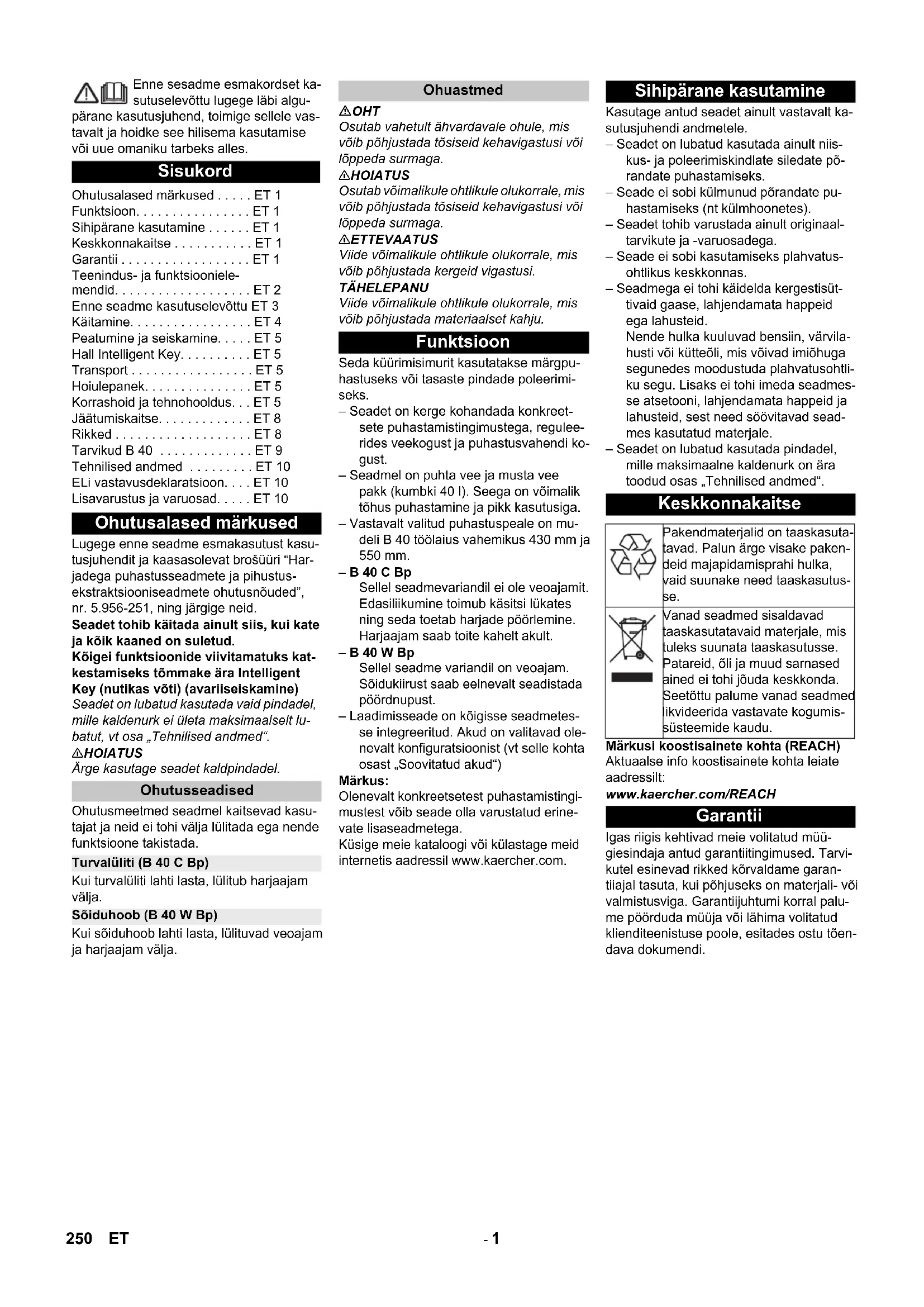 Chairman of the Board of Management Director Regulatory Affairs & Certification Принадлежности и резервни части 249BG- 1 Enne sesadme esmakordset ka- sutuselevõttu lugege läbi algu- pärane kasutusjuhend, toimige sellele vas- tavalt ja hoidke see hilisema kasutamise või uue omaniku tarbeks alles. Lugege enne seadme esmakasutust kasu- tusjuhendit ja kaasasolevat brošüüri “Har- jadega puhastusseadmete ja pihustus- ekstraktsiooniseadmete ohutusnõuded”, nr. 5.956-251, ning järgige neid. Seadet tohib käitada ainult siis, kui kate ja kõik kaaned on suletud. Kõigei funktsioonide viivitamatuks kat- kestamiseks tõmmake ära Intelligent Key (nutikas võti) (avariiseiskamine) Seadet on lubatud kasutada vaid pindadel, mille kaldenurk ei ületa maksimaalselt lu- batut, vt osa „Tehnilised andmed“. 몇 HOIATUS Ärge kasutage seadet kaldpindadel. Ohutusmeetmed seadmel kaitsevad kasu- tajat ja neid ei tohi välja lülitada ega nende funktsioone takistada. Kui turvalüliti lahti lasta, lülitub harjaajam välja. Kui sõiduhoob lahti lasta, lülituvad veoajam ja harjaajam välja. OHT Osutab vahetult ähvardavale ohule, mis võib põhjustada tõsiseid kehavigastusi või lõppeda surmaga. 몇 HOIATUS Osutab võimalikule ohtlikule olukorrale, mis võib põhjustada tõsiseid kehavigastusi või lõppeda surmaga. 몇 ETTEVAATUS Viide võimalikule ohtlikule olukorrale, mis võib põhjustada kergeid vigastusi. TÄHELEPANU Viide võimalikule ohtlikule olukorrale, mis võib põhjustada materiaalset kahju. Seda küürimisimurit kasutatakse märgpu- hastuseks või tasaste pindade poleerimi- seks. – Seadet on kerge kohandada konkreet- sete puhastamistingimustega, regulee- rides veekogust ja puhastusvahendi ko- gust. – Seadmel on puhta vee ja musta vee pakk (kumbki 40 l). Seega on võimalik tõhus puhastamine ja pikk kasutusiga. – Vastavalt valitud puhastuspeale on mu- deli B 40 töölaius vahemikus 430 mm ja 550 mm. – B 40 C Bp Sellel seadmevariandil ei ole veoajamit. Edasiliikumine toimub käsitsi lükates ning seda toetab harjade pöörlemine. Harjaajam saab toite kahelt akult. – B 40 W Bp Sellel seadme variandil on veoajam. Sõidukiirust saab eelnevalt seadistada pöördnupust. – Laadimisseade on kõigisse seadmetes- se integreeritud. Akud on valitavad ole- nevalt konfiguratsioonist (vt selle kohta osast „Soovitatud akud“) Märkus: Olenevalt konkreetsetest puhastamistingi- mustest võib seade olla varustatud erine- vate lisaseadmetega. Küsige meie kataloogi või külastage meid internetis aadressil www.kaercher.com. Kasutage antud seadet ainult vastavalt ka- sutusjuhendi andmetele. – Seadet on lubatud kasutada ainult niis- kus- ja poleerimiskindlate siledate põ- randate puhastamiseks. – Seade ei sobi külmunud põrandate pu- hastamiseks (nt külmhoonetes). – Seadet tohib varustada ainult originaal- tarvikute ja -varuosadega. – Seade ei sobi kasutamiseks plahvatus- ohtlikus keskkonnas. – Seadmega ei tohi käidelda kergestisüt- tivaid gaase, lahjendamata happeid ega lahusteid. Nende hulka kuuluvad bensiin, värvila- husti või kütteõli, mis võivad imiõhuga segunedes moodustuda plahvatusohtli- ku segu. Lisaks ei tohi imeda seadmes- se atsetooni, lahjendamata happeid ja lahusteid, sest need söövitavad sead- mes kasutatud materjale. – Seadet on lubatud kasutada pindadel, mille maksimaalne kaldenurk on ära toodud osas „Tehnilised andmed“. Märkusi koostisainete kohta (REACH) Aktuaalse info koostisainete kohta leiate aadressilt: www.kaercher.com/REACH Igas riigis kehtivad meie volitatud müü- giesindaja antud garantiitingimused. Tarvi- kutel esinevad rikked kõrvaldame garan- tiiajal tasuta, kui põhjuseks on materjali- või valmistusviga. Garantiijuhtumi korral palu- me pöörduda müüja või lähima volitatud klienditeenistuse poole, esitades ostu tõen- dava dokumendi. Sisukord Ohutusalased märkused . . . . . ET 1 Funktsioon. . . . . . . . . . . . . . . . ET 1 Sihipärane kasutamine . . . . . . ET 1 Keskkonnakaitse . . . . . . . . . . . ET 1 Garantii . . . . . . . . . . . . . . . . . . ET 1 Teenindus- ja funktsiooniele- mendid. . . . . . . . . . . . . . . . . . . ET 2 Enne seadme kasutuselevõttu ET 3 Käitamine. . . . . . . . . . . . . . . . . ET 4 Peatumine ja seiskamine. . . . . ET 5 Hall Intelligent Key. . . . . . . . . . ET 5 Transport . . . . . . . . . . . . . . . . . ET 5 Hoiulepanek. . . . . . . . . . . . . . . ET 5 Korrashoid ja tehnohooldus. . . ET 5 Jäätumiskaitse. . . . . . . . . . . . . ET 8 Rikked . . . . . . . . . . . . . . . . . . . ET 8 Tarvikud B 40 . . . . . . . . . . . . . ET 9 Tehnilised andmed . . . . . . . . . ET 10 ELi vastavusdeklaratsioon. . . . ET 10 Lisavarustus ja varuosad. . . . . ET 10 Ohutusalased märkused Ohutusseadised Turvalüliti (B 40 C Bp) Sõiduhoob (B 40 W Bp) Ohuastmed Funktsioon Sihipärane kasutamine Keskkonnakaitse Pakendmaterjalid on taaskasuta- tavad. Palun ärge visake paken- deid majapidamisprahi hulka, vaid suunake need taaskasutus- se. Vanad seadmed sisaldavad taaskasutatavaid materjale, mis tuleks suunata taaskasutusse. Patareid, õli ja muud sarnased ained ei tohi jõuda keskkonda. Seetõttu palume vanad seadmed likvideerida vastavate kogumis- süsteemide kaudu. Garantii 250 ET- 2 1 Hoob imiotsaku langetamiseks 2 Musta vee paagi kaas 3 Siin Homebase'i kinnitamiseks 4 Ebemesõel 5 Musta vee paagi pesemise süsteem (li- savarustus) 6 Painduva luku pesemise süsteem (lisa- varustus) 7 Musta vee paagi lukk 8 Ujuk 9 Tõukesang 10 Jämeda mustuse sõel 11 Musta vee paak 12 Puhta vee paagi täiteava 13 Puhastusvahendi sissevõtuvoolik (ai- nult versioon DOSE) 14 Puhastusvahendi voolik (ainult ver- sioon DOSE) 15 Puhta vee paagi lukk filtriga 16 Puhastusvahendi pudeli hoidik 17 Puhta vee paak 18 Paagi lukustus lisaks fikseeritud plaadi ja kruviga 19 Puhastuspea (joonis sümboolne) * 20 Harjavaltsid (BR-variant), ketasharjad (BD-variant) * 21 Prahimahuti (ainult BR) 22 Aku klkemmikai