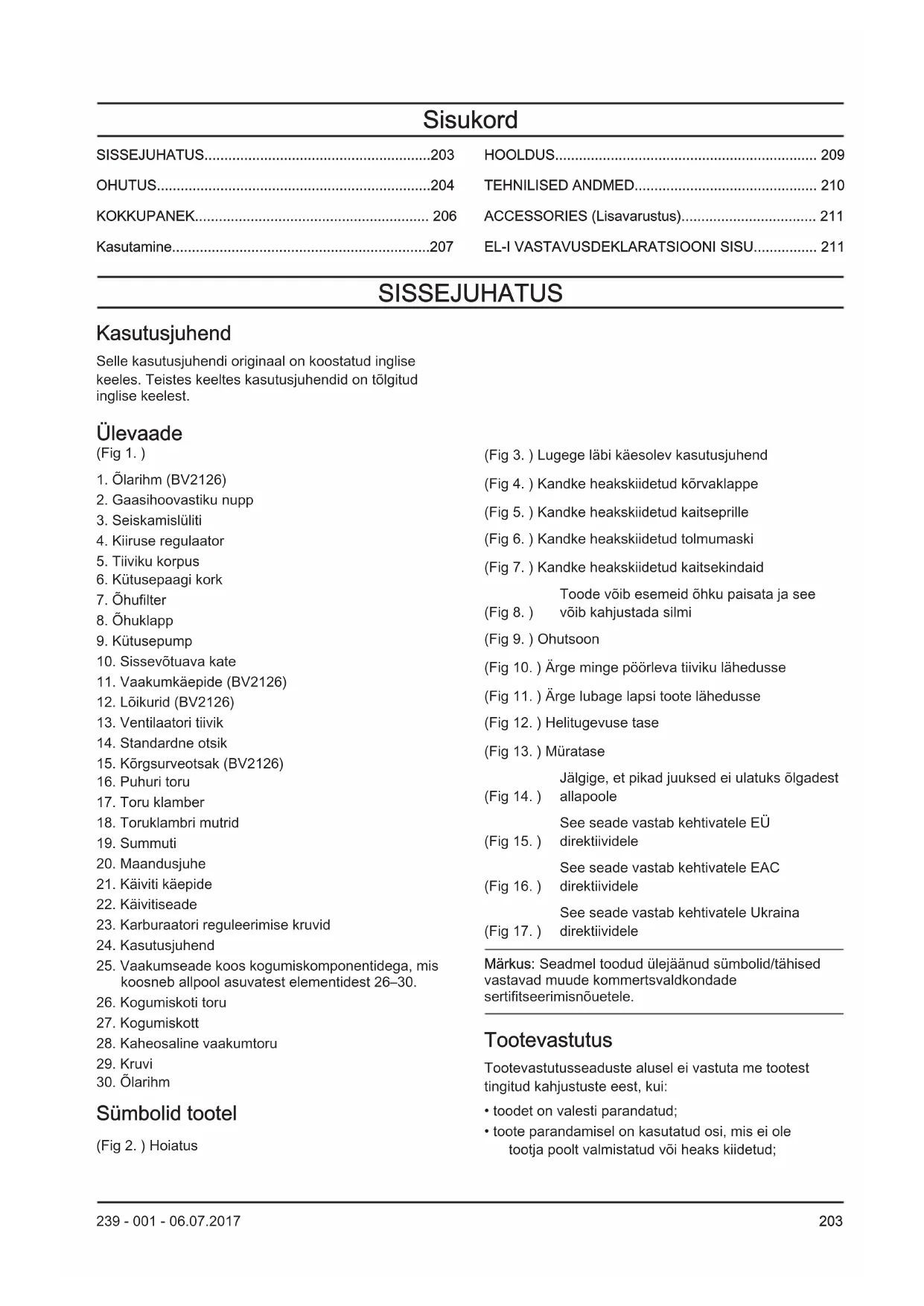 Sümbolid tootel (Fig 2. ) Hoiatus (Fig 3. ) Lugege läbi käesolev kasutusjuhend (Fig 4. ) Kandke heakskiidetud kõrvaklappe (Fig 5. ) Kandke heakskiidetud kaitseprille (Fig 6. ) Kandke heakskiidetud tolmumaski (Fig 7. ) Kandke heakskiidetud kaitsekindaid (Fig 8. ) Toode võib esemeid õhku paisata ja see võib kahjustada silmi (Fig 9. ) Ohutsoon (Fig 10. ) Ärge minge pöörleva tiiviku lähedusse (Fig 11. ) Ärge lubage lapsi toote lähedusse (Fig 12. ) Helitugevuse tase (Fig 13. ) Müratase (Fig 14. ) Jälgige, et pikad juuksed ei ulatuks õlgadest allapoole (Fig 15. ) See seade vastab kehtivatele EÜ direktiividele (Fig 16. ) See seade vastab kehtivatele EAC direktiividele (Fig 17. ) See seade vastab kehtivatele Ukraina direktiividele Märkus: Seadmel toodud ülejäänud sümbolid/tähised vastavad muude kommertsvaldkondade sertifitseerimisnõuetele. Tootevastutus Tootevastutusseaduste alusel ei vastuta me tootest tingitud kahjustuste eest, kui:
