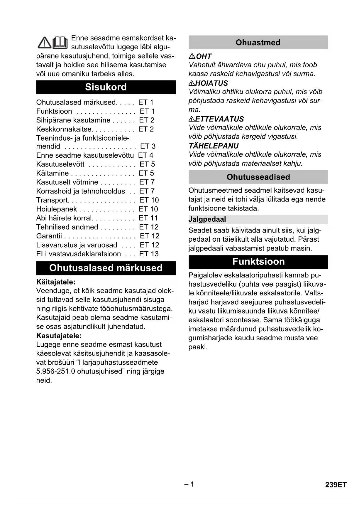 Chairman of the Board of Management Director Regulatory Affairs & Certification 238 SK– 1 Enne sesadme esmakordset ka- sutuselevõttu lugege läbi algu- pärane kasutusjuhend, toimige sellele vas- tavalt ja hoidke see hilisema kasutamise või uue omaniku tarbeks alles. Käitajatele: Veenduge, et kõik seadme kasutajad olek- sid tuttavad selle kasutusjuhendi sisuga ning riigis kehtivate tööohutusmäärustega. Kasutajaid peab olema seadme kasutami- se osas asjatundlikult juhendatud. Kasutajatele: Lugege enne seadme esmast kasutust käesolevat käsitsusjuhendit ja kaasasole- vat brošüüri “Harjapuhastusseadmete 5.956-251.0 ohutusjuhised” ning järgige neid. OHT Vahetult ähvardava ohu puhul, mis toob kaasa raskeid kehavigastusi või surma. 몇 HOIATUS Võimaliku ohtliku olukorra puhul, mis võib põhjustada raskeid kehavigastusi või sur- ma. 몇 ETTEVAATUS Viide võimalikule ohtlikule olukorrale, mis võib põhjustada kergeid vigastusi. TÄHELEPANU Viide võimalikule ohtlikule olukorrale, mis võib põhjustada materiaalset kahju. Ohutusmeetmed seadmel kaitsevad kasu- tajat ja neid ei tohi välja lülitada ega nende funktsioone takistada. Seadet saab käivitada ainult siis, kui jalg- pedaal on täielikult alla vajutatud. Pärast jalgpedaali vabastamist peatub masin. Paigalolev eskalaatoripuhasti kannab pu- hastusvedeliku (puhta vee paagist) liikuva- le kõnniteele/liikuvale eskalaatorile. Valts- harjad harjavad seejuures puhastusvedeli- ku vastu liikumissuunda liikuva kõnnitee/ eskalaatori soontesse. Sama töökäiguga imetakse määrdunud puhastusvedelik ko- gumisharjade kaudu seadme musta vee paaki. Sisukord Ohutusalased märkused. . . . . ET 1 Funktsioon . . . . . . . . . . . . . . . ET 1 Sihipärane kasutamine . . . . . . ET 2 Keskkonnakaitse. . . . . . . . . . . ET 2 Teenindus- ja funktsiooniele- mendid . . . . . . . . . . . . . . . . . . ET 3 Enne seadme kasutuselevõttu ET 4 Kasutuselevõtt . . . . . . . . . . . . ET 5 Käitamine . . . . . . . . . . . . . . . . ET 5 Kasutuselt võtmine . . . . . . . . . ET 7 Korrashoid ja tehnohooldus . . ET 7 Transport. . . . . . . . . . . . . . . . . ET 10 Hoiulepanek . . . . . . . . . . . . . . ET 10 Abi häirete korral. . . . . . . . . . . ET 11 Tehnilised andmed . . . . . . . . . ET 12 Garantii . . . . . . . . . . . . . . . . . . ET 12 Lisavarustus ja varuosad . . . . ET 12 ELi vastavusdeklaratsioon . . . ET 13 Ohutusalased märkused Ohuastmed Ohutusseadised Jalgpedaal Funktsioon 239ET– 2 Käesolev seade sobib professionaalseks ja tööstuslikuks kasutuseks, nt hotellides, koolides, haiglates, vabrikutes, poodides, büroodes ja rendifirmades. Kasutage antud seadet ainult vastavalt ka- sutusjuhendi andmetele. – Seadet tohib kasutada ainult liikuvteede ja eskalaatorite astmete puhastami- seks. – Seade on mõeldud ainult kasutamiseks siseruumides. – Puhastatava seadme töösuund peab olema määratud selline, et liikuvtee/es- kalaator liigub seadmest eemale. – Eskalaatorite puhastamiseks tohib sea- det kasutada ainult eskalaatori alumi- ses otsas. – Seadet tohib varustada ainult originaal- tarvikute ja -varuosadega. Märkusi koostisainete kohta (REACH) Aktuaalse info koostisainete kohta leiate aadressilt: www.kaercher.com/REACH Sihipärane kasutamine Keskkonnakaitse Pakendmaterjalid on taaskasu- tatavad. Palun ärge visake pa- kendeid majapidamisprahi hul- ka, vaid suunake need taaska- sutusse. Vanad seadmed sisaldavad taaskasutatavaid materjale, mis tuleks suunata taaskasutusse. Patareid, õli ja muud sarnased ained ei tohi jõuda keskkonda. Seetõttu palume vanad sead- med likvideerida vastavate ko- gumissüsteemide kaudu. 240 ET– 3 1 Tõukesang 2 Puhta vee väljalaskevoolik 3 Musta vee väljalaskevoolik 4 Võrgupistik 5 Tõmbekoormuse vähendamise konks 6 Jalgpedaal 7 Tagumised rattad lukustushoovaga 8 Musta vee paagi kaas 9 Eesmised rattad 10 Musta vee paak 11 Puhta vee paagi täiteava 12 Pedaal harjapea langetamiseks/tõstmi- seks 13 Hoob harjapea lukustamiseks 1 Töötundide loendur 2 Pumbarõhu näit 3 Seadme lüliti 4 Kontroll-lamp „Musta vee paak täis“ 5 Kontroll-lamp „Harjamootori ülekoor- mus“ Teenindus- ja funktsioonielemendid Juhtimispult 241ET– 4 Eemaldage pakend, välja arvatud puita- lus.
