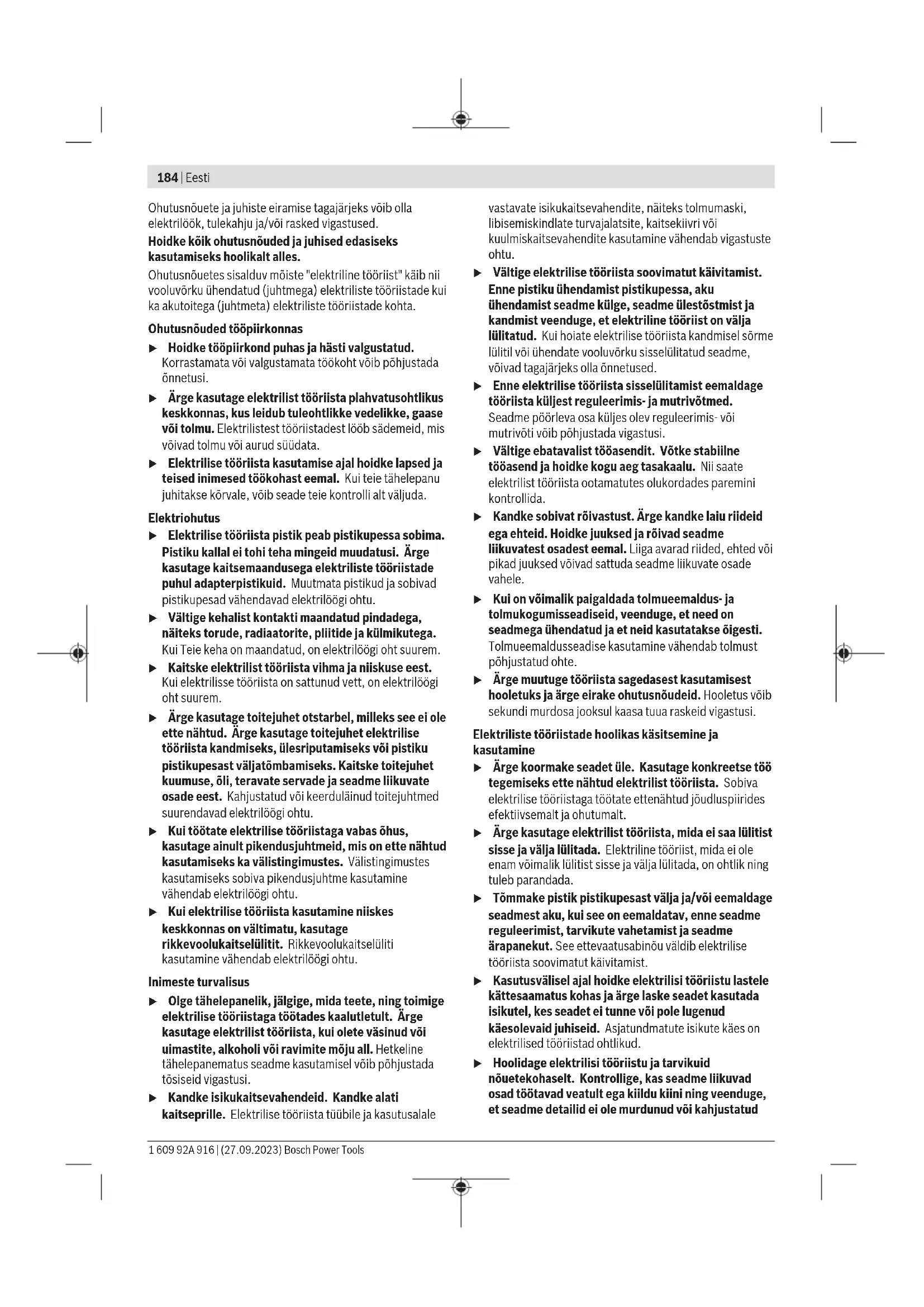 Namjestite prsten za namještanje predbiranja zakretnog momenta(3) na željeni zakretni moment. Za maksimalni zakretni moment namjestite prsten za prethodno biranje načina rada(4) na simbol „Bušenje/uvrtanje vijaka MAX“. Uvrtanje vijaka i bušenje Za uvrtanje velikih vijaka i za bušenje namjestite prsten za prethodno biranje načina rada(4) na simbol „Bušenje/uvrtanje vijaka MAX“. 1 609 92A 916 | (27.09.2023) Bosch Power ToolsEesti | 183 Udarno bušenje Za udarno bušenje u zidove namjestite prsten za prethodno biranje načina rada(4) na simbol „Udarno bušenje“. Automatska blokada vretena (Auto-Lock) Ako prekidač za uključivanje/isključivanje (10) nije pritisnut, blokira se bušno vreteno, a time i prihvat alata (1). To omogućava uvrtanje vijaka i kod ispražnjene aku-baterije (7) odnosno korištenje električnog alata kao izvijača. Zaštita od preopterećenja ovisna o temperaturi Kod namjenske uporabe se električni alat ne može preopteretiti. Kod prevelikog opterećenja ili prekoračenja dopuštene temperature aku-baterije isključuje se elektronika električnog alata sve dok se ne ponovno ne vrati u optimalno područje radne temperature. Upute za rad u Električni alat stavite na maticu/vijak samo u isključenom stanju. Rotirajući radni alati mogu kliznuti. Nakon duljeg rada s manjim brojem okretaja, električni alat trebate ostaviti da u svrhu hlađenja radi cca. 3minute pri maks. broju okretaja u praznom hodu. Održavanje i servisiranje Održavanje i čišćenje u Prije svih radova na električnom alatu (npr. održavanje, zamjena alata, itd.), kao i kod njegovog transporta i spremanja, aku-bateriju treba izvaditi iz električnog alata. Kod nehotičnog aktiviranja prekidača za uključivanje/isključivanje postoji opasnost od ozljeda. u Električni alat i otvore za hlađenje održavajte čistima kako bi se moglo dobro i sigurno raditi. Servisna služba i savjeti o uporabi Naša servisna služba će odgovoriti na vaša pitanja o popravku i održavanju vašeg proizvoda, kao i o rezervnim dijelovima. Crteže u rastavljenom obliku i informacije o rezervnim dijelovima možete naći i na našoj adresi: www.bosch-pt.com Tim Bosch savjetnika o uporabi rado će odgovoriti na vaša pitanja o našim proizvodima i njihovom priboru. U slučaju upita ili naručivanja rezervnih dijelova, molimo vas obavezno navedite 10‑znamenkasti kataloški broj s tipske pločice proizvoda. Hrvatski Robert Bosch d.o.o PT/SHR-BSC Kneza Branimira 22 10040 Zagreb Tel.: +385 12 958 051 Fax: +385 12 958 050 E-Mail: RBKN-bsc@hr.bosch.com www.bosch.hr Ostale adrese servisa možete pronaći na: www.bosch-pt.com/serviceaddresses Transport Preporučene litij-ionske aku-baterije podliježu zakonu o transportu opasnih tvari. Korisnik bez ikakvih preduvjeta može transportirati aku-baterije cestovnim transportom. Ako transport obavlja treća strana (npr. transport zrakoplovom ili špedicija), treba se pridržavati posebnih zahtjeva za ambalažu i označavanje. Kod pripreme ovakvih pošiljki za transport prethodno se treba savjetovati sa stručnjakom za transport opasnih tvari. Aku-bateriju šaljite nekim transportnim sredstvom samo ako je njezino kućište neoštećeno. Oblijepite otvorene kontakte i zapakirajte aku-bateriju tako da se ne može pomicati u ambalaži. Pridržavajte se i eventualnih dodatnih nacionalnih propisa. Zbrinjavanje Električne alate, aku-baterije, pribor i ambalažu treba dovesti na ekološki prihvatljivo recikliranje. Električni alat i aku-baterije/baterije ne bacajte u kućni otpad! Samo za zemljeEU: U skladu s europskom Direktivom 2012/19/EU o električnim i elektroničkim starim uređajima i njihovom provedbom u nacionalno pravo neupotrebljivi električni alati i u skladu s europskom Direktivom 2006/66/EZ neispravne ili istrošene aku-baterije/baterije moraju se odvojeno sakupljati i dovesti na ekološki prihvatljivo recikliranje. U slučaju nepravilnog zbrinjavanja električni i elektronički stari uređaji mogu imati štetne učinke na okoliš i ljudsko zdravlje zbog moguće prisutnosti opasnih tvari. Aku-baterije/baterije: Litij-ionske: Pridržavajte se uputa u poglavlju Transport (vidi „Transport“, Stranica183). Eesti Ohutusnõuded Üldised ohutusnõuded elektriliste tööriistade kasutamisel HOIATUS Lugege läbi kõik tööriistaga kaasas olevad ohutusnõuded ja juhised ning tutvuge kõigi jooniste ja spetsifikatsioonidega. Bosch Power Tools 1 609 92A 916 | (27.09.2023)184 | Eesti Ohutusnõuete ja juhiste eiramise tagajärjeks võib olla elektrilöök, tulekahju ja/või rasked vigastused. Hoidke kõik ohutusnõuded ja juhised edasiseks kasutamiseks hoolikalt alles. Ohutusnõuetes sisalduv mõiste "elektriline tööriist" käib nii vooluvõrku ühendatud (juhtmega) elektriliste tööriistade kui ka akutoitega (juhtmeta) elektriliste tööriistade kohta. Ohutusnõuded tööpiirkonnas u Hoidke tööpiirkond puhas ja hästi valgustatud. Korrastamata või valgustamata töökoht võib põhjustada õnnetusi. u Ärge kasutage elektrilist tööriista plahvatusohtlikus keskkonnas, kus leidub tuleohtlikke vedelikke, gaase või tolmu. Elektrilistest tööriistadest lööb sädemeid, mis võivad tolmu või aurud süüdata. u Elektrilise tööriista kasutamise ajal hoidke lapsed ja teised inimesed töökohast eemal. Kui teie tähelepanu juhitakse kõrvale, võib seade teie kontrolli alt väljuda. Elektriohutus u Elektrilise tööriista pistik peab pistikupessa sobima. Pistiku kallal ei tohi teha mingeid muudatusi. Ärge kasutage kaitsemaandusega elektriliste tööriistade puhul adapterpistikuid. Muutmata pistikud ja sobivad pistikupesad vähendavad elektrilöögi ohtu. u Vältige kehalist kontakti maandatud pindadega, näiteks torude, radiaatorite, pliitide ja külmikutega. Kui Teie keha on maandatud, on elektrilöögi oht suurem. u Kaitske elektrilist tööriista vihma ja niiskuse eest. Kuielektrilisse tööriista on sattunud vett, on elektrilöögi oht suurem. u Ärge kasutag