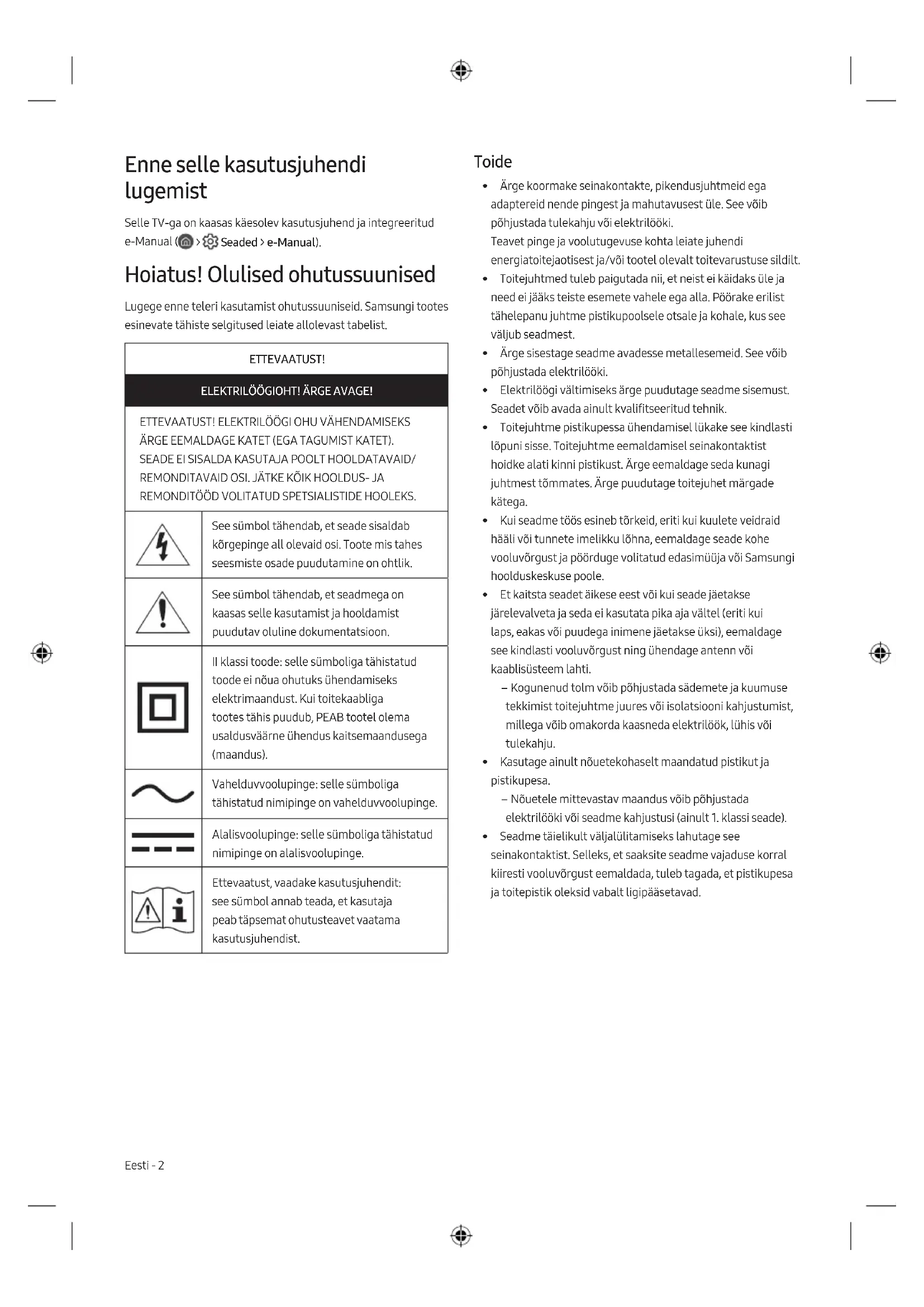 - Selles kasutusjuhendis olevad joonised on mõeldud ainult viiteks ja nendel kujutatu võib erineda tegelikust tootest. Toote kujundust ja tehnilisi andmeid võidakse ilma ette teatamata muuta. Toote parandamisel mittevolitatud teenuseosutaja poolt, tarbija enda poolt parandamise või ebaprofessionaalse parandamise korral ei vastuta Samsung ükskõik millise kahju eest tootele või muu tooteohutusega seotud probleemi korral, mis on tekkinud toote parandamise katsel, kus ei järgita hoolikalt neid parandamise ja hooldamise tingimusi. Igasugune kahju, mis tekitatakse tootele seoses katsega seda parandada kellegi teise kui Samsungi sertifitseeritud teenuseosutaja poolt, ei ole garantiiga kaetud. Palun külasta samsung.com/support lehekülge, et leida välise toiteadapteri ja kaugjuhtimise kohta täiendavat informatsiooni, mis on seotud EL ökodisaini direktiiviga - Energiamõjuga toodete regulatsioon Eesti - 8Seadme õige kasutuselt kõrvaldamine (elektri- ja elektroonikaseadmete jäätmed) (Kehtib eraldi kogumissüsteemidega riikides.) See tähis tootel, lisatarvikutel või dokumentidel näitab, et toodet ja selle elektroonilisi lisatarvikuid (nt laadijat, peakomplekti, USB-kaablit) ei tohi kasutusaja lõppedes kasutuselt kõrvaldada koos muude majapidamisjäätmetega. Selleks, et vältida jäätmete kontrollimatu kõrvaldamisega seotud võimaliku kahju tekitamist keskkonnale või inimeste tervisele ning edendada materiaalsete vahendite säästvat taaskasutust, eraldage need esemed muudest jäätmetest ja suunake taasringlusse. Kodukasutajad saavad teavet keskkonnaohutu ringlussevõtu paikade ja viiside kohta kas toote müüjalt või kohalikust keskkonnaametist. Ettevõtted peaksid ühendust võtma tarnijaga ning kontrollima ostulepingu tingimusi ja sätteid. Seda toodet ja selle elektroonilisi lisatarvikuid ei tohi panna muude kõrvaldamiseks mõeldud kaubandusjäätmete hulka. Seadmes kasutatavate patareide korrektne kasutuselt kõrvaldamine (Kehtib eraldi kogumissüsteemidega riikides.) See tähis patareil, kasutusjuhendil või pakendil näitab, et seadmes kasutatavaid patareisid ei tohi utiliseerida kasutusaja lõppedes koos muude olmejäätmetega. Keemiliste sümbolite Hg, Cd või Pb tähised viitavad sellele, et patarei sisaldab rohkem elavhõbedat, kaadmiumi või pliid kui EÜ direktiiviga 2006/66 lubatud. Kui selliseid patareisid ei kõrvaldata ettenähtud viisil, kujutavad need ohtu inimeste tervisele või keskkonnale. Looduse kaitsmiseks ja materjalide taaskasutuse edendamiseks eraldage patareid muudest olmejäätmetest ja viige need lähimasse patareide kogumispunkti. Eesti - 9 EestiEnnen tämän käyttöoppaan lukemista Tämän television mukana toimitetaan tämä käyttöopas sekä televisioon sisäänrakennettu e-Manual-opas ( > Asetukset > e-Manual). Varoitus! Tärkeitä turvallisuusohjeita Lue turvallisuusohjeet ennen television käyttöä. Katso seuraavasta taulukosta Samsung tuotteessasi mahdollisesti olevien symbolien selitys. HUOMIO SÄHKÖISKUN VAARA. ÄLÄ AVAA. HUOMIO: ÄLÄ POISTA LAITTEEN SUOJUSTA (ÄLÄKÄ TAKAOSAA), JOTTA VOISIT VÄLTTYÄ SÄHKÖISKUILTA. LAITTEEN SISÄLLÄ EI OLE SELLAISIA OSIA, JOITA KÄYTTÄJÄ VOISI ITSE HUOLTAA. ANNA KAIKKI HUOLTOTOIMET KOULUTETUILLE TEKNIKOILLE. Tämä merkki tarkoittaa, että laitteen sisällä on suurjännitettä. On vaarallista koskea millään tavoin tämän laitteen sisäosiin. Tämä merkki tarkoittaa, että laitteen mukana on tärkeitä käyttö- ja huolto-ohjeita. LuokanII laite: Tämä merkki tarkoittaa, että laite ei edellytä maadoitusta. Jos tätä symbolia ei ole tuotteessa, jossa on sähköjohto, tuotteella ON oltava luotettava yhteys suojaavaan maahan (maadoitus). AC-jännite: Tähän symboliin liittyvä nimellisjännite on vaihtovirtajännite. DC-jännite: Tähän symboliin liittyvä nimellisjännite on tasavirtajännite. Huomio. Tutustu käyttöohjeisiin: Tämä merkki tarkoittaa, että käyttäjän tulisi tutustua käyttöoppaassa oleviin turvallisuustietoihin. Virta