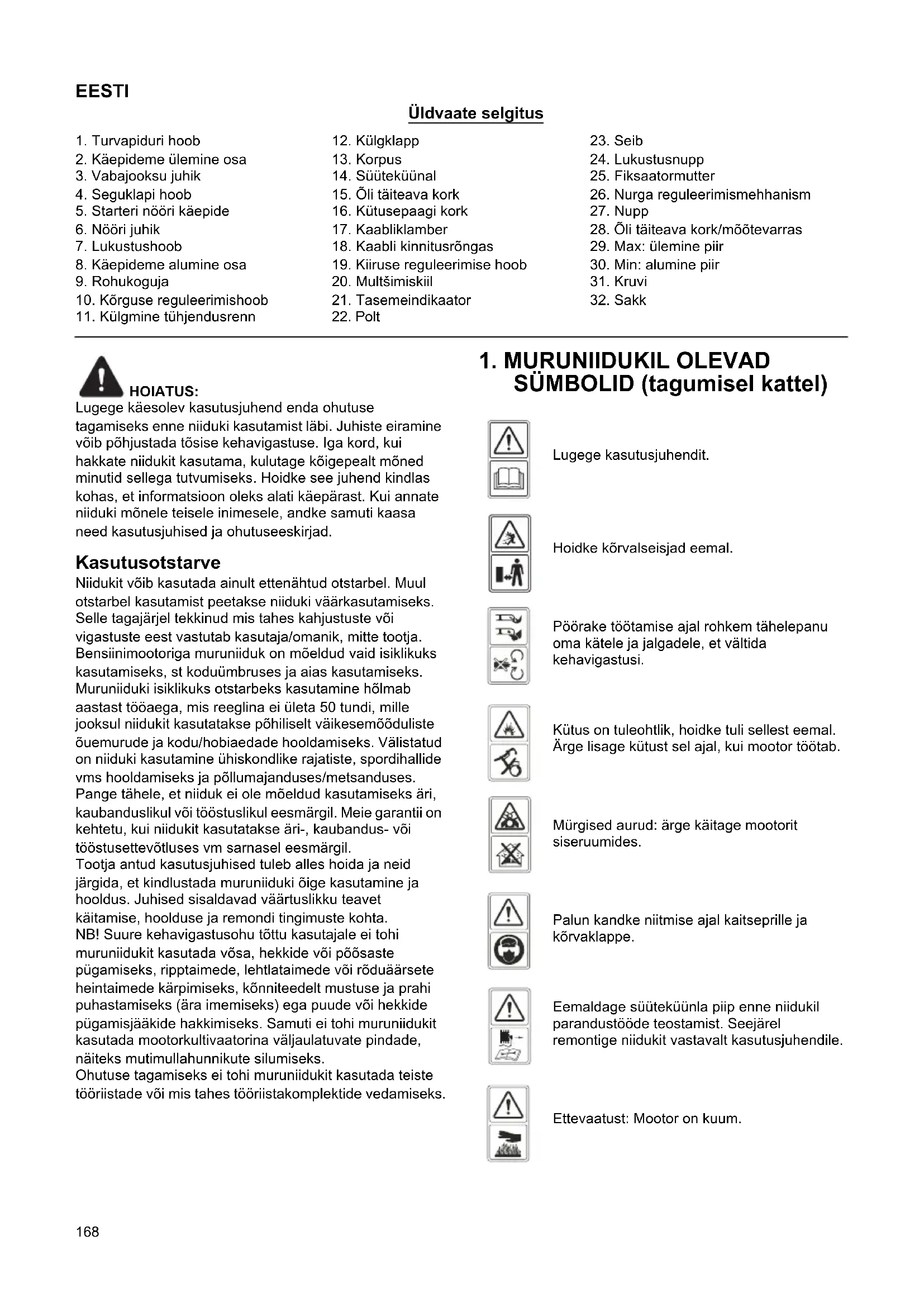 Lugege kasutusjuhendit. Hoidke kõrvalseisjad eemal. Pöörake töötamise ajal rohkem tähelepanu oma kätele ja jalgadele, et vältida kehavigastusi. Kütus on tuleohtlik, hoidke tuli sellest eemal. Ärge lisage kütust sel ajal, kui mootor töötab. Mürgised aurud: ärge käitage mootorit siseruumides. Palun kandke niitmise ajal kaitseprille ja kõrvaklappe. Eemaldage süüteküünla piip enne niidukil parandustööde teostamist. Seejärel remontige niidukit vastavalt kasutusjuhendile. Ettevaatust: Mootor on kuum.169