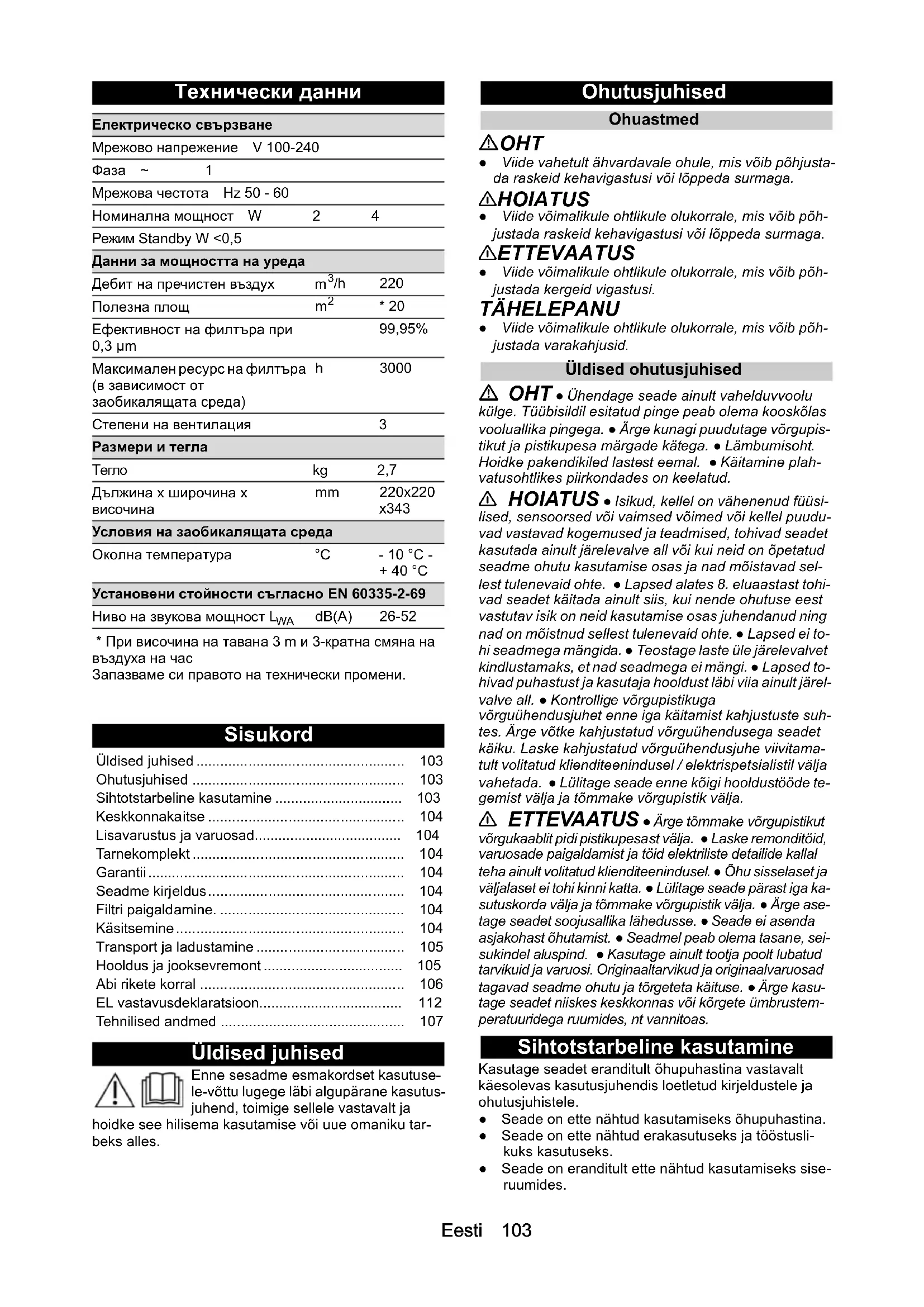 Sisukord Üldised juhised Enne sesadme esmakordset kasutuse- le-võttu lugege läbi algupärane kasutus- juhend, toimige sellele vastavalt ja hoidke see hilisema kasutamise või uue omaniku tar- beks alles. Ohutusjuhised Ohuastmed OHT ● Viide vahetult ähvardavale ohule, mis võib põhjusta- da raskeid kehavigastusi või lõppeda surmaga. 몇 HOIATUS ● Viide võimalikule ohtlikule olukorrale, mis võib põh- justada raskeid kehavigastusi või lõppeda surmaga. 몇 ETTEVAATUS ● Viide võimalikule ohtlikule olukorrale, mis võib põh- justada kergeid vigastusi. TÄHELEPANU ● Viide võimalikule ohtlikule olukorrale, mis võib põh- justada varakahjusid. Üldised ohutusjuhised OHT ● Ühendage seade ainult vahelduvvoolu külge. Tüübisildil esitatud pinge peab olema kooskõlas vooluallika pingega. ● Ärge kunagi puudutage võrgupis- tikut ja pistikupesa märgade kätega. ● Lämbumisoht. Hoidke pakendikiled lastest eemal. ● Käitamine plah- vatusohtlikes piirkondades on keelatud. 몇 HOIATUS ● Isikud, kellel on vähenenud füüsi- lised, sensoorsed või vaimsed võimed või kellel puudu- vad vastavad kogemused ja teadmised, tohivad seadet kasutada ainult järelevalve all või kui neid on õpetatud seadme ohutu kasutamise osas ja nad mõistavad sel- lest tulenevaid ohte. ● Lapsed alates 8. eluaastast tohi- vad seadet käitada ainult siis, kui nende ohutuse eest vastutav isik on neid kasutamise osas juhendanud ning nad on mõistnud sellest tulenevaid ohte. ● Lapsed ei to- hi seadmega mängida. ● Teostage laste üle järelevalvet kindlustamaks, et nad seadmega ei mängi. ● Lapsed to- hivad puhastust ja kasutaja hooldust läbi viia ainult järel- valve all. ● Kontrollige võrgupistikuga võrguühendusjuhet enne iga käitamist kahjustuste suh- tes. Ärge võtke kahjustatud võrguühendusega seadet käiku. Laske kahjustatud võrguühendusjuhe viivitama- tult volitatud klienditeenindusel / elektrispetsialistil välja vahetada. ● Lülitage seade enne kõigi hooldustööde te- gemist välja ja tõmmake võrgupistik välja. 몇 ETTEVAATUS ● Ärge tõmmake võrgupistikut võrgukaablit pidi pistikupesast välja. ● Laske remonditöid, varuosade paigaldamist ja töid elektriliste detailide kallal teha ainult volitatud klienditeenindusel. ● Õhu sisselaset ja väljalaset ei tohi kinni katta. ● Lülitage seade pärast iga ka- sutuskorda välja ja tõmmake võrgupistik välja. ● Ärge ase- tage seadet soojusallika lähedusse. ● Seade ei asenda asjakohast õhutamist. ● Seadmel peab olema tasane, sei- sukindel aluspind. ● Kasutage ainult tootja poolt lubatud tarvikuid ja varuosi. Originaaltarvikud ja originaalvaruosad tagavad seadme ohutu ja tõrgeteta käituse. ● Ärge kasu- tage seadet niiskes keskkonnas või kõrgete ümbrustem- peratuuridega ruumides, nt vannitoas. Sihtotstarbeline kasutamine Kasutage seadet eranditult õhupuhastina vastavalt käesolevas kasutusjuhendis loetletud kirjeldustele ja ohutusjuhistele. ● Seade on ette nähtud kasutamiseks õhupuhastina. ● Seade on ette nähtud erakasutuseks ja tööstusli- kuks kasutuseks. ● Seade on eranditult ette nähtud kasutamiseks sise- ruumides. Електрическо свързване Мрежово напрежение V 100-240 Фаза ~1 Мрежова честота Hz 50 - 60 Номинална мощност W24 Режим Standby W <0,5 Данни за мощността на уреда Дебит на пречистен въздух m