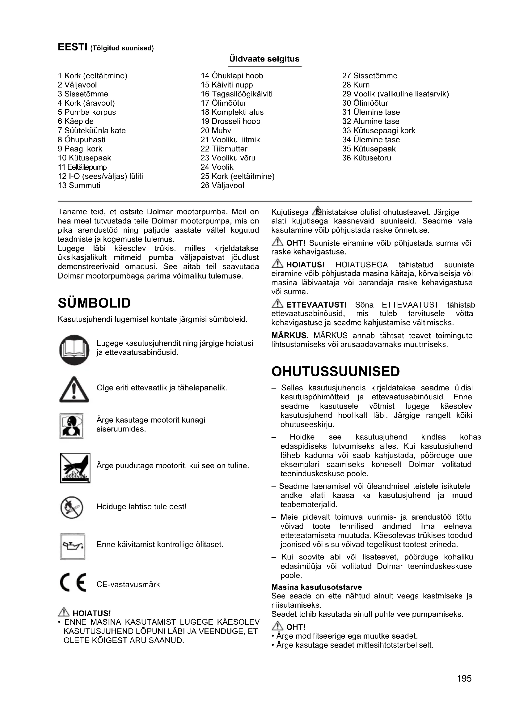 - ENNE MASINA KASUTAMIST LUGEGE KÄESOLEV KASUTUSJUHEND LÕPUNI LÄBI JA VEENDUGE, ET OLETE KÕIGEST ARU SAANUD. Kujutisega tähistatakse olulist ohutusteavet. Järgige alati kujutisega kaasnevaid suuniseid. Seadme vale kasutamine võib põhjustada raske õnnetuse. OHT! Suuniste eiramine võib põhjustada surma või raske kehavigastuse. HOIATUS! HOIATUSEGA tähistatud suuniste eiramine võib põhjustada masina käitaja, kõrvalseisja või masina läbivaataja või parandaja raske kehavigastuse või surma. ETTEVAATUST! Sõna ETTEVAATUST tähistab ettevaatusabinõusid, mis tuleb tarvitusele võtta kehavigastuse ja seadme kahjustamise vältimiseks. MÄRKUS. MÄRKUS annab tähtsat teavet toimingute lihtsustamiseks või arusaadavamaks muutmiseks. OHUTUSSUUNISED – Selles kasutusjuhendis kirjeldatakse seadme üldisi kasutuspõhimõtteid ja ettevaatusabinõusid. Enne seadme kasutusele võtmist lugege käesolev kasutusjuhend hoolikalt läbi. Järgige rangelt kõiki ohutuseeskirju. – Hoidke see kasutusjuhend kindlas kohas edaspidiseks tutvumiseks alles. Kui kasutusjuhend läheb kaduma või saab kahjustada, pöörduge uue eksemplari saamiseks koheselt Dolmar volitatud teeninduskeskuse poole. – Seadme laenamisel või üleandmisel teistele isikutele andke alati kaasa ka kasutusjuhend ja muud teabematerjalid. – Meie pidevalt toimuva uurimis- ja arendustöö tõttu võivad toote tehnilised andmed ilma eelneva etteteatamiseta muutuda. Käesolevas trükises toodud joonised või sisu võivad tegelikust tootest erineda. – Kui soovite abi või lisateavet, pöörduge kohaliku edasimüüja või volitatud Dolmar teeninduskeskuse poole. Masina kasutusotstarve See seade on ette nähtud ainult veega kastmiseks ja niisutamiseks. Seadet tohib kasutada ainult puhta vee pumpamiseks. OHT!