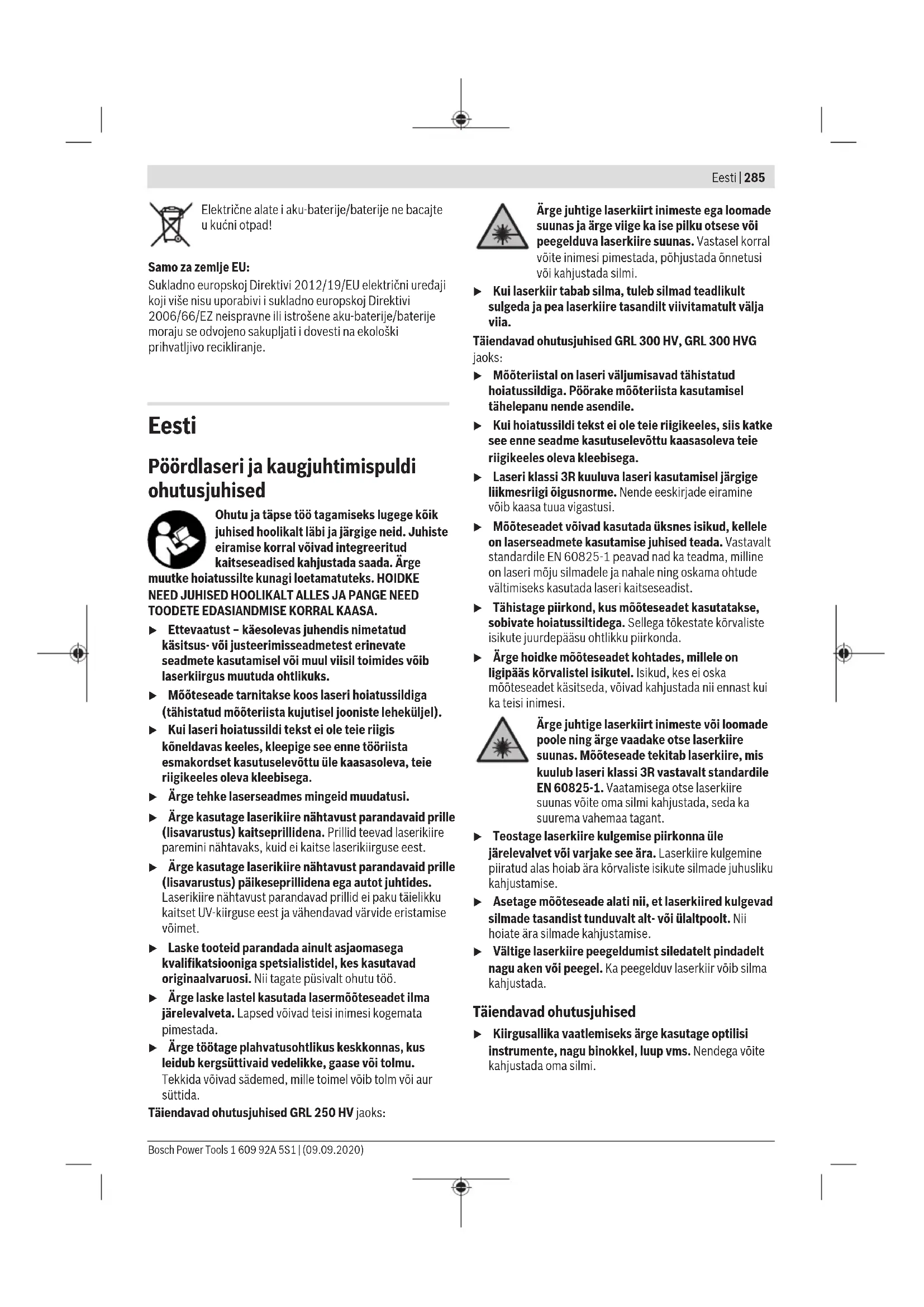 EL-vastavusdeklaratsioon Kinnitame ainuvastutajatena, et nimetatud tooted vastavad järgnevalt loetle- tud direktiivide ja määruste kõikidele asjaomastele nõuetele ja on kooskõlas Pöördlaser Tootenumber 1 609 92A 5S1 | (09.09.2020) Bosch Power ToolsIII järgmiste normidega. Tehnilised dokumendid saadaval: *