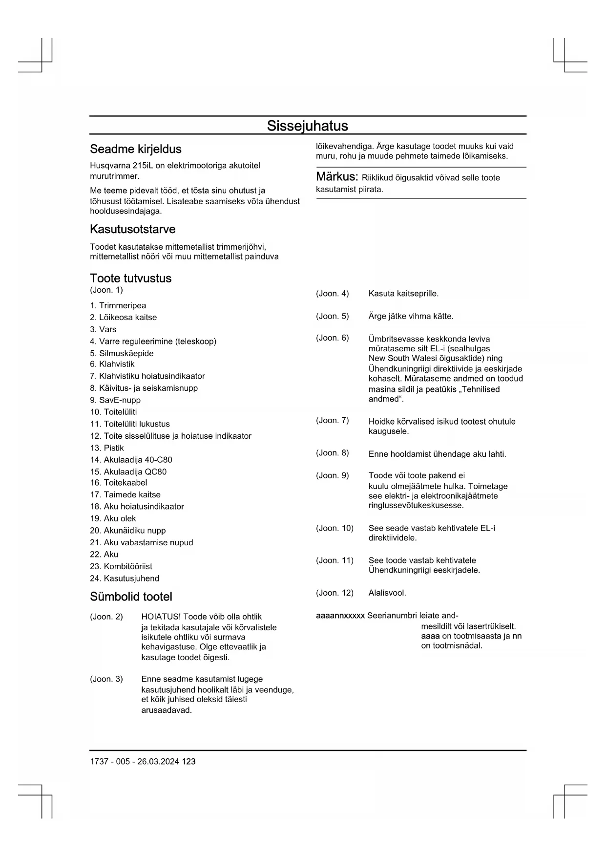 Sümbolid tootel (Joon. 2) HOIATUS! Toode võib olla ohtlik ja tekitada kasutajale või kõrvalistele isikutele ohtliku või surmava kehavigastuse. Olge ettevaatlik ja kasutage toodet õigesti. (Joon. 3) Enne seadme kasutamist lugege kasutusjuhend hoolikalt läbi ja veenduge, et kõik juhised oleksid täiesti arusaadavad. (Joon. 4) Kasuta kaitseprille. (Joon. 5) Ärge jätke vihma kätte. (Joon. 6) Ümbritsevasse keskkonda leviva mürataseme silt EL-i (sealhulgas New South Walesi õigusaktide) ning Ühendkuningriigi direktiivide ja eeskirjade kohaselt. Mürataseme andmed on toodud masina sildil ja peatükis „Tehnilised andmed“. (Joon. 7) Hoidke kõrvalised isikud tootest ohutule kaugusele. (Joon. 8) Enne hooldamist ühendage aku lahti. (Joon. 9) Toode või toote pakend ei kuulu olmejäätmete hulka. Toimetage see elektri- ja elektroonikajäätmete ringlussevõtukeskusesse. (Joon. 10) See seade vastab kehtivatele EL-i direktiividele. (Joon. 11) See toode vastab kehtivatele Ühendkuningriigi eeskirjadele. (Joon. 12) Alalisvool. aaaannxxxxx Seerianumbri leiate and- mesildilt või lasertrükiselt. aaaa on tootmisaasta ja nn on tootmisnädal. 1737 - 005 - 26.03.2024 123Akul ja/või akulaadijal olevad sümbolid. (Joon. 16) Toimetage seade elektri- ja elektroonikajäätmete ringlusse- võtukeskusesse. (Kehtib vaid Euroopas) (Joon. 13) Tõrkekindel trafo. (Joon. 14) Kasutage ja hoiustage akulaadijat ainult siseruumides. (Joon. 15) Topeltisolatsioon. Toote kahjustused Me ei vastuta meie tootele tekitatud kahjude eest, kui: