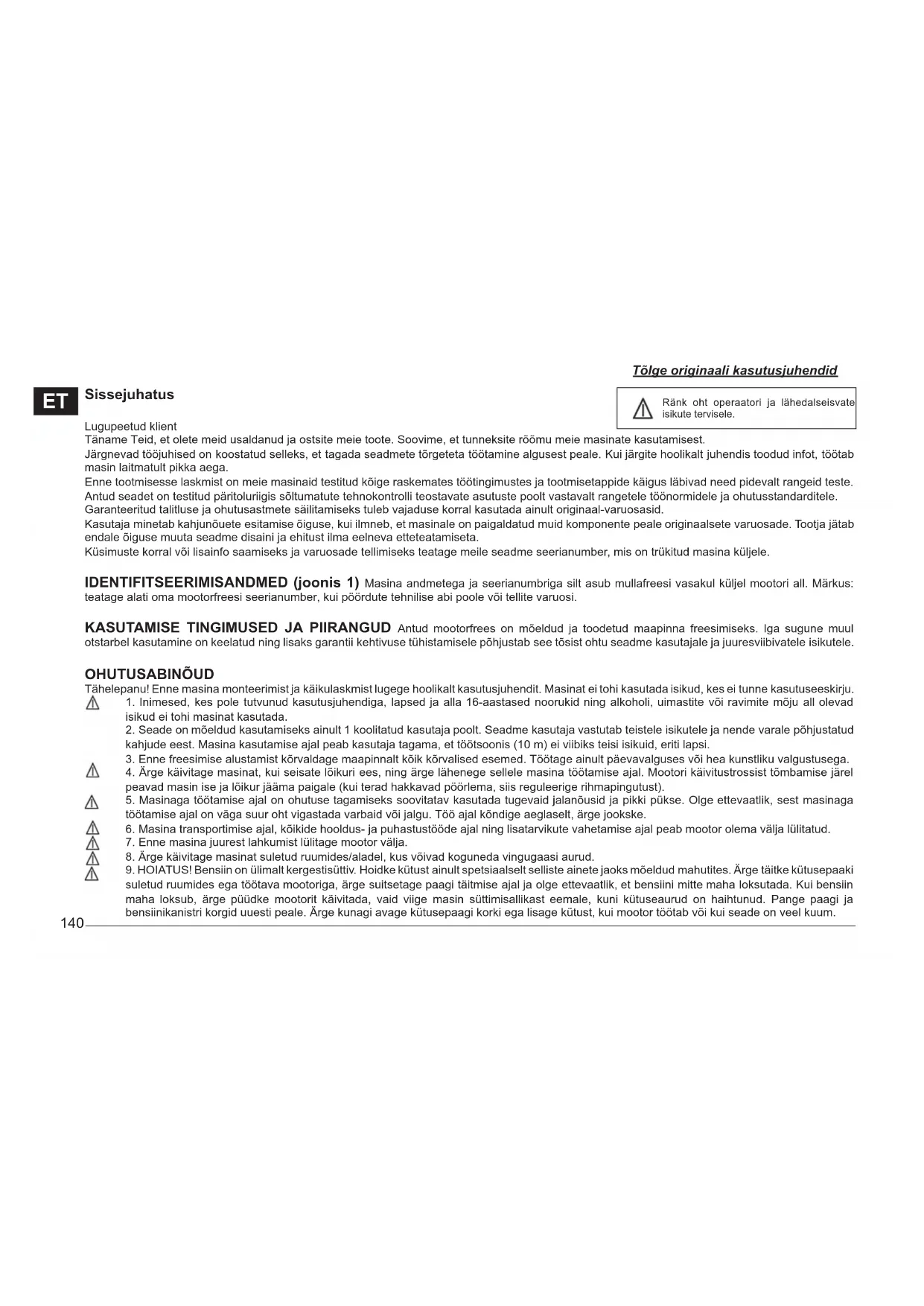 5 Маса 6 Мощност в kW Етикет скоростен лост Етикет въртене кормило140 Sissejuhatus Lugupeetud klient Täname Teid, et olete meid usaldanud ja ostsite meie toote. Soovime, et tunneksite rõõmu meie masinate kasutamisest. Järgnevad tööjuhised on koostatud selleks, et tagada seadmete tõrgeteta töötamine algusest peale. Kui järgite hoolikalt juhendis toodud infot, töötab masin laitmatult pikka aega. Enne tootmisesse laskmist on meie masinaid testitud kõige raskemates töötingimustes ja tootmisetappide käigus läbivad need pidevalt rangeid teste. Antud seadet on testitud päritoluriigis sõltumatute tehnokontrolli teostavate asutuste poolt vastavalt rangetele töönormidele ja ohutusstandarditele. Garanteeritud talitluse ja ohutusastmete säilitamiseks tuleb vajaduse korral kasutada ainult originaal-varuosasid. Kasutaja minetab kahjunõuete esitamise õiguse, kui ilmneb, et masinale on paigaldatud muid komponente peale originaalsete varuosade. Tootja jätab endale õiguse muuta seadme disaini ja ehitust ilma eelneva etteteatamiseta. Küsimuste korral või lisainfo saamiseks ja varuosade tellimiseks teatage meile seadme seerianumber, mis on trükitud masina küljele. IDENTIFITSEERIMISANDMED (joonis 1) Masina andmetega ja seerianumbriga silt asub mullafreesi vasakul küljel mootori all. Märkus: teatage alati oma mootorfreesi seerianumber, kui pöördute tehnilise abi poole või tellite varuosi. KASUTAMISE TINGIMUSED JA PIIRANGUD Antud mootorfrees on mõeldud ja toodetud maapinna freesimiseks. Iga sugune muul otstarbel kasutamine on keelatud ning lisaks garantii kehtivuse tühistamisele põhjustab see tõsist ohtu seadme kasutajale ja juuresviibivatele isikutele. OHUTUSABINÕUD Tähelepanu! Enne masina monteerimist ja käikulaskmist lugege hoolikalt kasutusjuhendit. Masinat ei tohi kasutada isikud, kes ei tunne kasutuseeskirju. 1. Inimesed, kes pole tutvunud kasutusjuhendiga, lapsed ja alla 16-aastased noorukid ning alkoholi, uimastite või ravimite mõju all olevad isikud ei tohi masinat kasutada. 2. Seade on mõeldud kasutamiseks ainult 1 koolitatud kasutaja poolt. Seadme kasutaja vastutab teistele isikutele ja nende varale põhjustatud kahjude eest. Masina kasutamise ajal peab kasutaja tagama, et töötsoonis (10 m) ei viibiks teisi isikuid, eriti lapsi. 3. Enne freesimise alustamist kõrvaldage maapinnalt kõik kõrvalised esemed. Töötage ainult päevavalguses või hea kunstliku valgustusega. 4. Ärge käivitage masinat, kui seisate lõikuri ees, ning ärge lähenege sellele masina töötamise ajal. Mootori käivitustrossist tõmbamise järel peavad masin ise ja lõikur jääma paigale (kui terad hakkavad pöörlema, siis reguleerige rihmapingutust). 5. Masinaga töötamise ajal on ohutuse tagamiseks soovitatav kasutada tugevaid jalanõusid ja pikki pükse. Olge ettevaatlik, sest masinaga töötamise ajal on väga suur oht vigastada varbaid või jalgu. Töö ajal kõndige aeglaselt, ärge jookske. 6. Masina transportimise ajal, kõikide hooldus- ja puhastustööde ajal ning lisatarvikute vahetamise ajal peab mootor olema välja lülitatud.