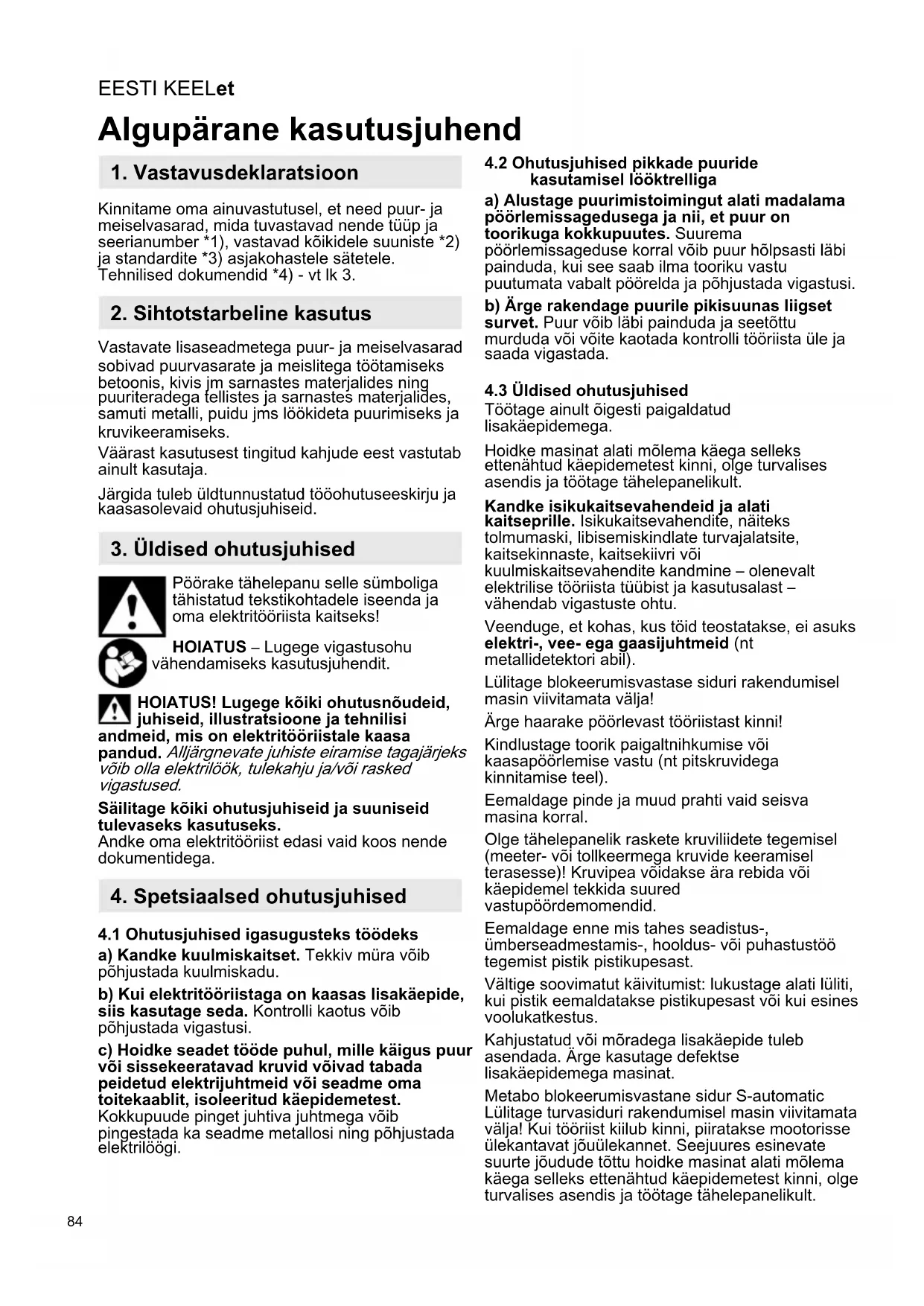 Kinnitame oma ainuvastutusel, et need puur- ja meiselvasarad, mida tuvastavad nende tüüp ja seerianumber *1), vastavad kõikidele suuniste *2) ja standardite *3) asjakohastele sätetele. Tehnilised dokumendid *4) - vt lk 3. Vastavate lisaseadmetega puur- ja meiselvasarad sobivad puurvasarate ja meislitega töötamiseks betoonis, kivis jm sarnastes materjalides ning puuriteradega tellistes ja sarnastes materjalides, samuti metalli, puidu jms löökideta puurimiseks ja kruvikeeramiseks. Väärast kasutusest tingitud kahjude eest vastutab ainult kasutaja. Järgida tuleb üldtunnustatud tööohutuseeskirju ja kaasasolevaid ohutusjuhiseid. Pöörake tähelepanu selle sümboliga tähistatud tekstikohtadele iseenda ja oma elektritööriista kaitseks! HOIATUS – Lugege vigastusohu vähendamiseks kasutusjuhendit. HOIATUS! Lugege kõiki ohutusnõudeid, juhiseid, illustratsioone ja tehnilisi andmeid, mis on elektritööriistale kaasa pandud. Alljärgnevate juhiste eiramise tagajärjeks võib olla elektrilöök, tulekahju ja/või rasked vigastused. Säilitage kõiki ohutusjuhiseid ja suuniseid tulevaseks kasutuseks. Andke oma elektritööriist edasi vaid koos nende dokumentidega.