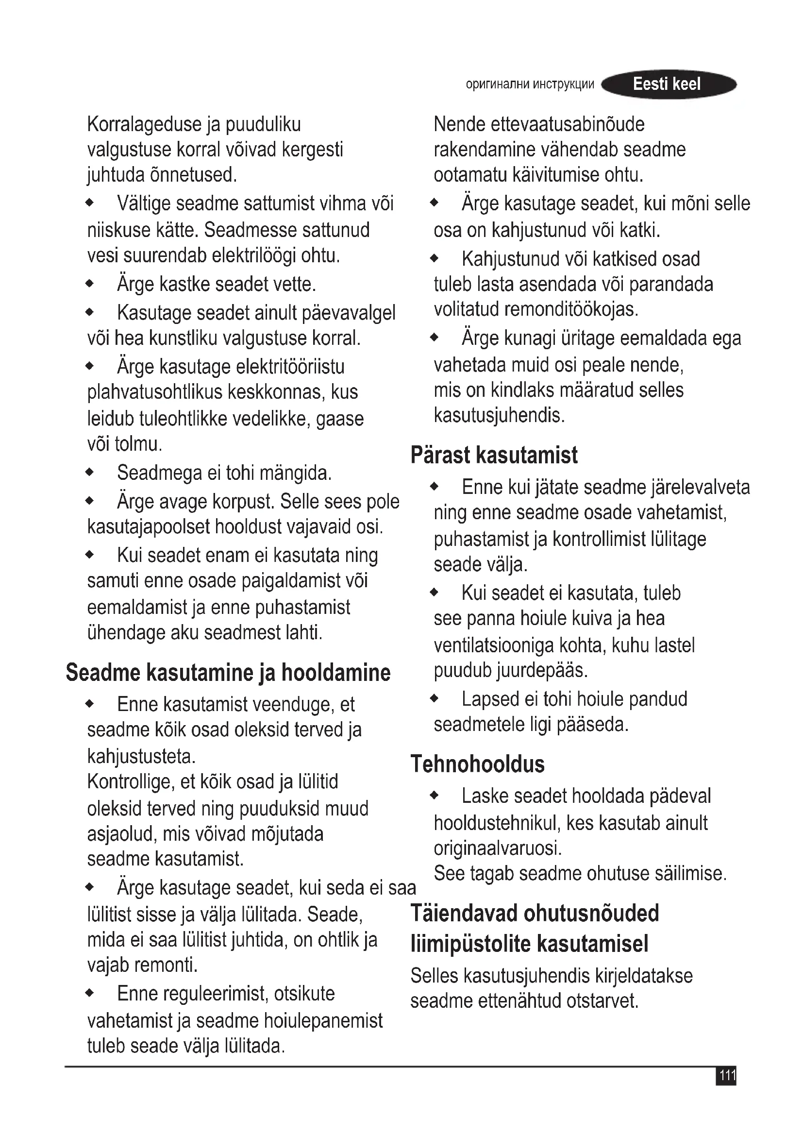 От Black & Decker сме уверени в качеството на изделията си и предлагаме изключителна потребителска гаранция от 24 месеца от датата на закупуването. Тази гаранция е само допълнение към вашите законови права, а не ги определя. Гаранцията е валидна на територията на страните членки на ЕС и на европейската свободна търговска зона. За да изискате гаранция, искът трябва да е в съответствие с Правилата и условията на Black&Decker и трябва да предоставите доказателство за покупка на продавача или на оторизирания сервизен агент. Правилата и условията на 2 годишната гаранция на Black&Decker и адреса на най‑близкия упълномощен сервизен агент можете да намерите на www.2helpU.com, или като се свържете с най‑близкия офис на Black & Decker на адреса, указан в това ръководство. Моля, посетете нашия уеб сайт www.blackanddecker.co.uk, за да регистрирате вашето ново изделие на BLACK+DECKER и да сте в течение на нови изделия и специални оферти. Stanley Black & Decker Phoenicia Business Center Strada Turturelelor, nr 11A, Etaj 6, Modul 15, Sector 3 Bucuresti Telefon: +4021.320. 61. 04/05 Ettenähtud otstarve BLACK+DECKER™-i liimipüstol BCGL115 on mõeldud koduse meisterdus‑ ja käsitöö tegemisel paberi, papi ja muude materjalide kleepimiseks. See seade on mõeldud ainult laiatarbekasutuseks. Üldised hoiatused Hoiatus! Võrgutoitega/ akuga seadmete kasutamisel tuleb alati rakendada põhilisi ohutusabinõusid, sh allpool tooduid, et vähendada tulekahju, elektrilöögi, kehavigastuse ja materiaalse kahju tekkimise ohtu. Enne seadme kasutamist lugege kogu kasutusjuhend tähelepanelikult läbi ning tehke endale selgeks seadme juhtseadeldised ja õiged töövõtted. Selles kasutusjuhendis kirjeldatakse seadme ettenähtud otstarvet. Seadme kasutamine muuks kui ettenähtud otstarbeks või lisaseadmetega, mida selles kasutusjuhendis ei soovitata, võib lõppeda kehavigastustega. Hoiatustes kasutatud termin „seade“ viitab võrgutoitel töötavatele (juhtmega) ja akutoitel töötavatele (juhtmeta) elektritööriistadele. Hoidke kõik hoiatused ja juhised tuleviku tarvis alles. Seadme sees on akud, mis ei ole vahetatavad. Seadme kasutamine Olge seadme kasutamisel alati ettevaatlik. Tööpiirkond peab olema puhas ja korralikult valgustatud.111 Eesti keel оригинални инструкции Korralageduse ja puuduliku valgustuse korral võivad kergesti juhtuda õnnetused. Vältige seadme sattumist vihma või niiskuse kätte. Seadmesse sattunud vesi suurendab elektrilöögi ohtu. Ärge kastke seadet vette. Kasutage seadet ainult päevavalgel või hea kunstliku valgustuse korral. Ärge kasutage elektritööriistu plahvatusohtlikus keskkonnas, kus leidub tuleohtlikke vedelikke, gaase või tolmu. Seadmega ei tohi mängida. Ärge avage korpust. Selle sees pole kasutajapoolset hooldust vajavaid osi. Kui seadet enam ei kasutata ning samuti enne osade paigaldamist või eemaldamist ja enne puhastamist ühendage aku seadmest lahti. Seadme kasutamine ja hooldamine Enne kasutamist veenduge, et seadme kõik osad oleksid terved ja kahjustusteta. Kontrollige, et kõik osad ja lülitid oleksid terved ning puuduksid muud asjaolud, mis võivad mõjutada seadme kasutamist. Ärge kasutage seadet, kui seda ei saa lülitist sisse ja välja lülitada. Seade, mida ei saa lülitist juhtida, on ohtlik ja vajab remonti. Enne reguleerimist, otsikute vahetamist ja seadme hoiulepanemist tuleb seade välja lülitada. Nende ettevaatusabinõude rakendamine vähendab seadme ootamatu käivitumise ohtu. Ärge kasutage seadet, kui mõni selle osa on kahjustunud või katki. Kahjustunud või katkised osad tuleb lasta asendada või parandada volitatud remonditöökojas. Ärge kunagi üritage eemaldada ega vahetada muid osi peale nende, mis on kindlaks määratud selles kasutusjuhendis. Pärast kasutamist Enne kui jätate seadme järelevalveta ning enne seadme osade vahetamist, puhastamist ja kontrollimist lülitage seade välja. Kui seadet ei kasutata, tuleb see panna hoiule kuiva ja hea ventilatsiooniga kohta, kuhu lastel puudub juurdepääs. Lapsed ei tohi hoiule pandud seadmetele ligi pääseda. Tehnohooldus Laske seadet hooldada pädeval hooldustehnikul, kes kasutab ainult originaalvaruosi. See tagab seadme ohutuse säilimise. Täiendavad ohutusnõuded liimipüstolite kasutamisel Selles kasutusjuhendis kirjeldatakse seadme ettenähtud otstarvet.112 Eesti keel оригинални инструкции Mistahes tarvikute või lisaseadmete kasutamine või seadme kasutamine viisil, mida selles kasutusjuhendis ei soovitata, võib põhjustada kehavigastuse ohtu ja/ või varalist kahju. Seadme hooletul kasutamisel võib tekkida tulekahju, seetõttu: tuleb olla ettevaatlik, kui kasutate seadet kohas, kus on tuleohtlikke materjale; ärge hoidke seadet pikemat aega ühe ja sama koha peal; ärge kasutage seadet plahvatusohtlikus keskkonnas; arvestage, et kuumus võib kanduda varjatud tuleohtlikele materjalidele; laske seadmel alati enne hoiulepanemist maha jahtuda; ärge jätke sisselülitatud seadet järelevalveta. Ärge puudutage liimipüstoli kuumenenud otsikut. Selle seadme töötemperatuur on ligikaudu 199 °C. Hoidke käsi eemal kuumenenud otsikust ja tööpiirkonnast. Kuumus võib kanduda läbi detaili. Kasutage detaili hoidmiseks pitskruve või tange. Küttekeha hakkab kuu