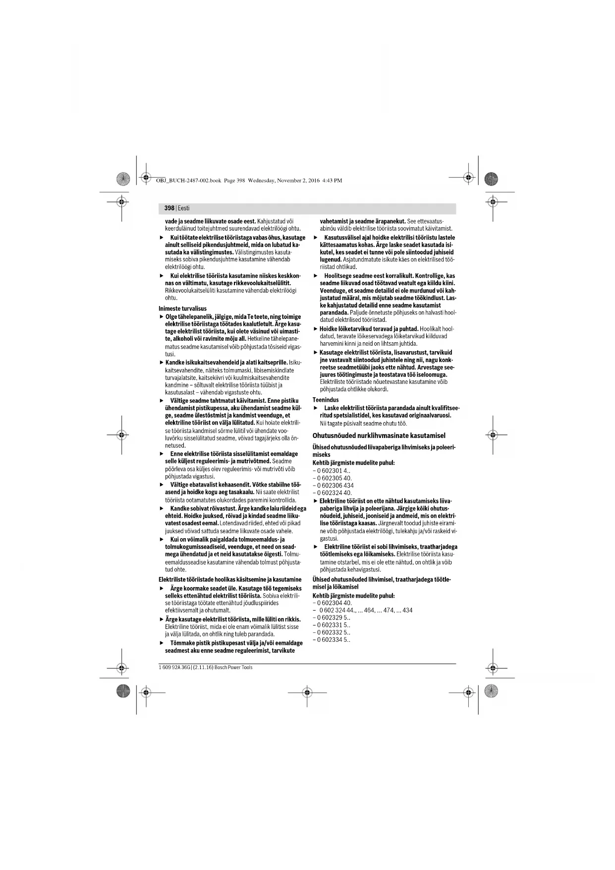 - – 0 602305 40. – 0 602306 434 – 0 602324 40. Elektriline tööriist on ette nähtud kasutamiseks liiva- paberiga lihvija ja poleerijana. Järgige kõiki ohutus- nõudeid, juhiseid, jooniseid ja andmeid, mis on elektri- lise tööriistaga kaasas. Järgnevalt toodud juhiste eirami- ne võib põhjustada elektrilöögi, tulekahju ja/või raskeid vi- gastusi. Elektriline tööriist ei sobi lihvimiseks, traatharjadega töötlemiseks ega lõikamiseks. Elektrilise tööriista kasu- tamine otstarbel, mis ei ole ette nähtud, on ohtlik ja võib põhjustada kehavigastusi. Ühised ohutusnõuded lihvimisel, traatharjadega töötle- misel ja lõikamisel Kehtib järgmiste mudelite puhul: – 0 602304 40. – 0 602 324 44., p. 464