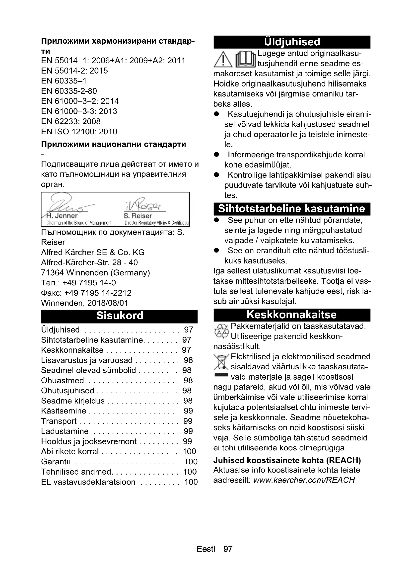 Allakirjutanud tegutsevad juhatuse ülesan- del ja volitusega. Dokumentatsioonivolinik: S. Reiser Alfred Kärcher SE & Co. KG Alfred-Kärcher-Str. 28 - 40 71364 Winnenden (Germany) Tel: +49 7195 14-0 Faks: +49 7195 14-2212 Winnenden, 2018/08/01 Elektriühendus Pinge V 220-