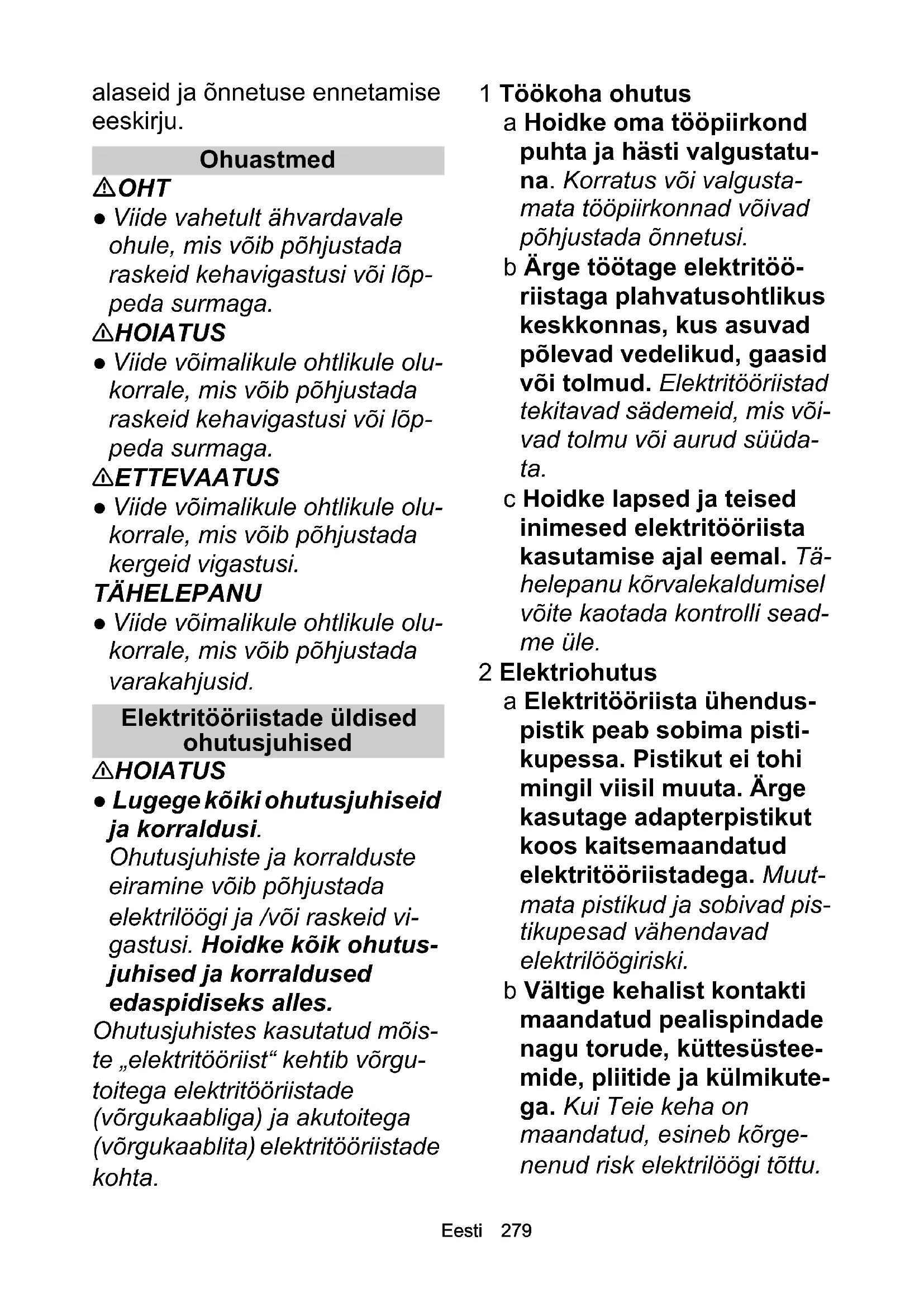 - EL vastavusdeklaratsioon Chairman of the Board of ManagementDirector Regulatory Affairs & Certification H. Jenner S. ReiserEesti 279 alaseid ja õnnetuse ennetamise eeskirju. Ohuastmed OHT ● Viide vahetult ähvardavale ohule, mis võib põhjustada raskeid kehavigastusi või lõp- peda surmaga. 몇 HOIATUS ● Viide võimalikule ohtlikule olu- korrale, mis võib põhjustada raskeid kehavigastusi või lõp- peda surmaga. 몇 ETTEVAATUS ● Viide võimalikule ohtlikule olu- korrale, mis võib põhjustada kergeid vigastusi. TÄHELEPANU ● Viide võimalikule ohtlikule olu- korrale, mis võib põhjustada varakahjusid. Elektritööriistade üldised ohutusjuhised 몇 HOIATUS ● Lugege kõiki ohutusjuhiseid ja korraldusi. Ohutusjuhiste ja korralduste eiramine võib põhjustada elektrilöögi ja /või raskeid vi- gastusi. Hoidke kõik ohutus- juhised ja korraldused edaspidiseks alles. Ohutusjuhistes kasutatud mõis- te „elektritööriist“ kehtib võrgu- toitega elektritööriistade (võrgukaabliga) ja akutoitega (võrgukaablita) elektritööriistade kohta. 1 Töökoha ohutus a Hoidke oma tööpiirkond puhta ja hästi valgustatu- na. Korratus või valgusta- mata tööpiirkonnad võivad põhjustada õnnetusi. b Ärge töötage elektritöö- riistaga plahvatusohtlikus keskkonnas, kus asuvad põlevad vedelikud, gaasid või tolmud. Elektritööriistad tekitavad sädemeid, mis või- vad tolmu või aurud süüda- ta. c Hoidke lapsed ja teised inimesed elektritööriista kasutamise ajal eemal. Tä- helepanu kõrvalekaldumisel võite kaotada kontrolli sead- me üle. 2 Elektriohutus a Elektritööriista ühendus- pistik peab sobima pisti- kupessa. Pistikut ei tohi mingil viisil muuta. Ärge kasutage adapterpistikut koos kaitsemaandatud elektritööriistadega. Muut- mata pistikud ja sobivad pis- tikupesad vähendavad elektrilöögiriski. b Vältige kehalist kontakti maandatud pealispindade nagu torude, küttesüstee- mide, pliitide ja külmikute- ga. Kui Teie keha on maandatud, esineb kõrge- nenud risk elektrilöögi tõttu.280 Eesti c Hoidke elektritööriistad vihmast või niiskusest ee- mal. Vee tungimine elektri- tööriista sisse suurendab elektrilöögiriski. d Ärge väärtarvitage kaablit elektritööriista kandmi- seks, ülesriputamiseks või pistiku väljatõmbamiseks pistikupesast. Hoidke kaablit eemal kuumusest, õlist, teravatest servadest või liikuvatest sead- meosadest. Kahjustatud või sassiläinud ühenduskaablid suurendavad elektrilöögiris- ki. e Töötades elektritööriista- ga välitingimustes, kasu- tage ainult pikenduskaableid, mis on ka välipiirkonna jaoks so- bivad. Välipiirkonna jaoks sobiliku pikenduskaabli ka- sutamine vähendab elektri- löögiriski. f Kui elektritööriista käita- mine niiskes ümbruses on vältimatu, kasutage rikke- voolu kaitselülitit. Rikke- voolu kaitselüliti kasutamine vähendab elektrilöögiriski. 3 Inimeste ohutus a Olge tähelepanelik, jälgi- ge, mida Te teete ja käitu- ge elektritööriistaga töötamisel mõistlikult. Är- ge kasutage elektritööriis- ta, kui olete väsinud või uimastite, alkoholi või ra- vimite mõju all. Üks tähele- panematuse hetk elektritööriista kasutamisel võib põhjustada tõsiseid vi- gastusi. b Kandke isiklikku kaitseva- rustust ja alati kaitseprille. Isikliku kaitsevarustuse na- gu tolmumaski, libisemis- kindlate turvajalatsite, kaitsekiivri või kuulmiskait- sevahendite kandmine, ole- nevalt elektritööriista liigist ja kasutamisest, vähendab vi- gastuseriski. c Vältige tahtmatut käiku- võtmist. Veenduge, et elektritööriist on välja lüli- tatud, enne kui Te selle voolutoite ja/või aku külge ühendate, vastu võtate või seda kannate. Kui Teil on elektritööriista kandmisel sõrm lülitil või kui ühendate seadme sisselülitatud sei- sundis voolutoitega, võib see põhjustada õnnetusjuh- tumeid. d Eemaldage seadistustöö- riistad või kruvivõtmed en- ne elektritööriista sisselülitamist. Pöörleval seadmeosal asuv tööriist või võti võib põhjustada vigastu- si. e Vältige ebanormaalset ke- hahoidu. Hoolitsege kind- la seisuasendi eest jaEesti 281 hoidke igal ajal tasakaalu. Nii saate elektritööriista oo- tamatutes olukordades pa- remini kontrollida. f Kandke sobivat riietust. Ärge kandke avarat riie- tust ega ehteid. Hoidke juuksed, riided ja kindad liikuvatest osadest eemal. Liikuvad osad võivad lahtis- test riietest, kinnastest, ehe- test või pikkadest juustest kinni haarata. g Kui tolmuimemis- ja -ko- gumisseadiseid saab monteerida, siis veendu- ge, et need on ühendatud ja neid kasutatakse õiges- ti. Tolmuimemistoru kasuta- mine võib vähendada tolmust tingitud ohte. 4 Elektritööriista kasutamine ja käsitsemine a Ärge koormake seadet üle. Kasutage oma tööks sel- leks ettenähtud elektritöö- riista. Sobiva elektritööriistaga töötate Te paremini ja ohutumalt esita- tud võimsusvahemikus. b Ärge kasutage elektritöö- riista, mille lüliti on defekt- ne. Elektritööriist, mida ei saa enam sisse või välja lüli- tada, on ohtlik ja seda tuleb remontida. c Enne seadme seadistuste tegemist, tarvikuosade va- hetamist või seadme ära- panekut tõmmake pistik pistikupesast välja ja/või eemaldage aku. See ette- vaatusabinõu hoiab ära elektritööriista tahtmatu käi- vitamise. d Hoidke kasutamata elektri- tööriistu lastele kättesaa- matus kohas. Ärge laske seadet kasutada inimestel, kes pole sellega tuttavad või kes pole lugenud käes- olevaid korraldusi. Elektri- tööriistad on ohtlikud, kui neid kasutavad kogenema- tud inimesed. e Hoolitsege elektritööriista- de eest hästi. Kontrollige, kas liikuvad osad talitle- vad laitmatult ega kiilu kin- ni, ega osad pole purunenud või nii kahjus- tatud, et elektritööriista ta- litlus on piiratud. Laske kahjustatud osad enne seadme kasutamist ära re- montida. Paljude õnnetus- juhtumite põhjuseks on halvasti hooldatud elektri- tööriistad. f Hoidke lõiketööriistad te- rava ja puhtana. Hästi h
