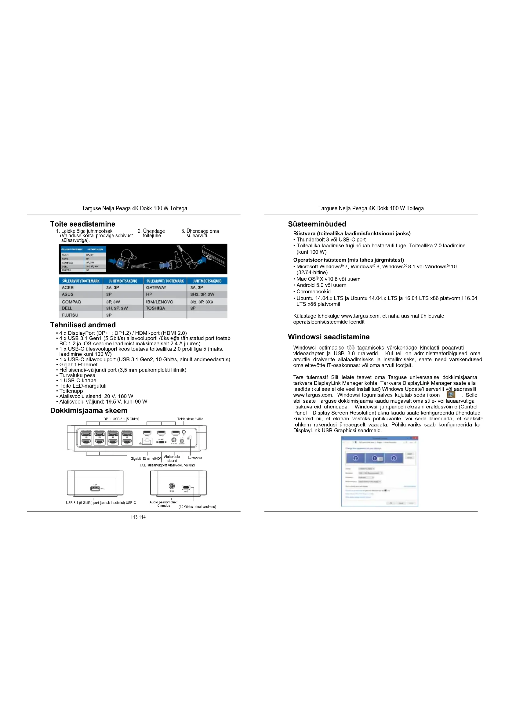 Targuse Nelja Peaga 4K Dokk 100 W Toitega USB-A ühenduseks sülearvutigaÜhendage DOCK570-gaUSB-C ühenduseks sülearvutigaAdapteri tagakülgAdapteri esikülg +113 114 Toite seadistamine