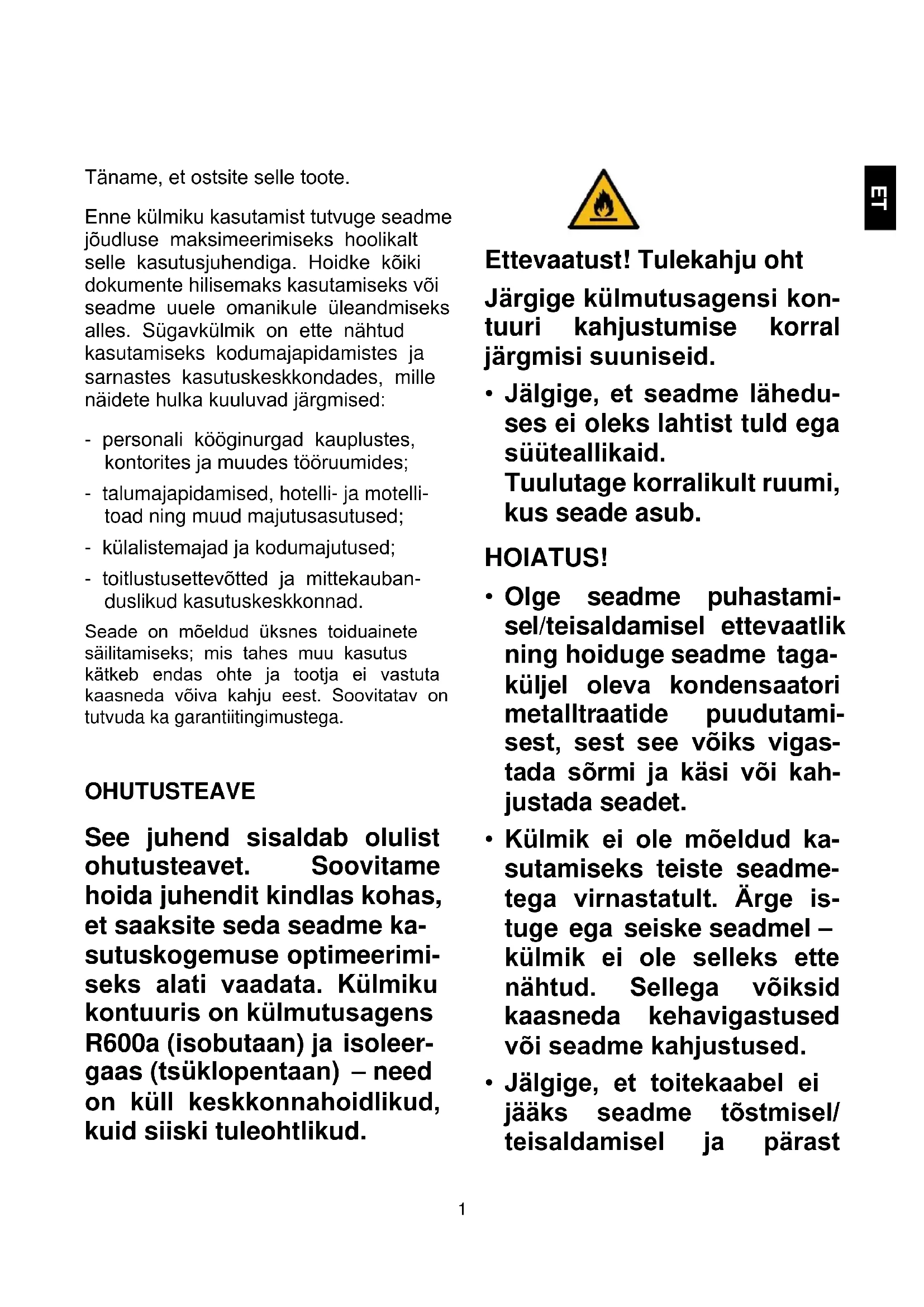 Täname, et ostsite selle toote. Enne külmiku kasutamist tutvuge seadme jõudluse maksimeerimiseks hoolikalt selle kasutusjuhendiga. Hoidke kõiki dokumente hilisemaks kasutamiseks või seadme uuele omanikule üleandmiseks alles. Sügavkülmik on ette nähtud kasutamiseks kodumajapidamistes ja sarnastes kasutuskeskkondades, mille näidete hulka kuuluvad järgmised: - personali kööginurgad kauplustes, kontorites ja muudes tööruumides; - talumajapidamised, hotelli- ja motelli- toad ning muud majutusasutused; - külalistemajad ja kodumajutused; - toitlustusettevõtted ja mittekauban- duslikud kasutuskeskkonnad. Seade on mõeldud üksnes toiduainete säilitamiseks; mis tahes muu kasutus kätkeb endas ohte ja tootja ei vastuta kaasneda võiva kahju eest. Soovitatav on tutvuda ka garantiitingimustega. OHUTUSTEAVE See juhend sisaldab olulist ohutusteavet. Soovitame hoida juhendit kindlas kohas, et saaksite seda seadme ka- sutuskogemuse optimeerimi- seks alati vaadata. Külmiku kontuuris on külmutusagens R600a (isobutaan) ja isoleer- gaas (tsüklopentaan) – need on küll keskkonnahoidlikud, kuid siiski tuleohtlikud. Ettevaatust! Tulekahju oht Järgige külmutusagensi kon- tuuri kahjustumise korral järgmisi suuniseid.