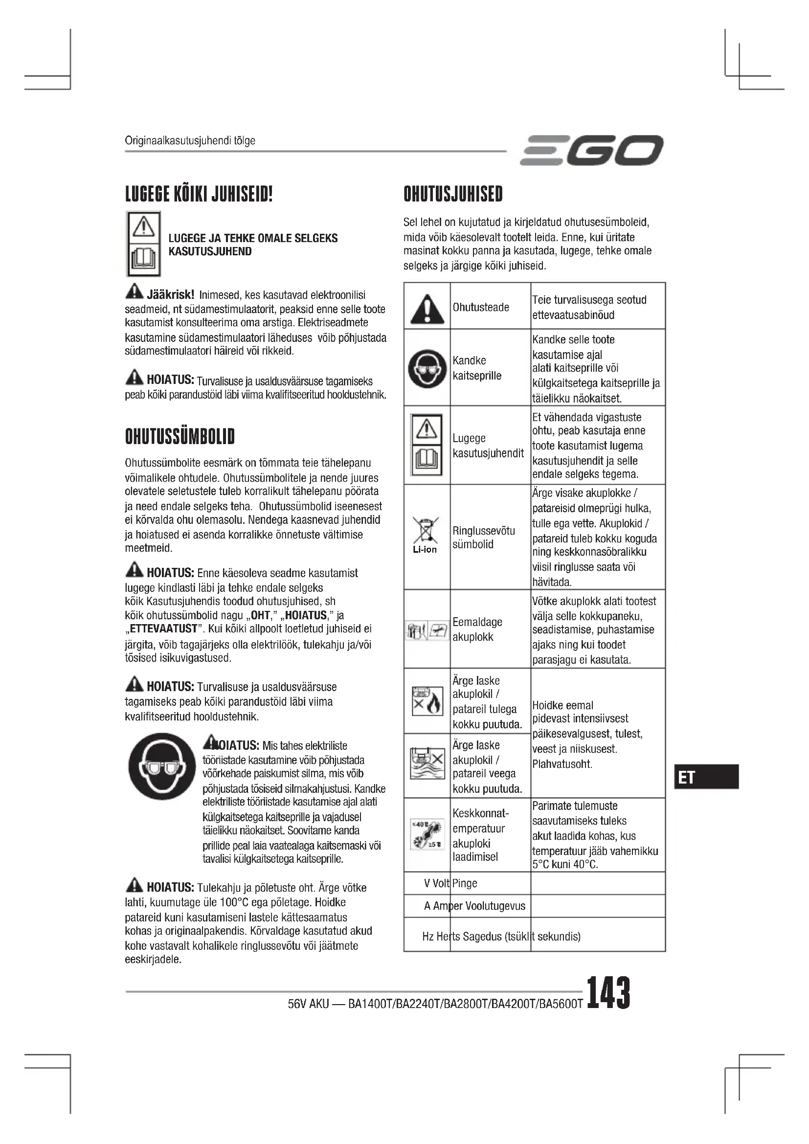 MÄRKUS: Liitiumioonakud toimetatakse kohale osaliselt laetuna. Enne esmakordset kasutamist laadige aku täielikult täis. MÄRKUS: See aku on varustatud täiustatud ise-hoolduse funktsiooniga, mis aitab pikendada aku eluiga. Sõltuvalt aku laetuse tasemest tühjendab see end automaatselt ise56V AKU — BA1400T/BA2240T/BA2800T/BA4200T/BA5600T 147 pärast ühe kuu pikkust ladustamist. Pärast seda ise-hoolduse toimingut jääb aku puhkerežiimile ja säilitab 30% oma laetuse tasemest. Kui ladustate akut kuu aega või kauem, tuleb see enne järgmist kasutamist uuetsi täielikult täis laadida. (Ei kehti BA2240T puhul, mis on varustatud teistsuguse tänapäevase tehnoloogiaga, mis pikendab aku eluiga.)Enne uuesti laadimist ei ole vaja akut tühjaks laadida. Liitiumioonakut on võimalik igal ajal laadida ja sellel ei teki „mälu”, kui seda ainult pärast osalist tühjakslaadimist laadida. Kasutage toiteindikaatorit, et teada saada, millal akut laadida on vaja.KUIDAS AKUT LAADIDAJärgige EGO CH5500E kiirlaadija või CH2100E laadija kasutusjuhendit.AKU PAIGALDAMINE JA EEMALDAMINEJärgige konkreetse EGO toote kasutusjuhendit. HOOLDUS HOIATUS: Tõsiste isikuvigastuste vältimiseks eemaldage aku tööriistast alati lisatarvikute vahetamise, puhastamise ja hooldustööde teostamise ajaks. HOIATUS: Remondiks võib kasutada ainult identseid EGO originaalvaruosi. Mis tahes muude osade kasutamine võib põhjustada ohtlikke olukordi või seadet vigastada. HOIATUS: Aku puhastamiseks ei ole soovitatav kasutada kokkusurutud kuiva õhku. Kui kokkusurutud õhu kasutamine on ainus võimalik viis, kandke kindlasti näokaitset või külgkaitsetega kaitseprille. Kui tööpiirkond on tolmune, kandke ka tolmumaski.ÜLDINE HOOLDUSVältige plastosade kasutamisel lahustite kasutamist. Enamik plastmasse on kaubanduslike lahustite suhtes tundlikud ja võivad nende kasutamisel kahjustada saada. Kasutage mustuse, tolmu, õli, määrete jms eemaldamiseks puhtaid riidest lappe. HOIATUS: Ärge kunagi laske pidurivedelikel, bensiinil, nafta baasil toodetel, läbitungivatel õlidel jms puutuda kokku plastosadega. Kemikaalid võivad plastikut vigastada, nõrgestada või hävitada, mille tulemusena võivad tekkida tõsised isikuvigastused. HOIATUS: LÜHISEST TULENEVA TULEKAHJU, ISIKUVIGASTUSE VÕI TOOTE KAHJUSTUMISE OHU VÄHENDAMISEKS ÄRGE KUNAGI UPUTAGE TÖÖRIISTA, AKUT VÕI LAADIJAT VEDELIKKU EGA LASKE VEDELIKUL SEADMETESSE VOOLATA. LÜHISE VÕIVAD PÕHJUSTADA KORROSIIVSED VÕI ELEKTRIT JUHTIVAD VEDELIKUD, NT. MEREVESI, TEATUD TÖÖSTUSLIKUD KEMIKAALID JA VALGENDI VÕI VALGENDIT SISALDAVAD TOOTED JNE. AKUD Akuplokki kuuluvad laetavad liitiumioonakud. Tööaeg pärast iga laadimist sõltub tehtava töö tüübist.Selle seadme akud on ette nähtud võimaldama maksimaalset probleemidevaba kasutusiga. Nagu kõik akud, vananevad lõpuks ka need.Ärge võtke akuplokki lahti ega üritage akusid välja vahetada. Akude käsitlemine, eriti sõrmuste ja ehete kandmise ajal, võib põhjustada tõsiseid põletusi.Aku maksimaalse võimaliku kasutusaja saavutamiseks tuleb lugeda käesolevat kasutusjuhendit ning see endale selgeks teha. č Kui akuplokki ei kasutata, tuleks laadija toitevõrgust lahti ühendada ja liitiumioonakud eemaldada. Kui soovite liitiumioonakusid üle 30 päeva ladustada:Ladustage liitiumioonakusid kohas, kus temperatuur on alla 26°C ja kus ei ole niiske. č Ladustage liitiumioonakusid 30%-50% laetuse tasemel. č Iga kuue kuu pikkude ladustamisperioodi järel laadige liitiumioonakud täielikult täis. č Akude välispinda võib puhastada riidest lapi või pehme mittemetalse harjaga.AKUPLOKI EEMALDAMINE JA ETTEVALMISTUS RINGLUSSEVÕTUKS Li-ion Ärge visake aku laadijat egd akusid / laetavaid akusid olmeprügi hulka!Vastavalt Euroopa Liidu eriaruandele nr 2012/19/EU tuleb elektri- ja elektroonikaseadmed, mis pole enam kasutatavad, ning, vastavalt direktiivile 2006/66/EÜ, ka defektsed või kasutatud akuplokid / patareid, eraldi kokku koguda ja utiliseerida keskkonnasõbralikul viisil. Konsulteerige kohaliku jäätmekäitlusega tegeleva ametkonnaga, et saada informatsiooni ringlussevõtu ja / või kõrvaldamise võimaluste kohta. HOIATUS: Pärast akuploki eemaldamist kõrvaldamise või utiliseerimise eesmärgil katke akuploki klemmid vastupidava kleeplindiga. Ärge üritage akuplokki hävitada ega lahti võtta ega ühtegi selle osa eemaldada. Liitiumioonakud tuleb nõuetekohaselt ringlusse saata või utiliseerida. Ärge kunagi puudutage klemme metallesemetega ega kehaosadega, sest see võib tekitada lühist. Hoidke lastele kättesaamatus kohas. Nende juhiste eiramine võib põhjustada tulekahju ja/või tõsiseid vigastusi.56V AKU — BA1400T/BA2240T/BA2800T/BA4200T/BA5600T148