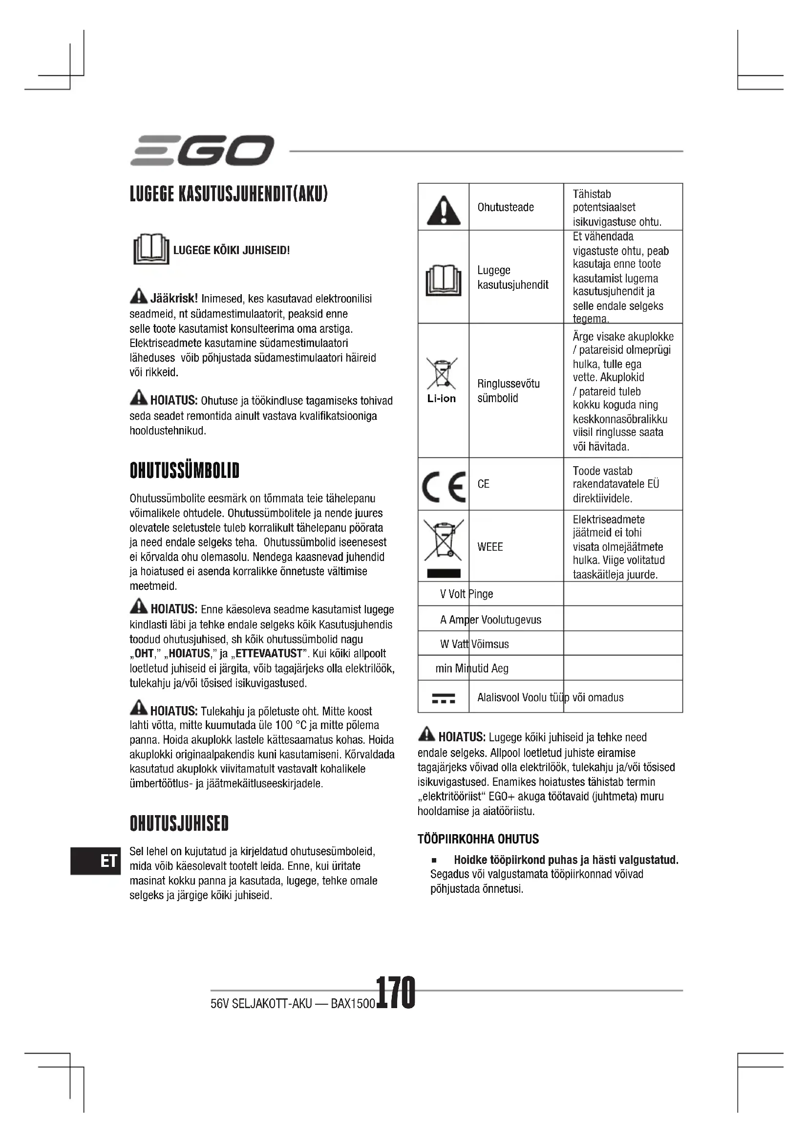 LUGEGE KASUTUSJUHENDIT(AKU) LUGEGE KÕIKI JUHISEID! Jääkrisk! Inimesed, kes kasutavad elektroonilisi seadmeid, nt südamestimulaatorit, peaksid enne selle toote kasutamist konsulteerima oma arstiga. Elektriseadmete kasutamine südamestimulaatori läheduses võib põhjustada südamestimulaatori häireid või rikkeid. HOIATUS: Ohutuse ja töökindluse tagamiseks tohivad seda seadet remontida ainult vastava kvalikatsiooniga hooldustehnikud. OHUTUSSÜMBOLID Ohutussümbolite eesmärk on tõmmata teie tähelepanu võimalikele ohtudele. Ohutussümbolitele ja nende juures olevatele seletustele tuleb korralikult tähelepanu pöörata ja need endale selgeks teha. Ohutussümbolid iseenesest ei kõrvalda ohu olemasolu. Nendega kaasnevad juhendid ja hoiatused ei asenda korralikke õnnetuste vältimise meetmeid. HOIATUS: Enne käesoleva seadme kasutamist lugege kindlasti läbi ja tehke endale selgeks kõik Kasutusjuhendis toodud ohutusjuhised, sh kõik ohutussümbolid nagu „OHT,” „HOIATUS,” ja „ETTEVAATUST”. Kui kõiki allpoolt loetletud juhiseid ei järgita, võib tagajärjeks olla elektrilöök, tulekahju ja/või tõsised isikuvigastused. HOIATUS: Tulekahju ja põletuste oht. Mitte koost lahti võtta, mitte kuumutada üle 100 °C ja mitte põlema panna. Hoida akuplokk lastele kättesaamatus kohas. Hoida akuplokki originaalpakendis kuni kasutamiseni. Kõrvaldada kasutatud akuplokk viivitamatult vastavalt kohalikele ümbertöötlus- ja jäätmekäitluseeskirjadele. OHUTUSJUHISED Sel lehel on kujutatud ja kirjeldatud ohutusesümboleid, mida võib käesolevalt tootelt leida. Enne, kui üritate masinat kokku panna ja kasutada, lugege, tehke omale selgeks ja järgige kõiki juhiseid.OhutusteadeTähistab potentsiaalset isikuvigastuse ohtu.Lugege kasutusjuhendit Et vähendada vigastuste ohtu, peab kasutaja enne toote kasutamist lugema kasutusjuhendit ja selle endale selgeks tegema. Li-ion Ringlussevõtu sümbolidÄrge visake akuplokke / patareisid olmeprügi hulka, tulle ega vette. Akuplokid / patareid tuleb kokku koguda ning keskkonnasõbralikku viisil ringlusse saata või hävitada. Toode vastab rakendatavatele EÜ direktiividele.WEEE Elektriseadmete jäätmeid ei tohi visata olmejäätmete hulka. Viige volitatud taaskäitleja juurde.V Volt PingeA Amper VoolutugevusW Vatt Võimsusmin Minutid AegAlalisvool Voolu tüüp või omadus HOIATUS: Lugege kõiki juhiseid ja tehke need endale selgeks. Allpool loetletud juhiste eiramise tagajärjeks võivad olla elektrilöök, tulekahju ja/või tõsised isikuvigastused. Enamikes hoiatustes tähistab termin „elektritööriist“ EGO+ akuga töötavaid (juhtmeta) muru hooldamise ja aiatööriistu.