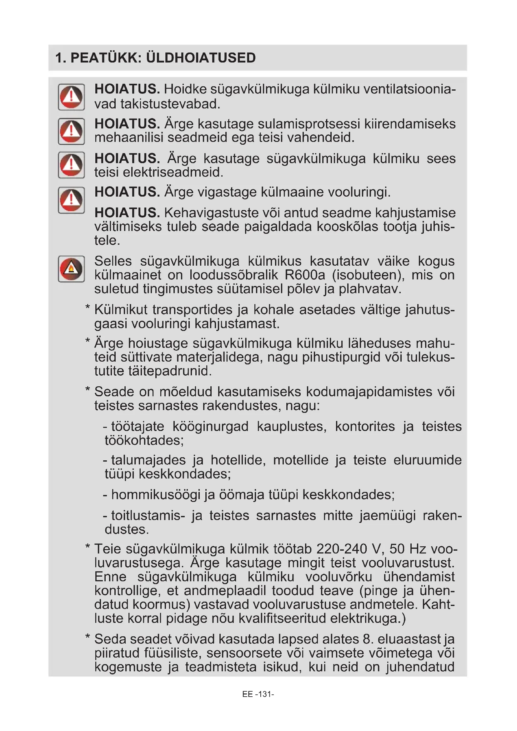 HOIATUS. Hoidke sügavkülmikuga külmiku ventilatsioonia- vad takistustevabad. HOIATUS. Ärge kasutage sulamisprotsessi kiirendamiseks mehaanilisi seadmeid ega teisi vahendeid. HOIATUS. Ärge kasutage sügavkülmikuga külmiku sees teisi elektriseadmeid. HOIATUS. Ärge vigastage külmaaine vooluringi. HOIATUS. Kehavigastuste või antud seadme kahjustamise vältimiseks tuleb seade paigaldada kooskõlas tootja juhis- tele. Selles sügavkülmikuga külmikus kasutatav väike kogus külmaainet on loodussõbralik R600a (isobuteen), mis on suletud tingimustes süütamisel põlev ja plahvatav.