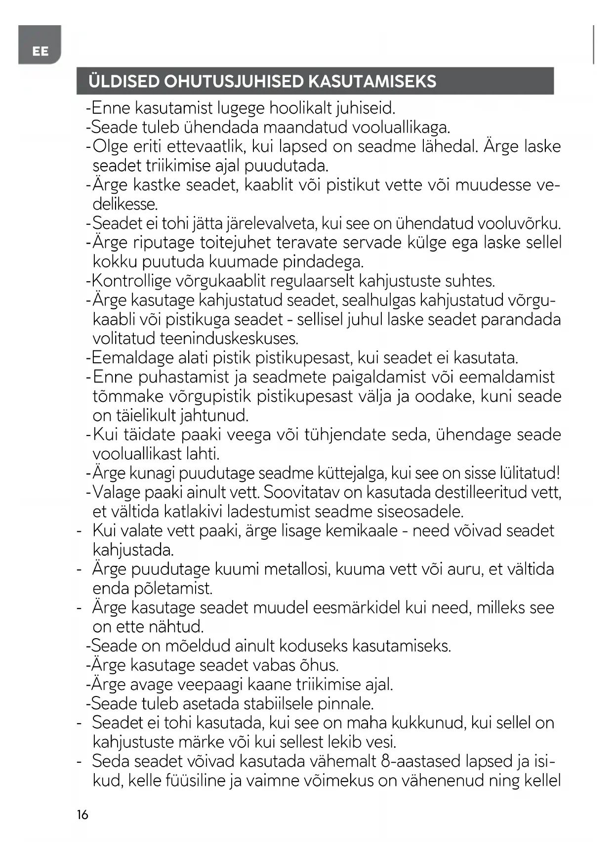 Valage paaki ainult vett. Soovitatav on kasutada destilleeritud vett, et vältida katlakivi ladestumist seadme siseosadele. - Kui valate vett paaki, ärge lisage kemikaale - need võivad seadet kahjustada. - Ärge puudutage kuumi metallosi, kuuma vett või auru, et vältida enda põletamist. - Ärge kasutage seadet muudel eesmärkidel kui need, milleks see on ette nähtud. - Seade on mõeldud ainult koduseks kasutamiseks. - Ärge kasutage seadet vabas õhus. - Ärge avage veepaagi kaane triikimise ajal. - Seade tuleb asetada stabiilsele pinnale. - Seadet ei tohi kasutada, kui see on maha kukkunud, kui sellel on kahjustuste märke või kui sellest lekib vesi. - Seda seadet võivad kasutada vähemalt 8-aastased lapsed ja isi