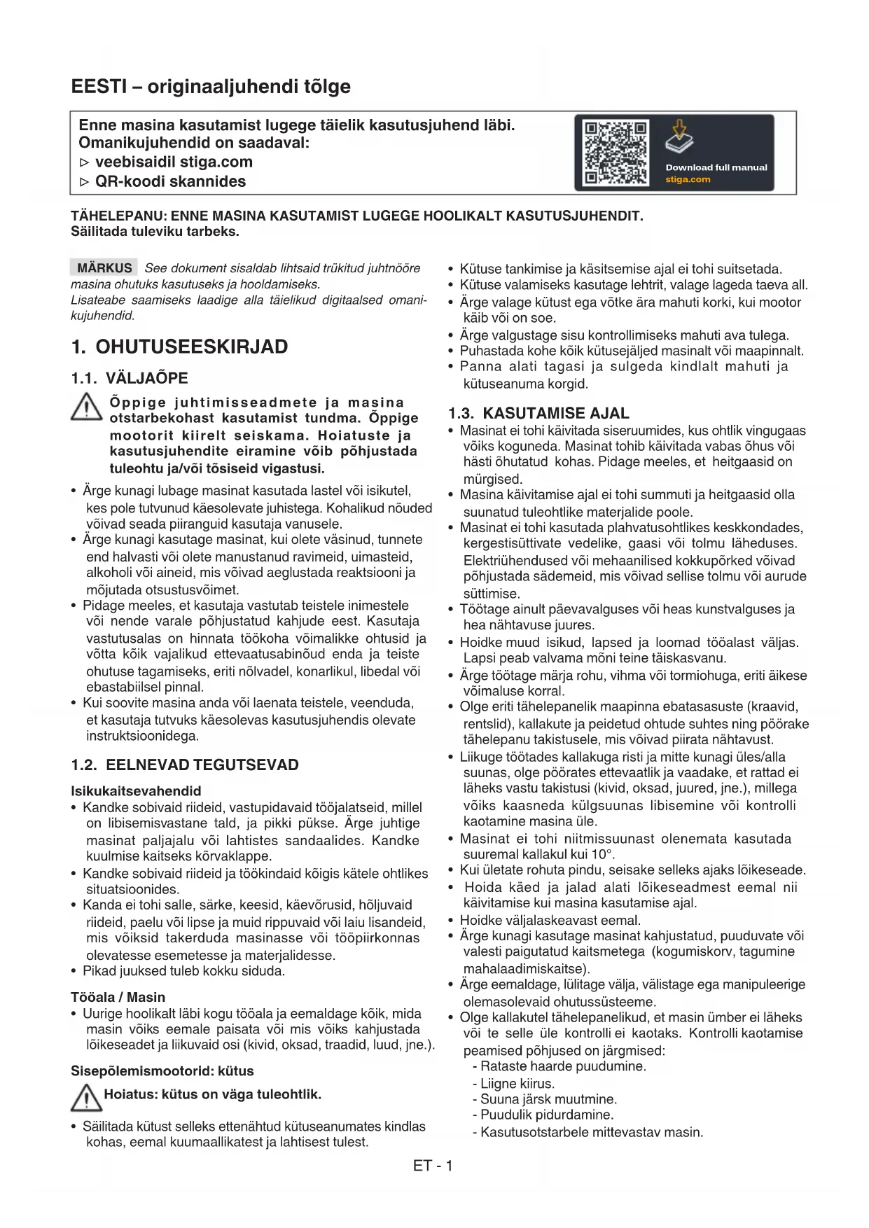 - Tuleohutuse eesmärgil ei tohi töötava mootoriga masinat jätta kõrge rohu sisse.