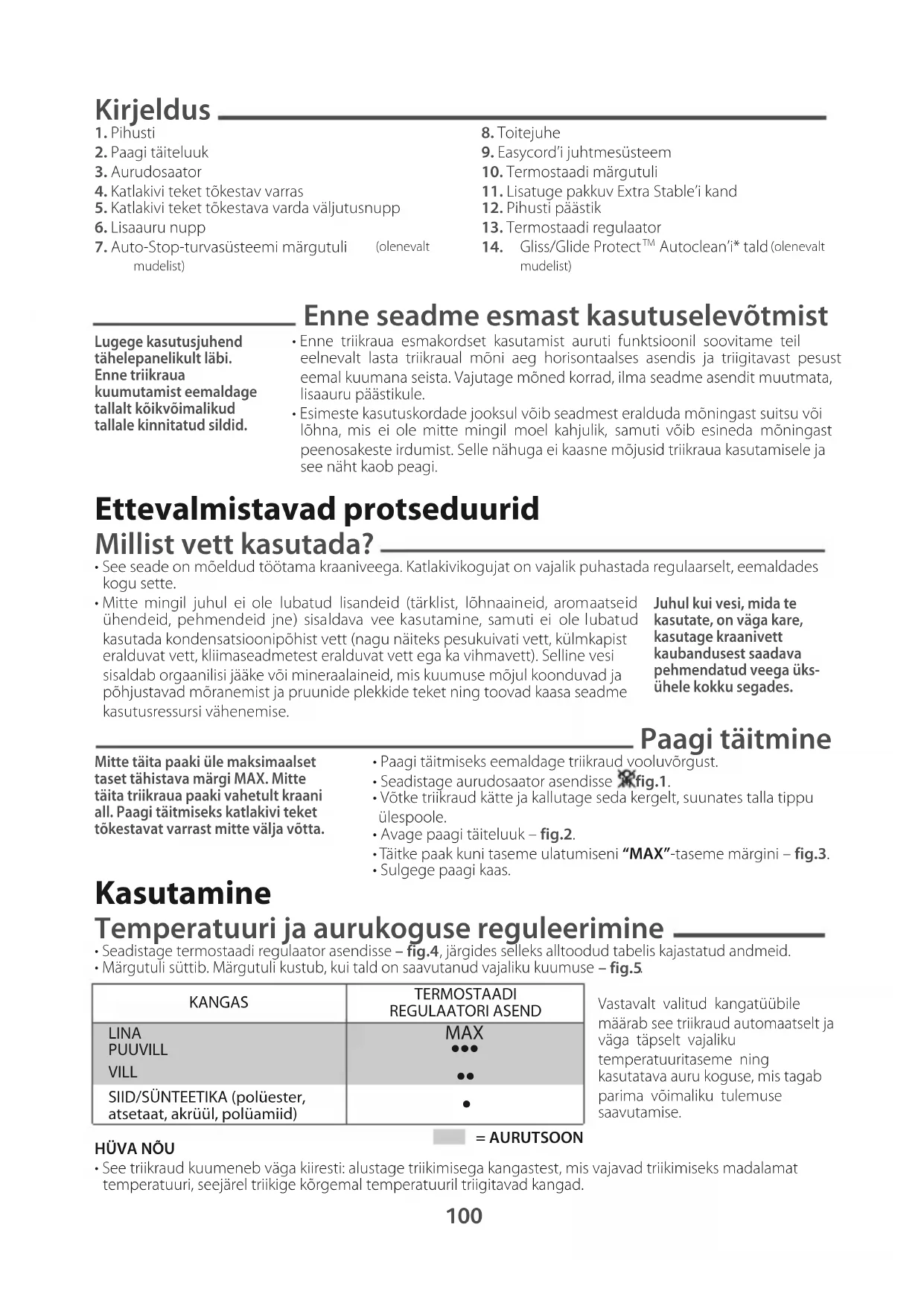 - Valige triigitavale kangatüübile vastav temperatuur. • Seadistage aurudosaator asendisse – fig.1.• Märgutule kustumisel võite triikimisega alustada. „Plus”-funktsioon Gliss/Glide Protect