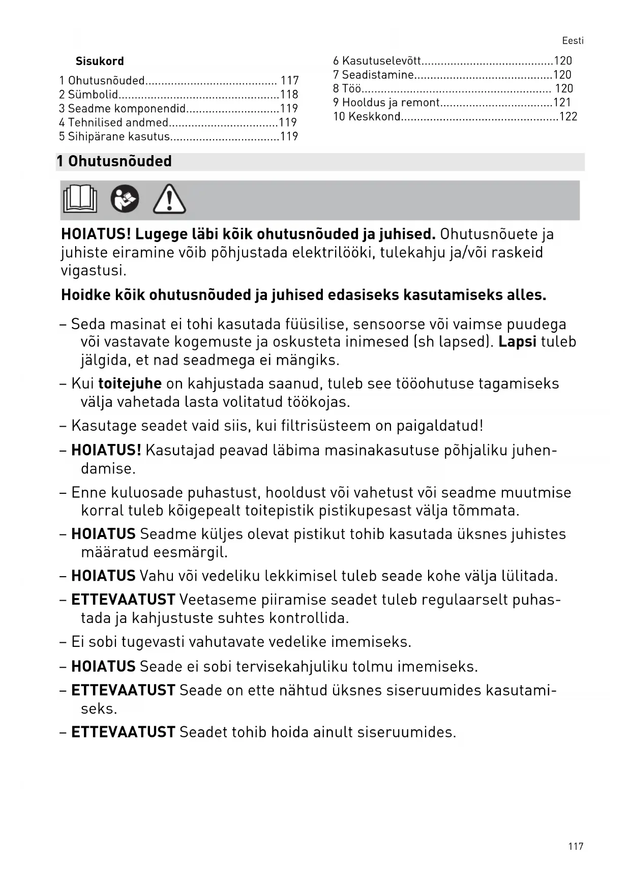 HOIATUS Lubamatu pinge või sagedus! Vigastuste oht ► Pöörake tähelepanu andmesildil toodud andmetele. ► Pöörake tähelepanu riigis esinevatele eripäradele.
