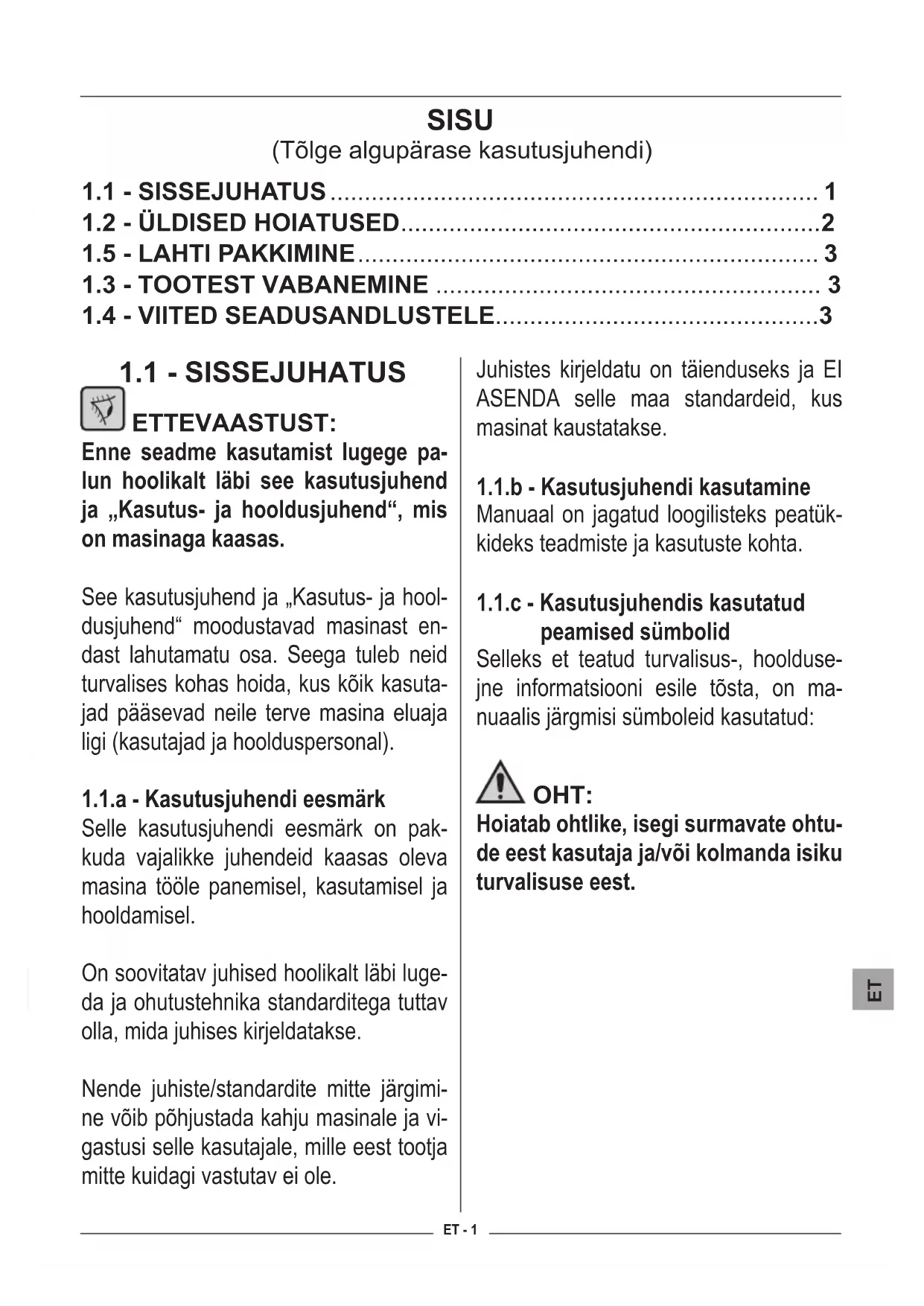 ETTEVAASTUST: Enne seadme kasutamist lugege pa- lun hoolikalt läbi see kasutusjuhend ja „Kasutus- ja hooldusjuhend“, mis on masinaga kaasas. See kasutusjuhend ja „Kasutus- ja hool- dusjuhend“ moodustavad masinast en- dast lahutamatu osa. Seega tuleb neid turvalises kohas hoida, kus kõik kasuta- jad pääsevad neile terve masina eluaja ligi (kasutajad ja hoolduspersonal).