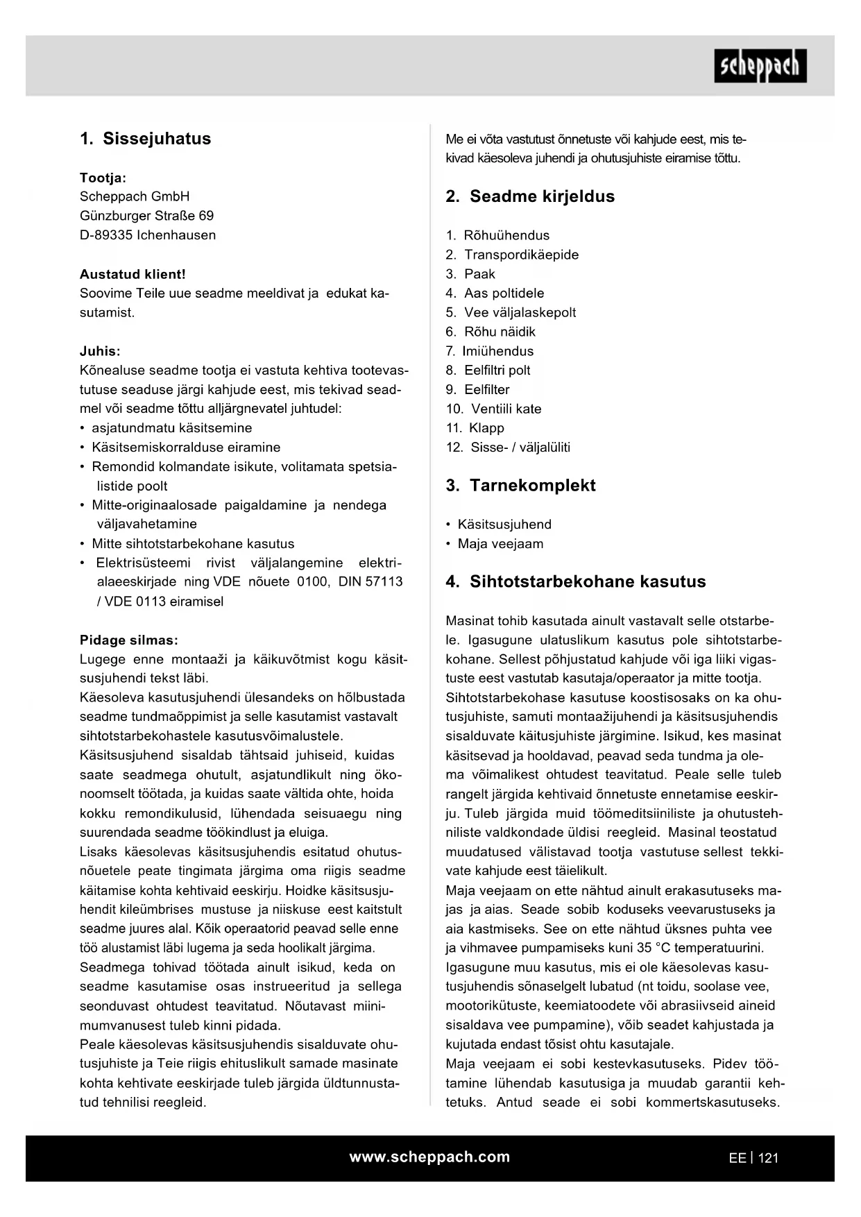 Tootja: Scheppach GmbH Günzburger Straße 69 D-89335 Ichenhausen Austatud klient! Soovime Teile uue seadme meeldivat ja edukat ka- sutamist. Juhis: Kõnealuse seadme tootja ei vastuta kehtiva tootevas- tutuse seaduse järgi kahjude eest, mis tekivad sead- mel või seadme tõttu alljärgnevatel juhtudel: