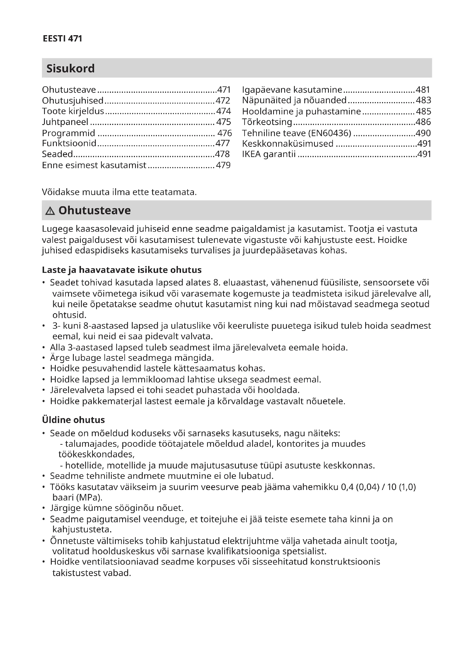 - Hoidke ventilatsiooniavad seadme korpuses või sisseehitatud konstruktsioonis takistustest vabad. Ohutusteave ..................................................471 Ohutusjuhised .............................................. 472 Toote kirjeldus .............................................. 474 Juhtpaneel .................................................... 475 Programmid ................................................. 476 Funktsioonid ................................................. 477 Seaded ........................................................... 478 Enne esimest kasutamist ............................ 479 Igapäevane kasutamine .............................. 481 Näpunäited ja nõuanded ............................ 483 Hooldamine ja puhastamine ...................... 485 Tõrkeotsing ...................................................486 Tehniline teave (EN60436) ..........................490 Keskkonnaküsimused ..................................491 IKEA garantii ..................................................491EESTI 472