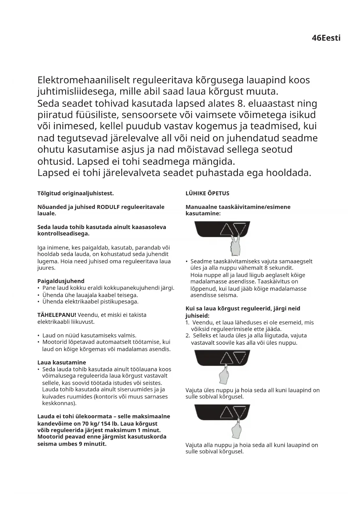 vastavalt soovile kas alla või üles nuppu. Vajuta üles nuppu ja hoia seda all kuni lauapind on sulle sobival kõrgusel. Vajuta alla nuppu ja hoia seda all kuni lauapind on sulle sobival kõrgusel. Elektromehaaniliselt reguleeritava kõrgusega lauapind koos juhtimisliidesega, mille abil saad laua kõrgust muuta. Seda seadet tohivad kasutada lapsed alates 8. eluaastast ning piiratud füüsiliste, sensoorsete või vaimsete võimetega isikud või inimesed, kellel puudub vastav kogemus ja teadmised, kui nad tegutsevad järelevalve all või neid on juhendatud seadme ohutu kasutamise asjus ja nad mõistavad sellega seotud ohtusid. Lapsed ei tohi seadmega mängida. Lapsed ei tohi järelevalveta seadet puhastada ega hooldada.47 Täielikkõrgustevahemik