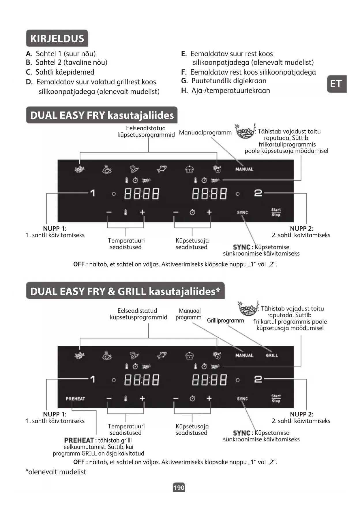 KIRJELDUS A. Sahtel 1 (suur nõu) B. Sahtel 2 (tavaline nõu) C. Sahtli käepidemed D. Eemaldatav suur valatud grillrest koos silikoonpatjadega (olenevalt mudelist) E. Eemaldatav suur rest koos silikoonpatjadega (olenevalt mudelist) F. Eemaldatav rest koos silikoonpatjadega G. Puutetundlik digiekraan H. Aja-/temperatuuriekraan DUAL EASY FRY kasutajaliides DUAL EASY FRY & GRILL kasutajaliides* OFF : näitab, et sahtel on väljas. Aktiveerimiseks klõpsake nuppu „1“ või „2“. OFF : näitab, et sahtel on väljas. Aktiveerimiseks klõpsake nuppu „1“ või „2“. : tähistab grilli eelkuumutamist. Süttib, kui programm GRILL on äsja käivitatud *olenevalt mudelist Eelseadistatud küpsetusprogrammid Eelseadistatud küpsetusprogrammid : Tähistab vajadust toitu raputada. Süttib friikartuliprogrammis poole küpsetusaja möödumisel : Tähistab vajadust toitu raputada. Süttib friikartuliprogrammis poole küpsetusaja möödumisel Manuaalprogramm Manuaal programm : Küpsetamise sünkroonimise käivitamiseks : Küpsetamise sünkroonimise käivitamiseks Temperatuuri seadistused Temperatuuri seadistused Küpsetusaja seadistused Küpsetusaja seadistused NUPP 1: