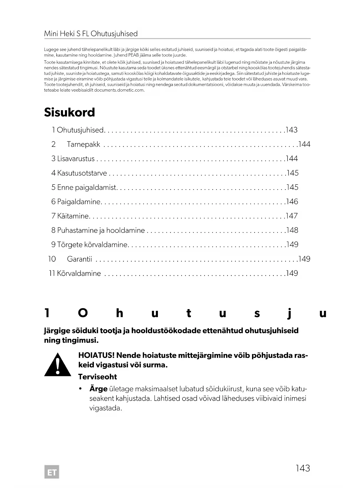 - Lugege see juhend tähelepanelikult läbi ja järgige kõiki selles esitatud juhiseid, suuniseid ja hoiatusi, et tagada alati toote õigesti paigalda- mine, kasutamine ning hooldamine. Juhend PEAB jääma selle toote juurde. Toote kasutamisega kinnitate, et olete kõik juhised, suunised ja hoiatused tähelepanelikult läbi lugenud ning mõistate ja nõustute järgima nendes sätestatud tingimusi. Nõustute kasutama seda toodet üksnes ettenähtud eesmärgil ja otstarbel ning kooskõlas tootejuhendis sätesta- tud juhiste, suuniste ja hoiatustega, samuti kooskõlas kõigi kohaldatavate õigusaktide ja eeskirjadega. Siin sätestatud juhiste ja hoiatuste luge- mise ja järgimise eiramine võib põhjustada vigastusi teile ja kolmandatele isikutele, kahjustada teie toodet või läheduses asuvat muud vara. Toote tootejuhendit, sh juhiseid, suuniseid ja hoiatusi ning nendega seotud dokumentatsiooni, võidakse muuta ja uuendada. Värskeima too- teteabe leiate veebisaidilt documents.dometic.com. Sisukord 1 Ohutusjuhised p. 143