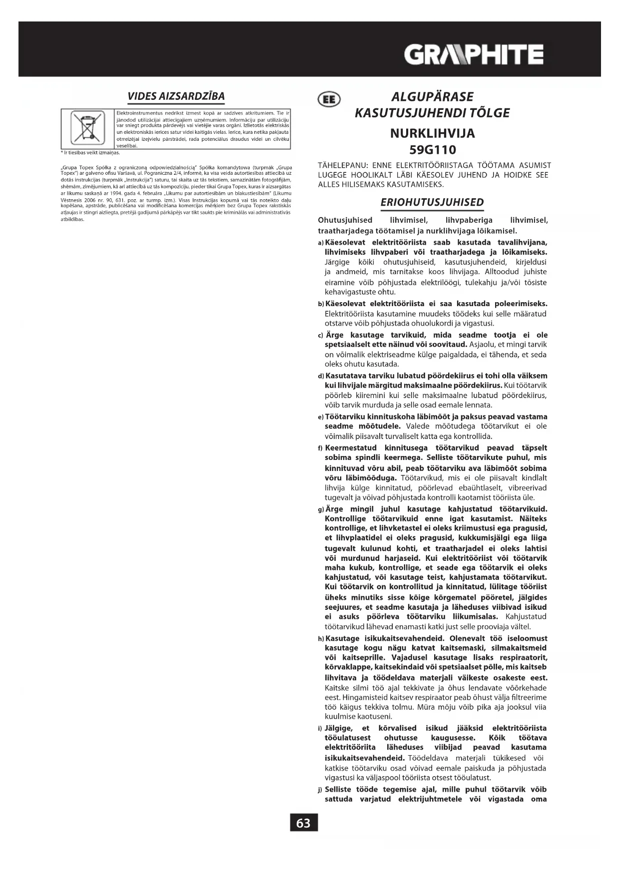 - Tootjal on õigus muudatusi sisse viia. „Grupa Topex Spółka z ograniczoną odpowiedzialnością” Spółka komandytowa asukohaga Varsasavi, ul. Pograniczna 2/4 (edaspidi: „Grupa Topex ”) informeerib, et kõik käesoleva juhendiga (edaspidi: juhend), muuhulgas selle teksti, fotode, skeemide, jooniste, samuti selle ülesehitusega seotud autoriõigused kuuluvad eranditult Grupa Topex’ile ja on kaitstud 4. veebruari 1994 autoriõiguste ja muude sarnaste õiguste seadusega (vt. Seaduste ajakiri 2006 Nr 90 Lk 631 koos hilisemate muudatustega). Kogu juhendi või selle osade kopeerimine, töötlemine ja moditseerimine kommertseesmärkidel ilma Grupa Topex’i kirjaliku loata on rangelt keelatud ning võib kaasa tuua tsiviilvastutuse ning karistuse.68 ПРЕВОД НА ОРИГИНАЛНАТА