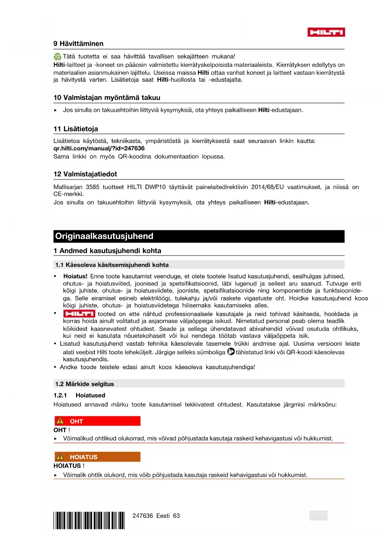 - Lisatud kasutusjuhend vastab tehnika käesolevale tasemele trükki andmise ajal. Uusima versiooni leiate alati veebist Hilti toote leheküljelt. Järgige selleks sümboliga tähistatud linki või QR-koodi käesolevas kasutusjuhendis.