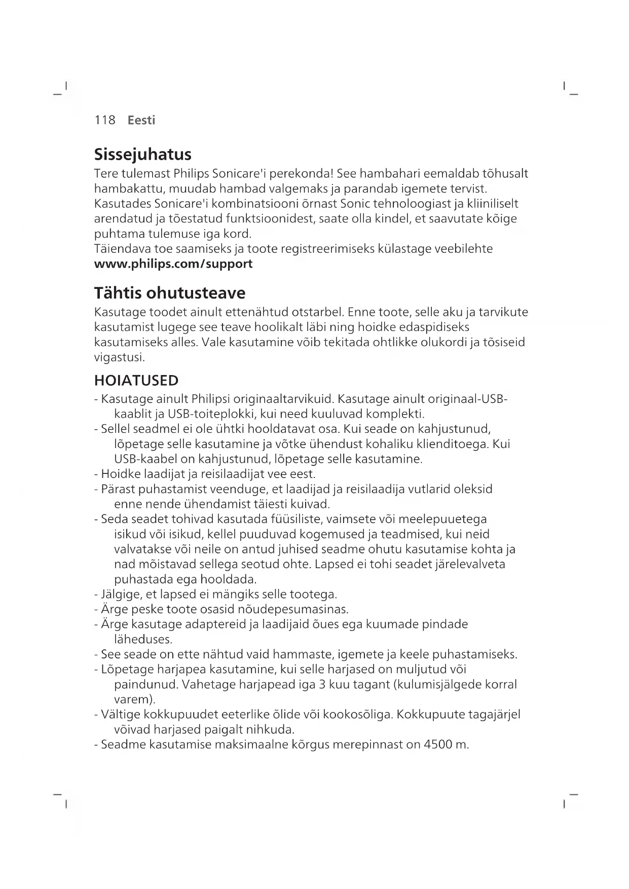Eesti Sissejuhatus Tere tulemast Philips Sonicare'i perekonda! See hambahari eemaldab tõhusalt hambakattu, muudab hambad valgemaks ja parandab igemete tervist. Kasutades Sonicare'i kombinatsiooni õrnast Sonic tehnoloogiast ja kliiniliselt arendatud ja tõestatud funktsioonidest, saate olla kindel, et saavutate kõige puhtama tulemuse iga kord. Täiendava toe saamiseks ja toote registreerimiseks külastage veebilehte www.philips.com/support Tähtis ohutusteave Kasutage toodet ainult ettenähtud otstarbel. Enne toote, selle aku ja tarvikute kasutamist lugege see teave hoolikalt läbi ning hoidke edaspidiseks kasutamiseks alles. Vale kasutamine võib tekitada ohtlikke olukordi ja tõsiseid vigastusi. HOIATUSED - Kasutage ainult Philipsi originaaltarvikuid. Kasutage ainult originaal-USB- kaablit ja USB-toiteplokki, kui need kuuluvad komplekti. - Sellel seadmel ei ole ühtki hooldatavat osa. Kui seade on kahjustunud, lõpetage selle kasutamine ja võtke ühendust kohaliku klienditoega. Kui USB-kaabel on kahjustunud, lõpetage selle kasutamine. - Hoidke laadijat ja reisilaadijat vee eest. - Pärast puhastamist veenduge, et laadijad ja reisilaadija vutlarid oleksid enne nende ühendamist täiesti kuivad. - Seda seadet tohivad kasutada füüsiliste, vaimsete või meelepuuetega isikud või isikud, kellel puuduvad kogemused ja teadmised, kui neid valvatakse või neile on antud juhised seadme ohutu kasutamise kohta ja nad mõistavad sellega seotud ohte. Lapsed ei tohi seadet järelevalveta puhastada ega hooldada. - Jälgige, et lapsed ei mängiks selle tootega. - Ärge peske toote osasid nõudepesumasinas. - Ärge kasutage adaptereid ja laadijaid õues ega kuumade pindade läheduses. - See seade on ette nähtud vaid hammaste, igemete ja keele puhastamiseks. - Lõpetage harjapea kasutamine, kui selle harjased on muljutud või paindunud. Vahetage harjapead iga 3 kuu tagant (kulumisjälgede korral varem). - Vältige kokkupuudet eeterlike õlide või kookosõliga. Kokkupuute tagajärjel võivad harjased paigalt nihkuda. - Seadme kasutamise maksimaalne kõrgus merepinnast on 4500m.119 Eesti MEDITSIINILISED HOIATUSED - Lõpetage seadme kasutamine ja pidage nõu hambaarsti/arstiga, kui pärast kasutamist esineb liigset veritsemist, kui veritsemine jätkub pärast 1. kasutusnädalat või kui tunnete ebamugavust või valu. - Kui teil on olnud viimase 2 kuu jooksul suuõõne või igemete operatsioon, pidage enne seadme kasutamist nõu hambaarstiga. - Kui kasutate südamestimulaatorit või muud implantaatseadet, võtke enne hambaharja kasutamist ühendust arsti või implantaadi tootjaga. - Kui teil on meditsiinilisi küsimusi, võtke enne seadme kasutamist ühendust oma arstiga. - See seade on personaalne hügieeniseade ega ole mõeldud üldiseks kasutamiseks hambaravikabinetis või -asutuses. AKU OHUTUSJUHISED - See seade sisaldab patareisid, mida saavad eemaldada ainult asjatundjad. - Kasutage toodet ainult ettenähtud otstarbel. Enne toote, selle patareide ja tarvikute kasutamist lugege see teave hoolikalt läbi ja hoidke edaspidiseks kasutamiseks alles. Vale kasutamine võib tekitada ohtlikke olukordi ja tõsiseid vigastusi. Kaasasolevad tarvikud võivad erinevatel toodetel olla erinevad. - Kasutage ainult Philipsi originaaltarvikuid. - Hoidke toode ja akud eemal tulest ja ärge jätke neid otsese päikesevalguse või kõrge temperatuuri kätte. - Kui toode läheb ebatavaliselt kuumaks või eritab ebatavalist lõhna, muudab värvi või kui laadimine võtab tavapärasest kauem aega, lõpetage toote kasutamine ja laadimine ning võtke ühendust Philipsiga. - Ärge pange tooteid ja nende akusid mikrolaineahju või induktsioonpliitidele. - Akude kuumenemise või mürgiste või ohtlike ainete vabanemise vältimiseks ärge toodet ega akusid avage, muutke, augustage, kahjustage ega võtke osadeks lahti. Ärge akusid lühistage, üle laadige ega laadige pööratud polaarsusega. - See seade sisaldab akut, mida ei saa vahetada. Kui aku eluiga hakkab lõppema, tuleb seade nõuetekohaselt kasutusest kõrvaldada, vt jaotist Ringlussevõtt. - Laadige ainult Philipsi HX6110, HYTCxx või heakskiidetud ohutute adapteritega, mille sisendnimiandmed on järgmised: 4,75–5,25 alalisvool, 1,5W. - Laadige ja kasutage toodet temperatuuril vahemikus 0°C ja 40°C.120 Eesti - Juhusliku lühisesse sattumise vältimiseks pärast akude eemaldamist ärge laske akuklemmidel kokku puutuda metallobjektidega (nt mündid, juuksenõelad, sõrmused). Ärge mähkige patareisid alumiiniumfooliumisse. Enne äraviskamist katke patareide klemmid teibiga või pange patareid kilekotti. - See seade sisaldab laetavat liitiumioonakut. TULEB NÕUDEID JÄRGIDES RINGLUSSE VÕTTA VÕI KASUTUSEST KÕRVALDADA. Säilitamis- ja transportimistingimused Temperatuur –20 kuni +60°C. Elektromagnetväljad (EMF) See Philipsi seade vastab kõikidele kokkupuudet elektromagnetiliste väljadega käsitlevatele kohaldatavatele standarditele ja õigusnormidele. Raadiosideseadmete direktiiv Philips kinnitab käesolevaga, et raadiosagedusliku seadmega (Bluetooth, NFC) elektrilised hambaharjad on vastavuses direktiiviga 2014/53/EL. - Bluetoothi raadiosageduslik liides töötab toodetes, kus seda kasutatakse, sagedusel 2,4GHz. - Bluetooth-seadme maksimaalne väljundvõimsus on 3 dBm. - NFC raadiosageduslik liides töötab toodetes, kus seda kasutatakse, sagedusel 13,56MHz. - Seadme maksimaalne edastatav raadiosageduslik võimsus on 30,16dBm. ELi vastavusdeklaratsiooni täistekst on saadaval järgmise aadressil: www.philips.com/support Märkus. Funktsioonid võivad olenevalt mudelist erineda. Mõni mudel ei pruugi olla varustatud Bluetoothi või NFC-ga.