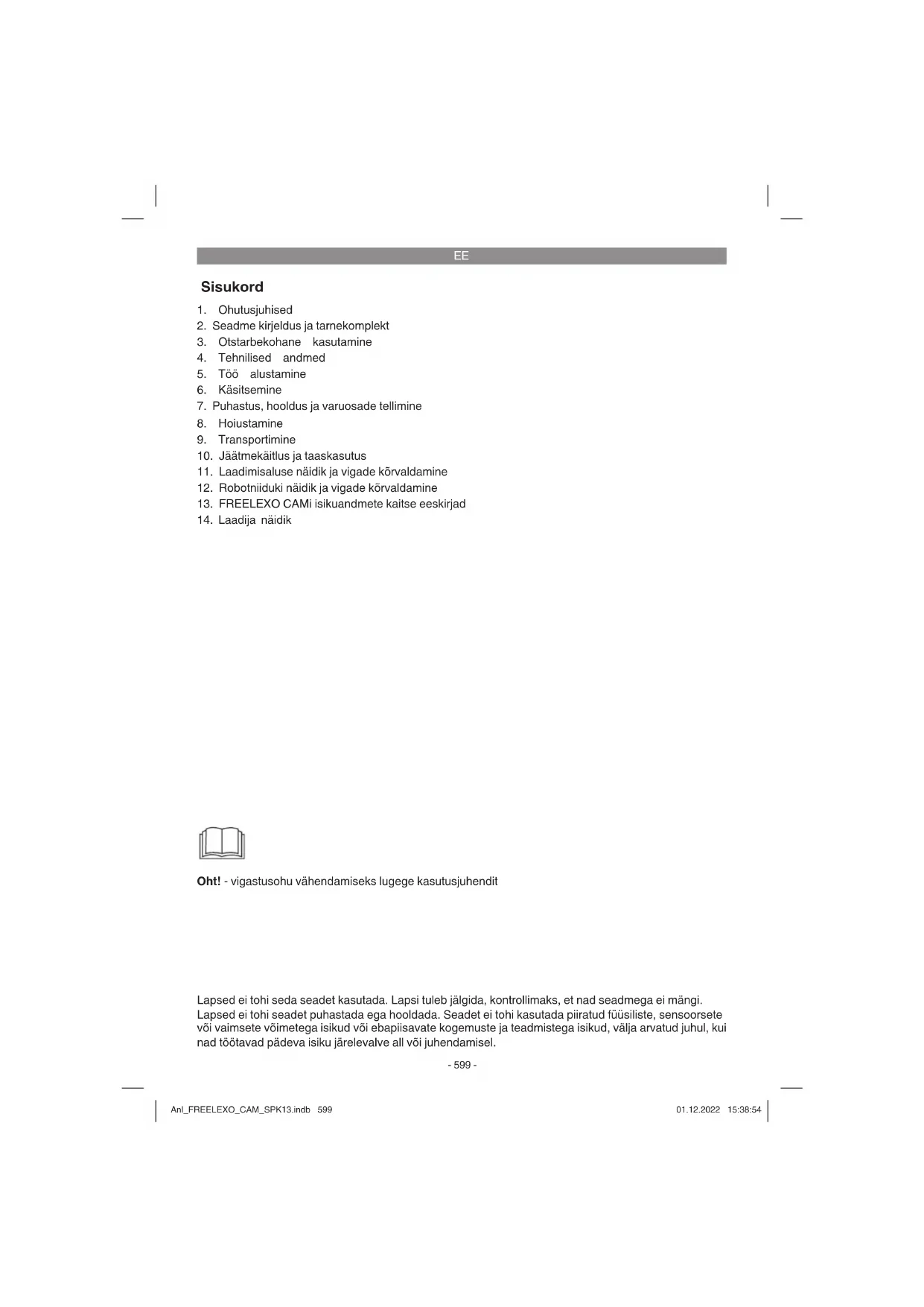 Oht! - vigastusohu vähendamiseks lugege kasutusjuhendit Lapsed ei tohi seda seadet kasutada. Lapsi tuleb jälgida, kontrollimaks, et nad seadmega ei mängi. Lapsed ei tohi seadet puhastada ega hooldada. Seadet ei tohi kasutada piiratud füüsiliste, sensoorsete või vaimsete võimetega isikud või ebapiisavate kogemuste ja teadmistega isikud, välja arvatud juhul, kui nad töötavad pädeva isiku järelevalve all või juhendamisel. Anl_FREELEXO_CAM_SPK13.indb 599Anl_FREELEXO_CAM_SPK13.indb 599 01.12.2022 15:38:5401.12.2022 15:38:54EE