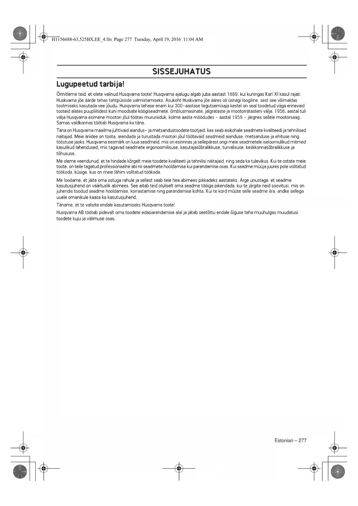 Ülejäänud seadmel toodud sümbolid/tähised vastavad erinevates riikides kehtivatele sertifitseerimisnõuetele. Mootori välja lülitamiseks tuleb seiskamislüliti viia asendisse "STOPP". TÄHELEPANU! Seiskamislüliti läheb ise lähteasendisse. Et vältida seadme tahtmatut käivitamist, tuleb monteerimistööde, remondi ja hoolduse ajaks võtta süüteküünlalt süütepea. Korrapärane puhastus vajalik. Visuaalne kontroll. Kütuse tankimine. Õhuklapi asend 'avatud'. Õhuklapi asend 'suletud'. H1156688-63,525BX,EE_4.fm Page 275 Tuesday, April 19, 2016 11:04 AMSISUKORD 276 – Estonian Sisukord Enne käivitamist tuleb meeles pidada järgmist: Loe käsitsemisõpetus hoolikalt läbi. Husqvarna AB töötab pidevalt oma toodete edasiarendamise alal ja jätab seetõttu endale õiguse teha muuhulgas muudatusi toodete kuju ja välimuse osas. Puhurseade on mõeldud üksnes muruplatside, teeradade, asfaltteede jms puhastamiseks.