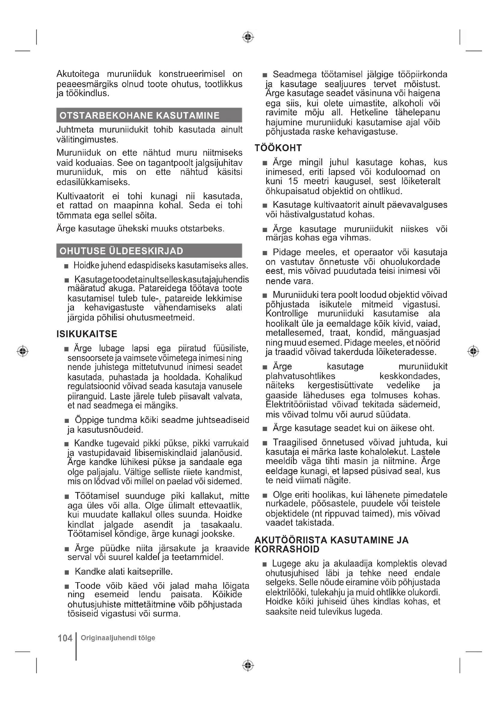 ■ Akutoitega seadmeid ei pea pingestamiseks vooluvõrgu pistikupessa ühendama – need on pinge all kogu aeg. Kui seadet ei kasutata, eemaldage sellelt lahklüliti võti. ■ Enne reguleerimist, hooldamist või lõigatavast materjalist puhastamist võtke akupakett välja. ■ Enne akupaketi sissepanekut võtke lülitusvõti välja. ■ Akupaketti tohib laadida ainult tootja poolt ettenähtud laadijaga. Akupaketiga mittesobiva laadija kasutamine võib põhjustada tuleohtu. Kasutage akupaketi laadimiseks ainult juhendis mainitud laadijat. ■ Kasutage ainult seda akupaketti, mis on sellele seadmele ette nähtud. Muude akupakettide kasutamise korral võib tekkida tulekahju, elektrilöögi või kehavigastuse oht. ■ Sel ajal kui akupakett ei ole kasutusel, hoidke seda eemal metallesemetest nagu kirjaklambrid, mündid, võtmed, naelad, kruvid ja muudest väikestest metallobjektidest, mis võivad akuklemmid lühistada. Akupaketi klemmide lühistamine võib põhjustada sädemeid, põletust, tulekahju või plahvatust. ■ Ärge jätke akusid või toiteelemente lahtise tule lähedusse või kuuma kohta. Selle juhise järgimine vähendab plahvatuse ja võimaliku kehavigastuse ohtu. ■ Ärge akupaketti avage ega osadeks lahutage. Vabanev elektrolüüt on korrodeeriv ja võib põhjustada silma- ja nahavigastusi. Allaneelamisel on see mürgine. ■ Kaitske akut niiskuse ja vee vastu. Ärge laadige akut niiskes või märjas kohas. Selle reegli järgimine vähendab elektrilöögi ohtu. ■ Aku vigastamise või ebaõige kasutamise korral võib eralduda gaase. Kaebuste korral minge värske õhu kätte ja kutsuge arstiabi. Gaasid võivad ärritada hingamissüsteemi. ■ Ärge jätke akupaketti sõidukisse kuuma või külma kätte. ■ Ärge püüdke akut põletamise teel hävitada. ■ Aku vale kasutamise korral võib akuvedelik välja voolata - vältige sellega kokkupuudet. Akuvedeliku nahale sattumisel peske see veega maha. Vedeliku silma sattumisel pöörduge viivitamatult arsti poole. Väljapritsiv akuvedelik võib tekitada nahaärritust või -põletust. MURUNIIDUKI OHUTUSEESKIRJAD
