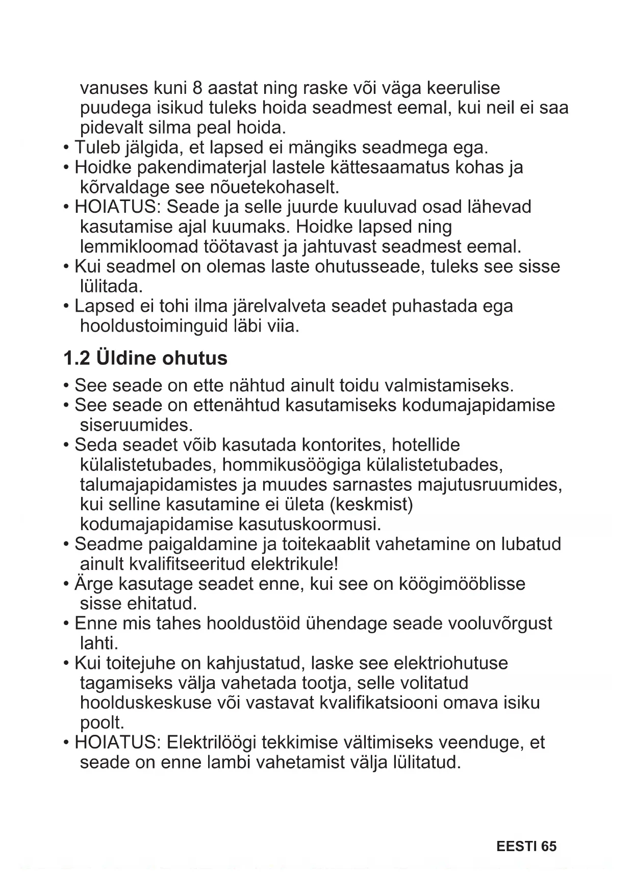 - Vähemalt 8-aastased ja vanemad lapsed ning piiratud füüsiliste, sensoorsete või vaimsete võimete või väheste kogemuste ja teadmistega isikud tohivad seda seadet kasutada järelevalve all või kui neid on õpetatud seadet ohutul viisil kasutama ja mõistma kaasnevaid ohte. Lapsed 64 EESTIvanuses kuni 8 aastat ning raske või väga keerulise puudega isikud tuleks hoida seadmest eemal, kui neil ei saa pidevalt silma peal hoida.