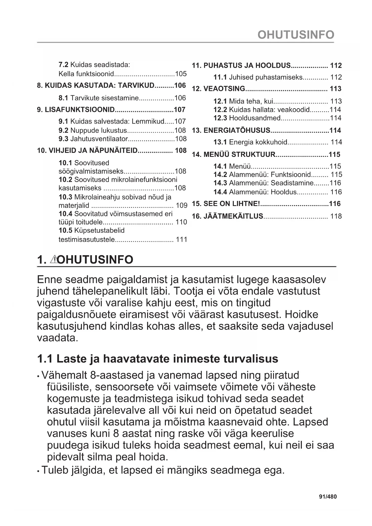 - Tuleb jälgida, et lapsed ei mängiks seadmega ega. 91/480 OHUTUSINFO• Hoidke pakendimaterjal lastele kättesaamatus kohas ja kõrvaldage see nõuetekohaselt.