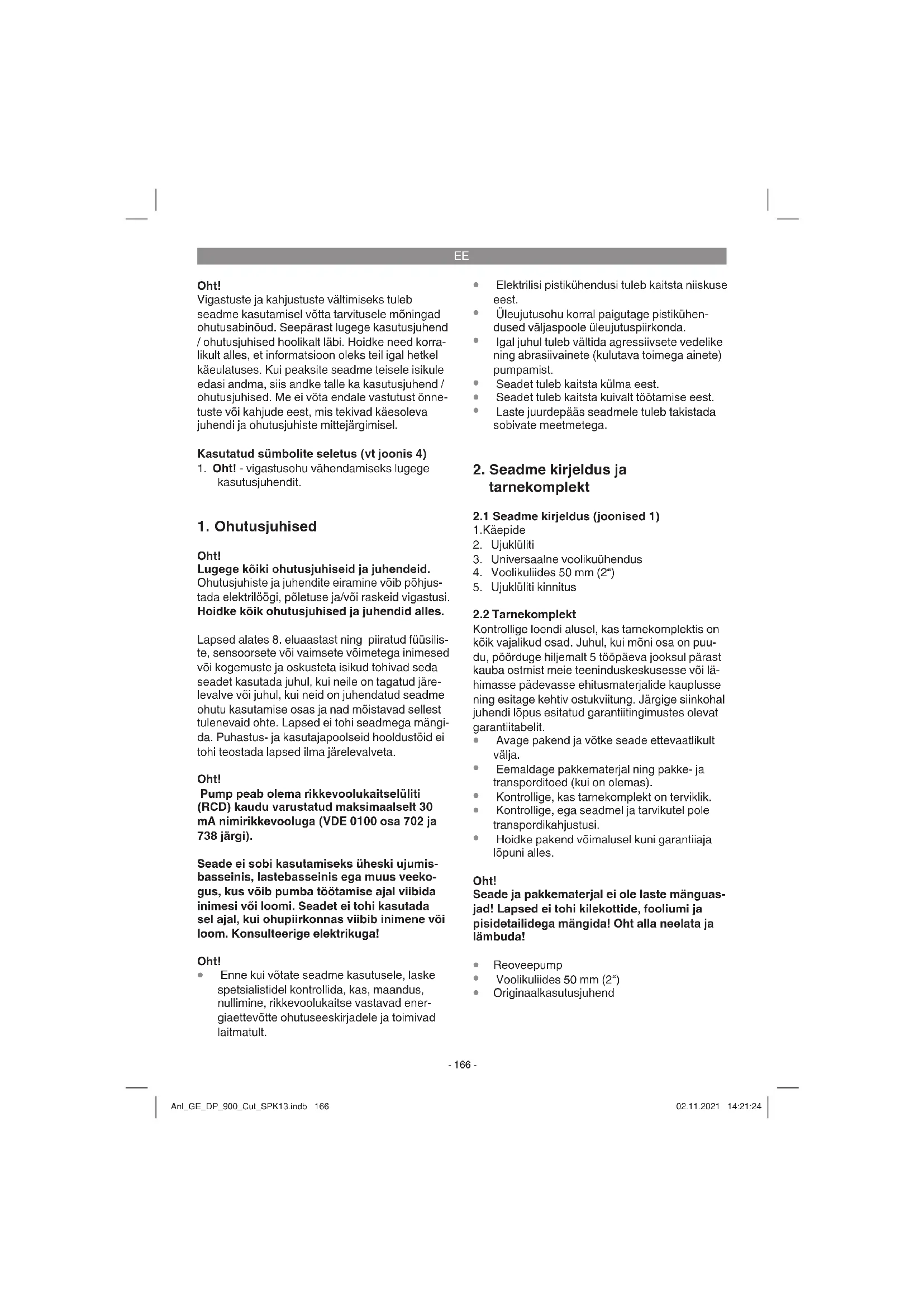 Oht! Lugege kõiki ohutusjuhiseid ja juhendeid. Ohutusjuhiste ja juhendite eiramine võib põhjus- tada elektrilöögi, põletuse ja/või raskeid vigastusi. Hoidke kõik ohutusjuhised ja juhendid alles. Lapsed alates 8. eluaastast ning piiratud füüsilis- te, sensoorsete või vaimsete võimetega inimesed või kogemuste ja oskusteta isikud tohivad seda seadet kasutada juhul, kui neile on tagatud järe- levalve või juhul, kui neid on juhendatud seadme ohutu kasutamise osas ja nad mõistavad sellest tulenevaid ohte. Lapsed ei tohi seadmega mängi- da. Puhastus- ja kasutajapoolseid hooldustöid ei tohi teostada lapsed ilma järelevalveta. Oht! Pump peab olema rikkevoolukaitselüliti (RCD) kaudu varustatud maksimaalselt 30 mA nimirikkevooluga (VDE 0100 osa 702 ja 738 järgi). Seade ei sobi kasutamiseks üheski ujumis- basseinis, lastebasseinis ega muus veeko- gus, kus võib pumba töötamise ajal viibida inimesi või loomi. Seadet ei tohi kasutada sel ajal, kui ohupiirkonnas viibib inimene või loom. Konsulteerige elektrikuga! Oht!