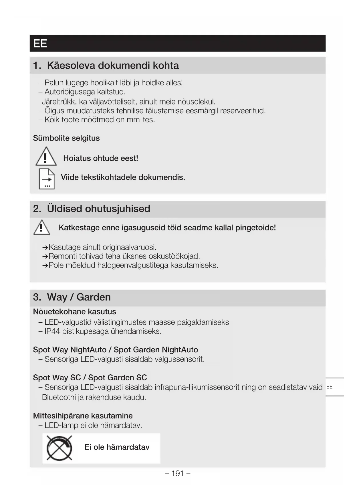 Nõuetekohane kasutus – LED-valgustid välistingimustes maasse paigaldamiseks – IP44 pistikupesaga ühendamiseks. Spot Way NightAuto / Spot Garden NightAuto – Sensoriga LED-valgusti sisaldab valgussensorit. Spot Way SC / Spot Garden SC – Sensoriga LED-valgusti sisaldab infrapuna-liikumissensorit ning on seadistatav vaid Bluetoothi ja rakenduse kaudu. Mittesihipärane kasutamine – LED-lamp ei ole hämardatav. Ei ole hämardatav EE– 192 – Spot Way tarnekomplekt (Joon. 3.1) – Valgusti koos samba, põhjaplaadi ja pistikuga ühenduskaabliga – 3 Kruvi – 3 Tüüblit Spot Garden tarnekomplekt (Joon. 3.2) – Valgusti koos pistikuga ühenduskaabliga – Varras maasse torkamiseks – Kaks kruvi Spot Way tootemõõtmed (Joon. 3.3) Spot Garden tootemõõtmed (Joon. 3.4) Toote ülevaade (Joon. 3.5 3.10) A Valgusti korpus B Liikumissensor (ainult Spot Way / Garden Sensor Connect) C Valgussensor (ainult Spot Way / Garden NightAuto) D Hämaruse seadmine (ainult Spot Way / Garden NightAuto) E Põhjaplaadiga sammas (ainult Spot Way) F Varras maasse torkamiseks (ainult Spot Garden) G Toitekaabel koos pistikuga Spot Way / Garden SC tuvastuspiirkond (Joon. 3.11 – 3.16) Valgustugevuse jaotus (Joon. 3.17)