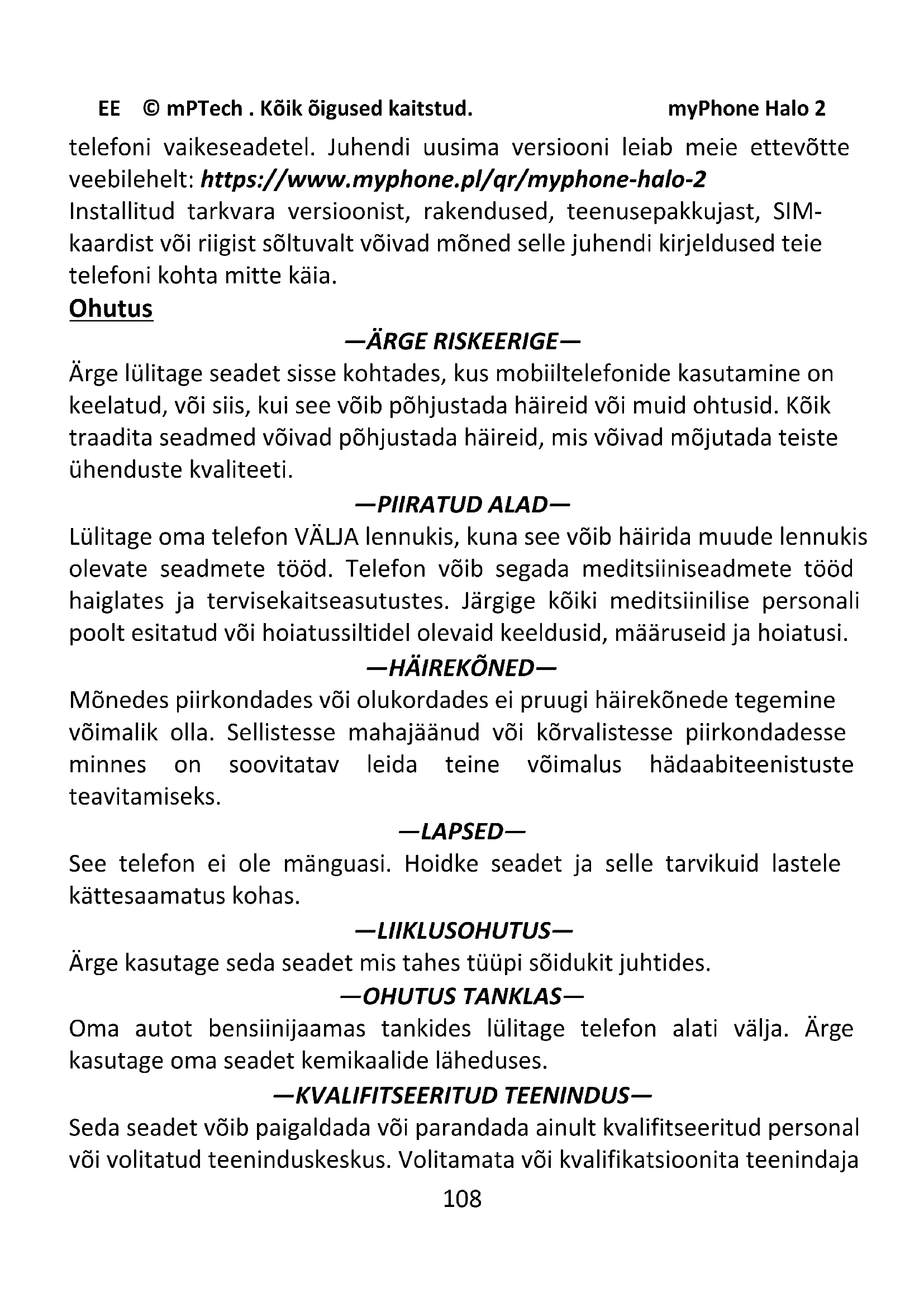 Mõnedes piirkondades või olukordades ei pruugi häirekõnede tegemine võimalik olla. Sellistesse mahajäänud või kõrvalistesse piirkondadesse minnes on soovitatav leida teine võimalus hädaabiteenistuste teavitamiseks. —LAPSED— See telefon ei ole mänguasi. Hoidke seadet ja selle tarvikuid lastele kättesaamatus kohas. —LIIKLUSOHUTUS— Ärge kasutage seda seadet mis tahes tüüpi sõidukit juhtides. —OHUTUS TANKLAS— Oma autot bensiinijaamas tankides lülitage telefon alati välja. Ärge kasutage oma seadet kemikaalide läheduses. —KVALIFITSEERITUD TEENINDUS— Seda seadet võib paigaldada või parandada ainult kvalifitseeritud personal või volitatud teeninduskeskus. Volitamata või kvalifikatsioonita teenindajaEE © mPTech . Kõik õigused kaitstud. myPhone Halo 2