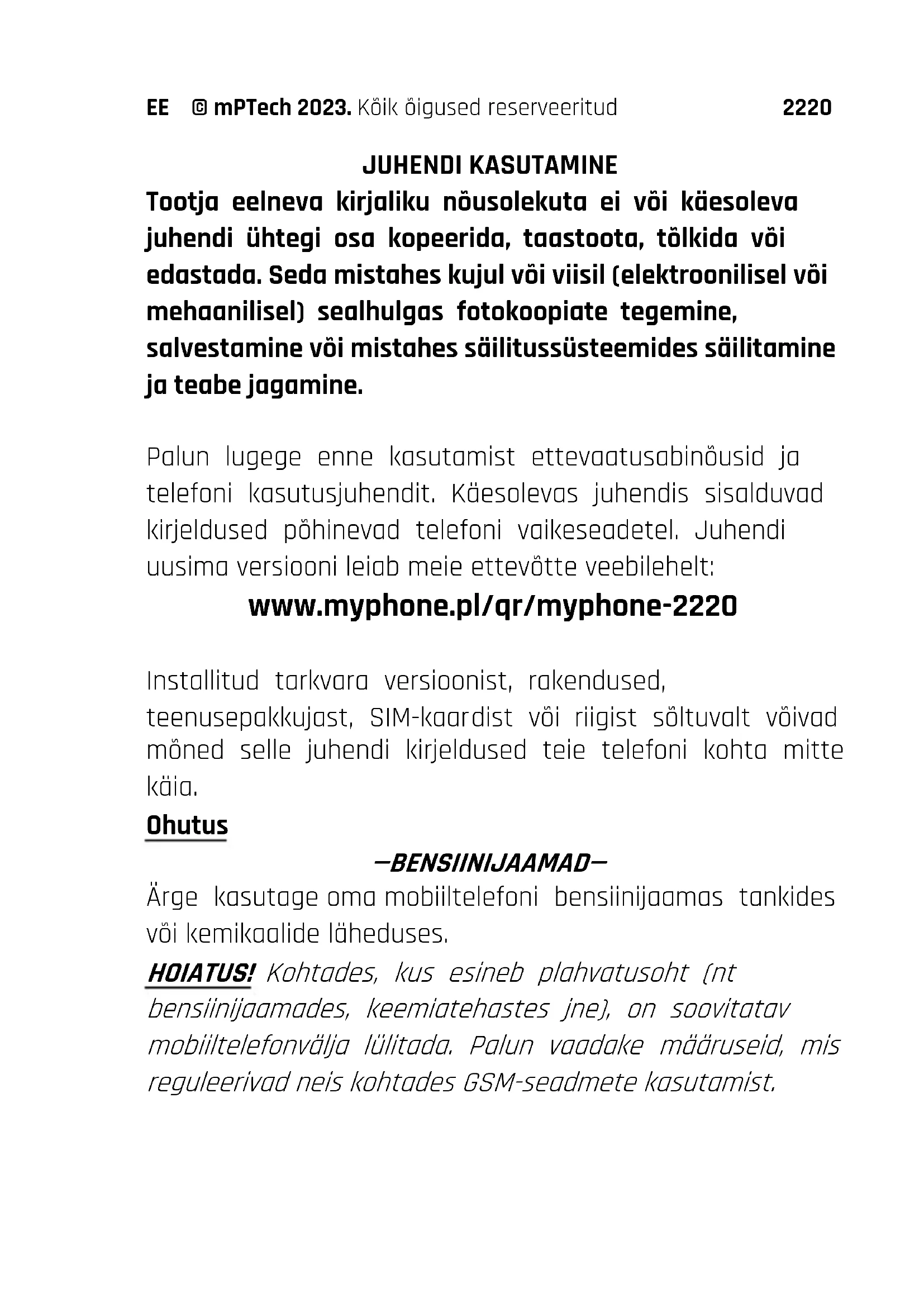 Vältige aku väga kõrgete/madalate temperatuuride kätte jätmist (alla 0°C/32°F ja üle 40°C/104°F). Äärmuslikud temperatuurid võivad mõjutada mahutavust ja aku tööiga. Vältige kokkupuudet vedelike ja metallist esemetega, kuna see võib põhjustada aku osalist või täielikku kahjustumist. Akut tuleks kasutada ainult vastavalt selle ettenähtud kasutusele. Ärge akut hävitage, kahjustage või leekidesse visake - see on ohtlik ja võib tekitada tulekahju. Kulunud või kahjustunud aku tuleks viia selleks ettenähtud konteinerisse. Aku liigne laadimine võib põhjustada kahjustusi. Seetõttu ei tohiks aku üks laadimine kesta kauem kui üks päev. Valet tüüpi aku paigaldamine võib põhjustada plahvatuse. Ärge kunagi akut avage. Palun kõrvaldage aku kasutusest vastavalt juhenditele. Ühendage kasutamata laadija vooluvõrgust lahti. Laadija juhtme kahjustumise korral ei tohiks seda parandada, vaid see tuleks asendada uuega. Kasutage ainult tootja originaaltarvikuid. —KUULMINE— Kuulmiskahjustuse vältimiseks ärge kasutage seadet pikka aega kõrge helitugevusega ja ärge pange töötavat seadet vahetult kõrva vastu. —NÄGEMINE—EE © mPTech 2023. Kõik õigused reserveeritud 2220 Nägemiskahjustuste vältimiseks ärge vaadake lähedalt dioodi selle töötamise ajal. Tugev valguskiir võib põhjustada silma jäädavat vigastamist! Tootja: mPTech Sp. z o. o. Nowogrodzka tänav 31 00-511 Varssavi, Poola www.myphone-mobile.com Toodetud Hiinas Pakendi sisu myPhone 2220 Enne telefoni kasutamise alustamist veenduge, et karbis sisalduvad kõik järgnevad esemed: