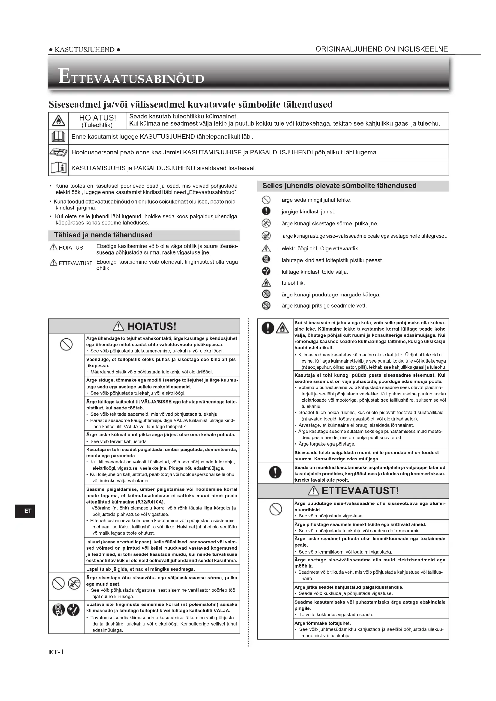 - Kuna tootes on kasutusel pöörlevad osad ja osad, mis võivad põhjustada elektrilööki, lugege enne kasutamist kindlasti läbi need „Ettevaatusabinõud“.• Kuna toodud ettevaatusabinõud on ohutuse seisukohast olulised, peate neid kindlasti järgima.• Kui olete selle juhendi läbi lugenud, hoidke seda koos paigaldusjuhendiga käepärases kohas seadme läheduses. Tähised ja nende tähendused HOIATUS!Ebaõige käsitsemine võib olla väga ohtlik ja suure tõenäo-susega põhjustada surma, raske vigastuse jne. ETTEVAATUST!Ebaõige käsitsemine võib olenevalt tingimustest olla väga ohtlik. Selles juhendis olevate sümbolite tähendused : ärge seda mingil juhul tehke. : järgige kindlasti juhist. : ärge kunagi sisestage sõrme, pulka jne. ärge kunagi astuge sise-/välisseadme peale ega asetage neile ühtegi eset. : elektrilöögi oht. Olge ettevaatlik. : lahutage kindlasti toitepistik pistikupesast. : lülitage kindlasti toide välja. : tuleohtlik. : ärge kunagi puudutage märgade kätega. : ärge kunagi pritsige seadmele vett. Siseseadmel ja/või välisseadmel kuvatavate sümbolite tähendused HOIATUS! (Tuleohtlik)Seade kasutab tuleohtlikku külmaainet.Kui külmaaine seadmest välja lekib ja puutub kokku tule või küttekehaga, tekitab see kahjulikku gaasi ja tuleohu.Enne kasutamist lugege KASUTUSJUHEND tähelepanelikult läbi.Hoolduspersonal peab enne kasutamist KASUTAMISJUHISE ja PAIGALDUSJUHENDI põhjalikult läbi lugema.KASUTAMISJUHIS ja PAIGALDUSJUHEND sisaldavad lisateavet. HOIATUS! Ärge ühendage toitejuhet vahekontakti, ärge kasutage pikendusjuhet ega ühendage mitut seadet ühte vahelduvvoolu pistikupessa.• See võib põhjustada ülekuumenemise, tulekahju või elektrilöögi.Veenduge, et toitepistik oleks puhas ja sisestage see kindlalt pis-tikupessa.• Määrdunud pistik võib põhjustada tulekahju või elektrilöögi.Ärge siduge, tõmmake ega modifi tseerige toitejuhet ja ärge kuumu-tage seda ega asetage sellele raskeid esemeid.• See võib põhjustada tulekahju või elektrilöögi.Ärge lülitage kaitselülitit VÄLJA/SISSE ega lahutage/ühendage toite-pistikut, kui seade töötab.• See võib tekitada sädemeid, mis võivad põhjustada tulekahju.• Pärast siseseadme kaugjuhtimispuldiga VÄLJA lülitamist lülitage kind-lasti kaitselüliti VÄLJA või lahutage toitepistik. Ärge laske külmal õhul pikka aega järjest otse oma kehale puhuda.• See võib tervist kahjustada.Kasutaja ei tohi seadet paigaldada, ümber paigutada, demonteerida, muuta ega parandada.• Kui kliimaseadet on valesti käsitsetud, võib see põhjustada tulekahju, elektrilöögi, vigastuse, veelekke jne. Pidage nõu edasimüüjaga.• Kui toitejuhe on kahjustatud, peab tootja või hoolduspersonal selle ohu vältimiseks välja vahetama.Seadme paigaldamise, ümber paigutamise või hooldamise korral peate tagama, et külmutusahelasse ei sattuks muud ainet peale ettenähtud külmaaine (R32/R410A).• Võõraine (nt õhk) olemasolu korral võib rõhk tõusta liiga kõrgeks ja põhjustada plahvatuse või vigastuse.• Ettenähtust erineva külmaaine kasutamine võib põhjustada süsteemis mehaanilise tõrke, talitlushäire või rikke. Halvimal juhul ei ole seetõttu võimalik tagada toote ohutust.Isikud (kaasa arvatud lapsed), kelle füüsilised, sensoorsed või vaim-sed võimed on piiratud või kellel puuduvad vastavad kogemused ja teadmised, ei tohi seadet kasutada muidu, kui nende turvalisuse eest vastutav isik ei ole neid eelnevalt juhendanud seadet kasutama.Lapsi tuleb jälgida, et nad ei mängiks seadmega. Ärge sisestage õhu sissevõtu- ega väljalaskeavasse sõrme, pulka ega muud eset.• See võib põhjustada vigastuse, sest sisemine ventilaator pöörleb töö ajal suure kiirusega. Ebatavaliste tingimuste esinemise korral (nt põlemislõhn) seisake kliimaseade ja lahutage toitepistik või lülitage kaitselüliti VÄLJA.• Tavatus seisundis kliimaseadme kasutamise jätkamine võib põhjusta-da talitlushäire, tulekahju või elektrilöögi. Konsulteerige sellisel juhul edasimüüjaga. Kui kliimaseade ei jahuta ega küta, võib selle põhjuseks olla külma-aine leke. Külmaaine lekke tuvastamise korral lülitage seade kohe välja, õhutage põhjalikult ruumi ja konsulteerige edasimüüjaga. Kui remondiga kaasneb seadme külmaainega täitmine, küsige üksikasju hooldustehnikult.• Kliimaseadmes kasutatav külmaaine ei ole kahjulik. Üldjuhul lekkeid ei esine. Kui aga külmaainet lekib ja see puutub kokku tule või küttekehaga (nt soojapuhur, õliradiaator, pliit), tekitab see kahjulikku gaasi ja tuleohu.Kasutaja ei tohi kunagi püüda pesta siseseadme sisemust. Kui seadme sisemust on vaja puhastada, pöörduge edasimüüja poole.• Sobimatu puhastusaine võib kahjustada seadme sees olevat plastma-terjali ja seeläbi põhjustada veelekke. Kui puhastusaine puutub kokku elektriosade või mootoriga, põhjustab see talitlushäire, suitsemise või tulekahju.• Seadet tuleb hoida ruumis, kus ei ole pidevalt töötavaid süüteallikaid (nt avatud leegid, töötav gaasipõleti või elektriradiaator).• Arvestage, et külmaaine ei pruugi sisaldada lõhnaainet.• Ärge kasutage seadme sulatamiseks ega puhastamiseks muid meeto-deid peale nende, mis on tootja poolt soovitatud.• Ärge torgake ega põletage.Siseseade tuleb paigaldada ruumi, mille põrandapind on toodust suurem. Konsulteerige edasimüüjaga.Seade on mõeldud kasutamiseks asjatundjatele ja väljaõppe läbinud kasutajatele poodides, kergtööstuses ja taludes ning kommertskasu-tuseks tavaisikute poolt. ETTEVAATUST! Ärge puudutage sise-/välisseadme õhu sissevõtuava ega alumii-niumribisid.• See võib põhjustada vigastuse.Ärge pihustage seadmele insektitsiide ega süttivaid aineid.• See võib põhjustada tulekahju või seadme deformeerumist.Ärge laske seadmel puhuda otse lemmikloomade ega toataimede peale.• See võib lemmikloomi või toataimi vigastada.Ärge asetage sise-/välisseadme alla muid elektriseadme