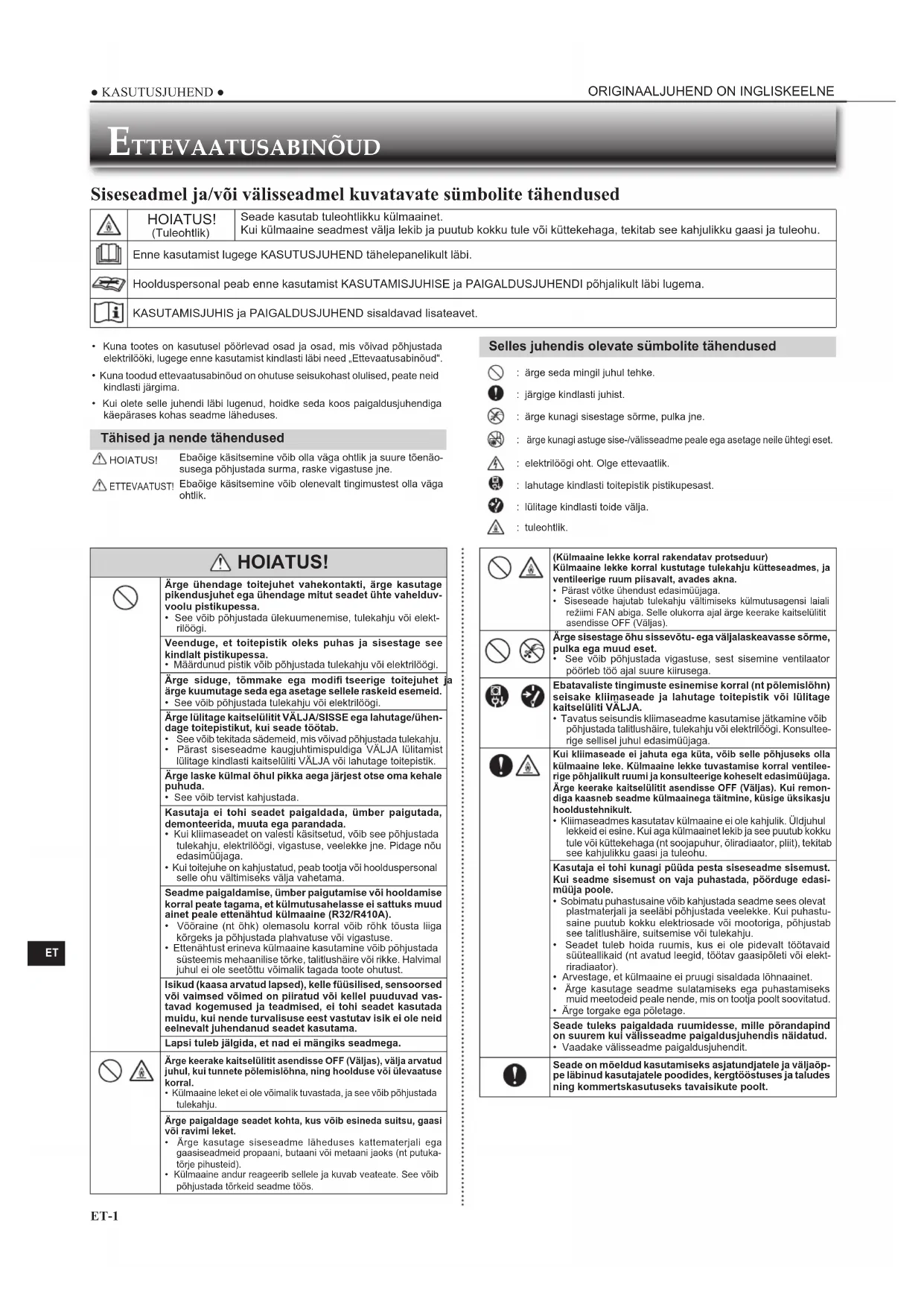 - Kuna tootes on kasutusel pöörlevad osad ja osad, mis võivad põhjustada elektrilööki, lugege enne kasutamist kindlasti läbi need „Ettevaatusabinõud“.• Kuna toodud ettevaatusabinõud on ohutuse seisukohast olulised, peate neid kindlasti järgima.• Kui olete selle juhendi läbi lugenud, hoidke seda koos paigaldusjuhendiga käepärases kohas seadme läheduses. Tähised ja nende tähendused HOIATUS!Ebaõige käsitsemine võib olla väga ohtlik ja suure tõenäo-susega põhjustada surma, raske vigastuse jne. ETTEVAATUST!Ebaõige käsitsemine võib olenevalt tingimustest olla väga ohtlik. Selles juhendis olevate sümbolite tähendused : ärge seda mingil juhul tehke. : järgige kindlasti juhist. : ärge kunagi sisestage sõrme, pulka jne. ärge kunagi astuge sise-/välisseadme peale ega asetage neile ühtegi eset. : elektrilöögi oht. Olge ettevaatlik. : lahutage kindlasti toitepistik pistikupesast. : lülitage kindlasti toide välja. : tuleohtlik. HOIATUS! Ärge ühendage toitejuhet vahekontakti, ärge kasutage pikendusjuhet ega ühendage mitut seadet ühte vahelduv-voolu pistikupessa.• See võib põhjustada ülekuumenemise, tulekahju või elekt-rilöögi.Veenduge, et toitepistik oleks puhas ja sisestage see kindlalt pistikupessa.• Määrdunud pistik võib põhjustada tulekahju või elektrilöögi.Ärge siduge, tõmmake ega modifi tseerige toitejuhet ja ärge kuumutage seda ega asetage sellele raskeid esemeid.• See võib põhjustada tulekahju või elektrilöögi.Ärge lülitage kaitselülitit VÄLJA/SISSE ega lahutage/ühen-dage toitepistikut, kui seade töötab. See võib tekitada sädemeid, mis võivad põhjustada tulekahju.• Pärast siseseadme kaugjuhtimispuldiga VÄLJA lülitamist lülitage kindlasti kaitselüliti VÄLJA või lahutage toitepistik. Ärge laske külmal õhul pikka aega järjest otse oma kehale puhuda.• See võib tervist kahjustada.Kasutaja ei tohi seadet paigaldada, ümber paigutada, demonteerida, muuta ega parandada.• Kui kliimaseadet on valesti käsitsetud, võib see põhjustada tulekahju, elektrilöögi, vigastuse, veelekke jne. Pidage nõu edasimüüjaga.• Kui toitejuhe on kahjustatud, peab tootja või hoolduspersonal selle ohu vältimiseks välja vahetama.Seadme paigaldamise, ümber paigutamise või hooldamise korral peate tagama, et külmutusahelasse ei sattuks muud ainet peale ettenähtud külmaaine (R32/R410A).• Võõraine (nt õhk) olemasolu korral võib rõhk tõusta liiga kõrgeks ja põhjustada plahvatuse või vigastuse.• Ettenähtust erineva külmaaine kasutamine võib põhjustada süsteemis mehaanilise tõrke, talitlushäire või rikke. Halvimal juhul ei ole seetõttu võimalik tagada toote ohutust.Isikud (kaasa arvatud lapsed), kelle füüsilised, sensoorsed või vaimsed võimed on piiratud või kellel puuduvad vas-tavad kogemused ja teadmised, ei tohi seadet kasutada muidu, kui nende turvalisuse eest vastutav isik ei ole neid eelnevalt juhendanud seadet kasutama.Lapsi tuleb jälgida, et nad ei mängiks seadmega. Ärge keerake kaitselülitit asendisse OFF (Väljas), välja arvatud juhul, kui tunnete põlemislõhna, ning hoolduse või ülevaatuse korral.• Külmaaine leket ei ole võimalik tuvastada, ja see võib põhjustada tulekahju.Ärge paigaldage seadet kohta, kus võib esineda suitsu, gaasi või ravimi leket.• Ärge kasutage siseseadme läheduses kattematerjali ega gaasiseadmeid propaani, butaani või metaani jaoks (nt putuka-tõrje pihusteid).• Külmaaine andur reageerib sellele ja kuvab veateate. See võib põhjustada tõrkeid seadme töös. (Külmaaine lekke korral rakendatav protseduur)Külmaaine lekke korral kustutage tulekahju kütteseadmes, ja ventileerige ruum piisavalt, avades akna.• Pärast võtke ühendust edasimüüjaga.• Siseseade hajutab tulekahju vältimiseks külmutusagensi laiali režiimi FAN abiga. Selle olukorra ajal ärge keerake kaitselülitit asendisse OFF (Väljas). Ärge sisestage õhu sissevõtu- ega väljalaskeavasse sõrme, pulka ega muud eset.• See võib põhjustada vigastuse, sest sisemine ventilaator pöörleb töö ajal suure kiirusega. Ebatavaliste tingimuste esinemise korral (nt põlemislõhn) seisake kliimaseade ja lahutage toitepistik või lülitage kaitselüliti VÄLJA.• Tavatus seisundis kliimaseadme kasutamise jätkamine võib põhjustada talitlushäire, tulekahju või elektrilöögi. Konsultee-rige sellisel juhul edasimüüjaga. Kui kliimaseade ei jahuta ega küta, võib selle põhjuseks olla külmaaine leke. Külmaaine lekke tuvastamise korral ventilee-rige põhjalikult ruumi ja konsulteerige koheselt edasimüüjaga. Ärge keerake kaitselülitit asendisse OFF (Väljas). Kui remon-diga kaasneb seadme külmaainega täitmine, küsige üksikasju hooldustehnikult.• Kliimaseadmes kasutatav külmaaine ei ole kahjulik. Üldjuhul lekkeid ei esine. Kui aga külmaainet lekib ja see puutub kokku tule või küttekehaga (nt soojapuhur, õliradiaator, pliit), tekitab see kahjulikku gaasi ja tuleohu.Kasutaja ei tohi kunagi püüda pesta siseseadme sisemust. Kui seadme sisemust on vaja puhastada, pöörduge edasi-müüja poole.• Sobimatu puhastusaine võib kahjustada seadme sees olevat plastmaterjali ja seeläbi põhjustada veelekke. Kui puhastu-saine puutub kokku elektriosade või mootoriga, põhjustab see talitlushäire, suitsemise või tulekahju.• Seadet tuleb hoida ruumis, kus ei ole pidevalt töötavaid süüteallikaid (nt avatud leegid, töötav gaasipõleti või elekt-riradiaator).• Arvestage, et külmaaine ei pruugi sisaldada lõhnaainet.• Ärge kasutage seadme sulatamiseks ega puhastamiseks muid meetodeid peale nende, mis on tootja poolt soovitatud.• Ärge torgake ega põletage.Seade tuleks paigaldada ruumidesse, mille põrandapind on suurem kui välisseadme paigaldusjuhendis näidatud.• Vaadake välisseadme paigaldusjuhendit.Seade on mõeldud kasutamiseks asjatundjatele ja väljaõp-pe läbinud kasutajatele poodides, kergtööstuses ja taludes ning kommertska
