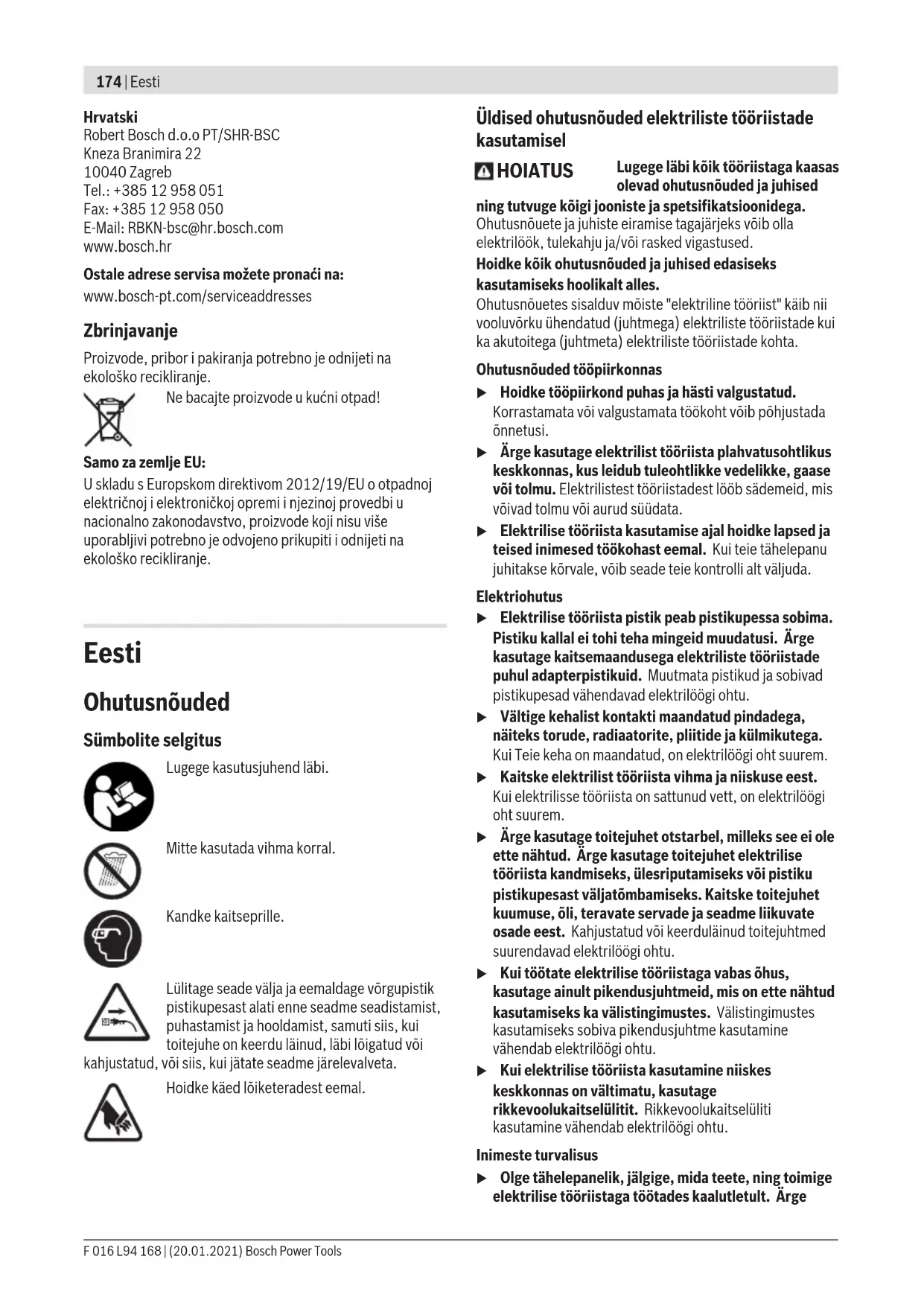 Rukovanje u Vodite računa o mrežnom naponu! Napon strujnog izvora mora se podudarati s informacijama na označnoj pločici uređaja. Uključivanje/isključivanje (vidi slike C i D) Radi uključivanja najprije pritisnite uklopni zapor (3) i držite ga pritisnutog. Zatim pritisnite sklopku za uključivanje/ isključivanje (2) i držite je pritisnutom. F 016 L94 168 | (20.01.2021) Bosch Power ToolsHrvatski | 173 Radi isključivanja pustite uklopni zapor (3), a zatim sklopku za uključivanje/isključivanje (2). Funkcija piljenja Iako otvor zuba dopušta rezanje grana do Ø20mm, vrh nosača noža konstruiran je za rezanje do Ø25mm. Rad sa škarama za živicu (vidi sliku E) Jednoliko pomičite škare za živicu naprijed po reznoj liniji. Dvostrani nosač noža omogućava rezanje u oba smjera ili njišućim pokretima s jedne na drugu stranu. Najprije orežite strane živice, a zatim gornji rub. Kako bi se dobile ravne strane, preporučujemo rezanje odozdo prema gore u smjeru rasta. U slučaju rezanja odozgo prema dolje tanje grane pomicale bi se prema van, čime mogu nastati prorijeđena mjesta ili rupe. Kako bi se na kraju jednoliko orezao gornji rub, napnite uzicu po čitavoj duljini živice na potrebnoj visini. Vodite računa o tome da se ne prerežu predmeti kao što su npr. žice. Noževi ili pogon mogu se oštetiti. Otklanjanje pogrešaka Simptom Mogući uzrok Rješenje Škare za živicu ne rade Ne postoji mrežni napon Provjerite i uključite Mrežna utičnica je neispravna Uporabite drugu utičnicu Mrežni kabel je oštećen Provjerite mrežni kabel i u slučaju oštećenja obratite se servisnoj službi Produžni kabel je oštećen Provjerite produžni kabel i zamijenite ga ako je oštećen Osigurač se aktivirao Zamijenite osigurač Škare za živicu rade s prekidima Unutarnje ožičenje vrtnog uređaja je neispravno Obratite se servisnoj službi Sklopka za uključivanje/isključivanje je neispravna Obratite se servisnoj službi Motor radi, ali noževi miruju Unutarnja pogreška Obratite se servisnoj službi Nož se grije Nož je tup Zatražite oštrenje nosača noža Nož ima ureze Zatražite provjeru nosača noža Preveliko trenje zbog nedovoljnog podmazivanja Poprskajte mazivim uljem Jake vibracije/buka Vrtni uređaj je neispravan Obratite se servisnoj službi Održavanje i servisiranje Održavanje, čišćenje i skladištenje u Prije svih radova na proizvodu izvucite mrežni utikač iz utičnice. u Održavajte proizvod čistim kako biste mogli dobro i sigurno raditi. Ne stavljajte druge predmete na vrtni uređaj. Održavajte proizvod i ventilacijske proreze čistima kako biste mogli dobro i sigurno raditi. Nikada ne prskajte proizvod vodom. Nikada ne uranjajte proizvod u vodu. Skladištite proizvod na sigurnom, suhom mjestu i izvan dosega djece. Ne stavljajte druge predmete na proizvod. Pobrinite se za to da su sve matice, svornjaci i vijci učvršćeni kako bi bilo moguće sigurno raditi proizvodom. Provjerite proizvod i radi sigurnosti zamijenite istrošene ili oštećene dijelove. Pobrinite se za to da je rezervne dijelove proizvela tvrtka Bosch. Servisna služba i savjeti o uporabi Naša servisna služba će odgovoriti na vaša pitanja o popravku i održavanju vašeg proizvoda, kao i o rezervnim dijelovima. Crteže u rastavljenom obliku i informacije o rezervnim dijelovima možete naći i na našoj adresi: www.bosch-pt.com Tim Bosch savjetnika o uporabi rado će odgovoriti na vaša pitanja o našim proizvodima i njihovom priboru. U slučaju upita ili naručivanja rezervnih dijelova, molimo vas obavezno navedite 10‑znamenkasti kataloški broj s tipske pločice proizvoda. Bosch Power Tools F 016 L94 168 | (20.01.2021)174 | Eesti Hrvatski Robert Bosch d.o.o PT/SHR-BSC Kneza Branimira 22 10040 Zagreb Tel.: +385 12 958 051 Fax: +385 12 958 050 E-Mail: RBKN-bsc@hr.bosch.com www.bosch.hr Ostale adrese servisa možete pronaći na: www.bosch-pt.com/serviceaddresses Zbrinjavanje Proizvode, pribor i pakiranja potrebno je odnijeti na ekološko recikliranje. Ne bacajte proizvode u kućni otpad! Samo za zemljeEU: U skladu s Europskom direktivom 2012/19/EU o otpadnoj električnoj i elektroničkoj opremi i njezinoj provedbi u nacionalno zakonodavstvo, proizvode koji nisu više uporabljivi potrebno je odvojeno prikupiti i odnijeti na ekološko recikliranje. Eesti Ohutusnõuded Sümbolite selgitus Lugege kasutusjuhend läbi. Mitte kasutada vihma korral. Kandke kaitseprille. Lülitage seade välja ja eemaldage võrgupistik pistikupesast alati enne seadme seadistamist, puhastamist ja hooldamist, samuti siis, kui toitejuhe on keerdu läinud, läbi lõigatud või kahjustatud, või siis, kui jätate seadme järelevalveta. Hoidke käed lõiketeradest eemal. Üldised ohutusnõuded elektriliste tööriistade kasutamisel HOIATUS Lugege läbi kõik tööriistaga kaasas olevad ohutusnõuded ja juhised ning tutvuge kõigi jooniste ja spetsifikatsioonidega. Ohutusnõuete ja juhiste eiramise tagajärjeks võib olla elektrilöök, tulekahju ja/või rasked vigastused. Hoidke kõik ohutusnõuded ja juhised edasiseks kasutamiseks hoolikalt alles. Ohutusnõuetes sisalduv mõiste "elektriline tööriist" käib nii vooluvõrku ühendatud (juhtmega) elektriliste tööriistade kui ka akutoitega (juhtmeta) elektriliste tööriistade kohta. Ohutusnõuded tööpiirkonnas u Hoidke tööpiirkond puhas ja hästi valgustatud. Korrastamata või valgustamata töökoht võib põhjustada õnnetusi. u Ärge kasutage elektrilist tööriista plahvatusohtlikus keskkonnas, kus leidub tuleohtlikke vedelikke, gaase või tolmu. Elektrilistest tööriistadest lööb sädemeid, mis võivad tolmu või aurud süüdata. u Elektrilise tööriista kasutamise ajal hoidke lapsed ja teised inimesed töökohast eemal. Kui teie tähelepanu juhitakse kõrvale, võib seade teie kontrolli alt väljuda. Elektriohutus u Elektrilise tööriista pistik peab pistikupessa sobima. Pistiku kallal ei tohi teha mingeid muudatusi. Ärge kasutage kaitsemaand